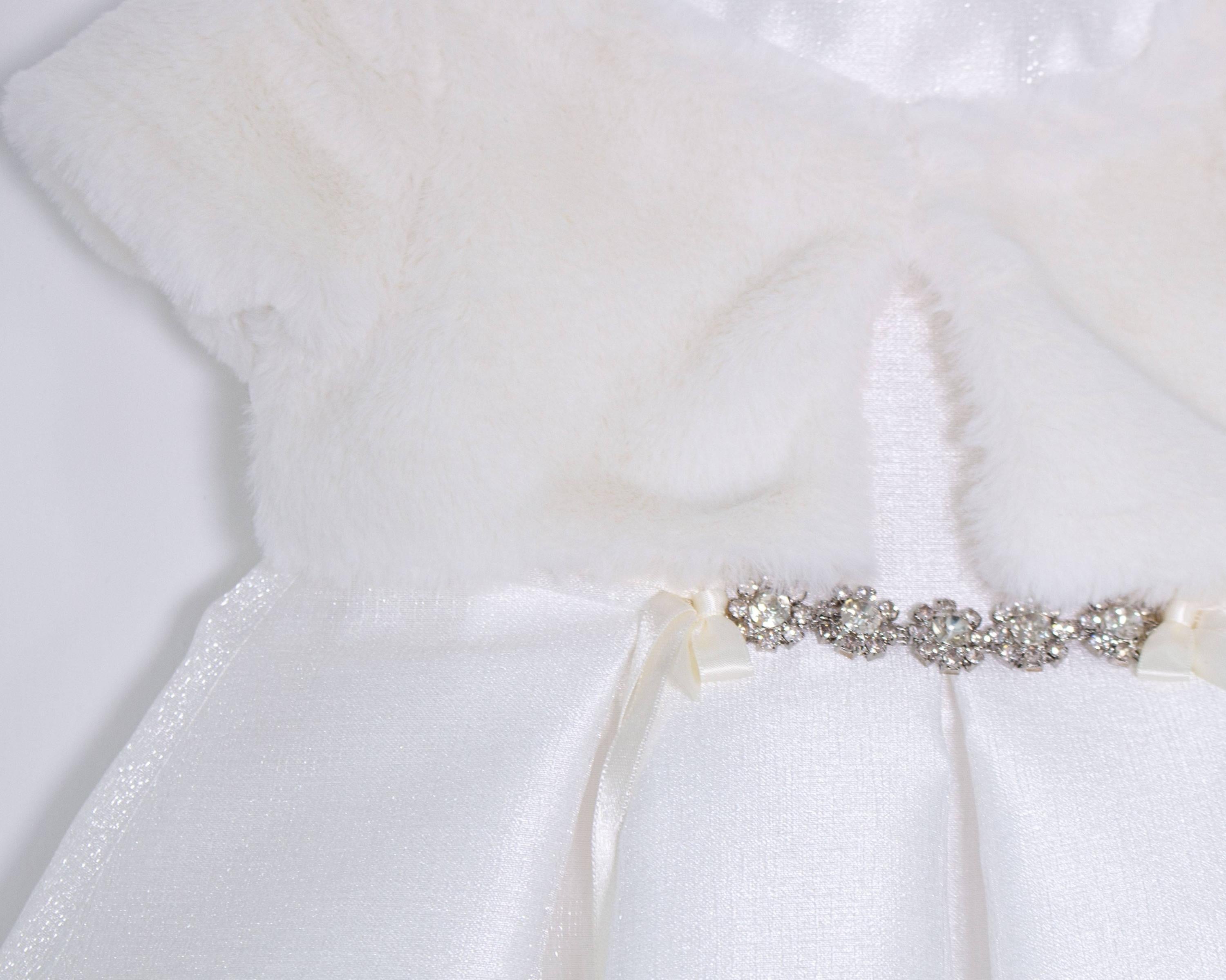 Elegantes Kleid für die Taufzeremonie aus Satin mit halben Ärmeln und Faltenküssen, Pelzmieder auf der Vorderseite, vollständig mit Baumwolle gefüttert, mit Tüllvolant, um das Kleid größer zu machen, Reißverschluss auf der Rückseite mit unsichtbarem Reißverschluss, auf der Vorderseite mit Strassrosen und Schleifen in Baby verziert Mädchen-Satin ALESSANDRO MARTINEZ AM1116