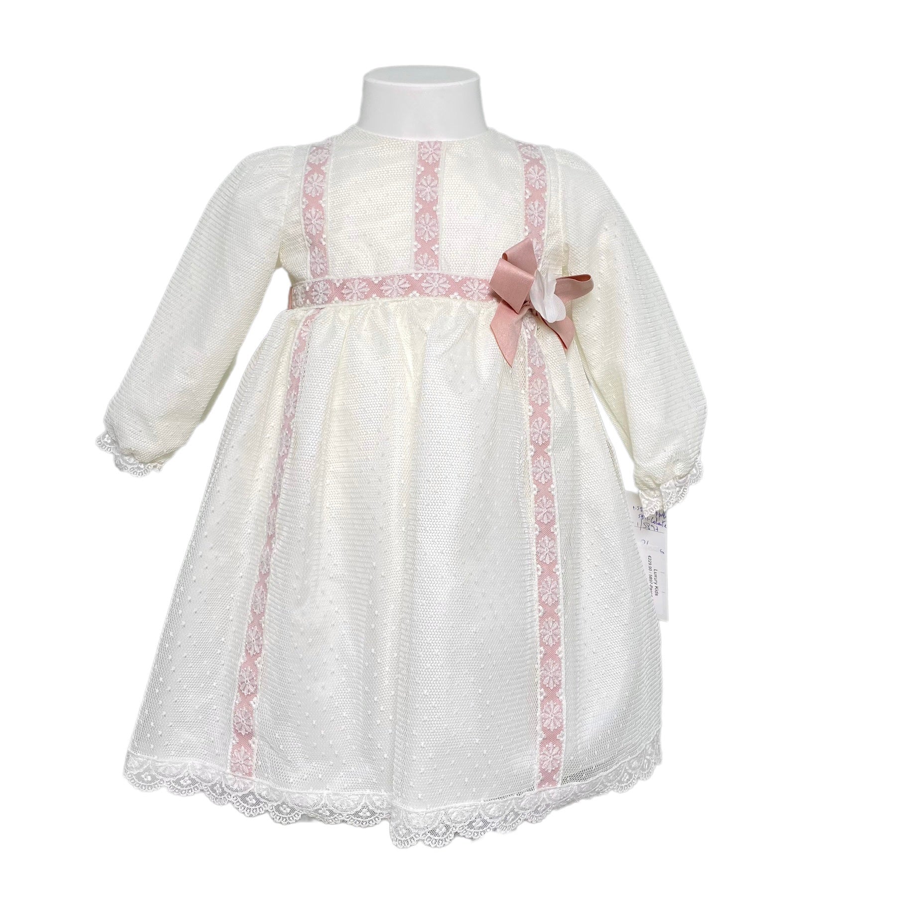 Langärmliges Taufkleid, bedeckt mit gepunktetem Tüll und Applikation von altrosa Bändern auf der Vorderseite mit seitlicher Schleife.