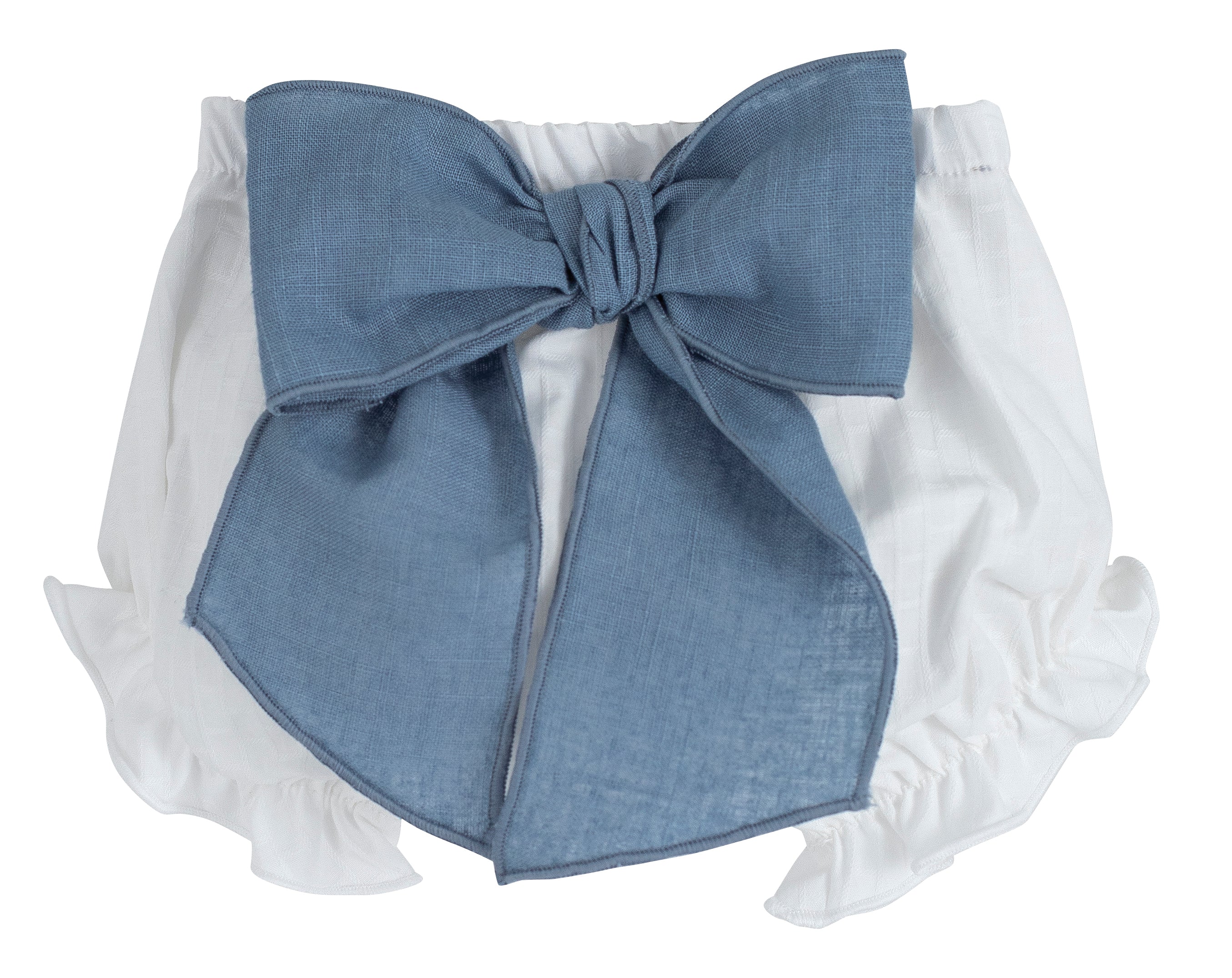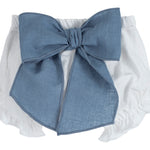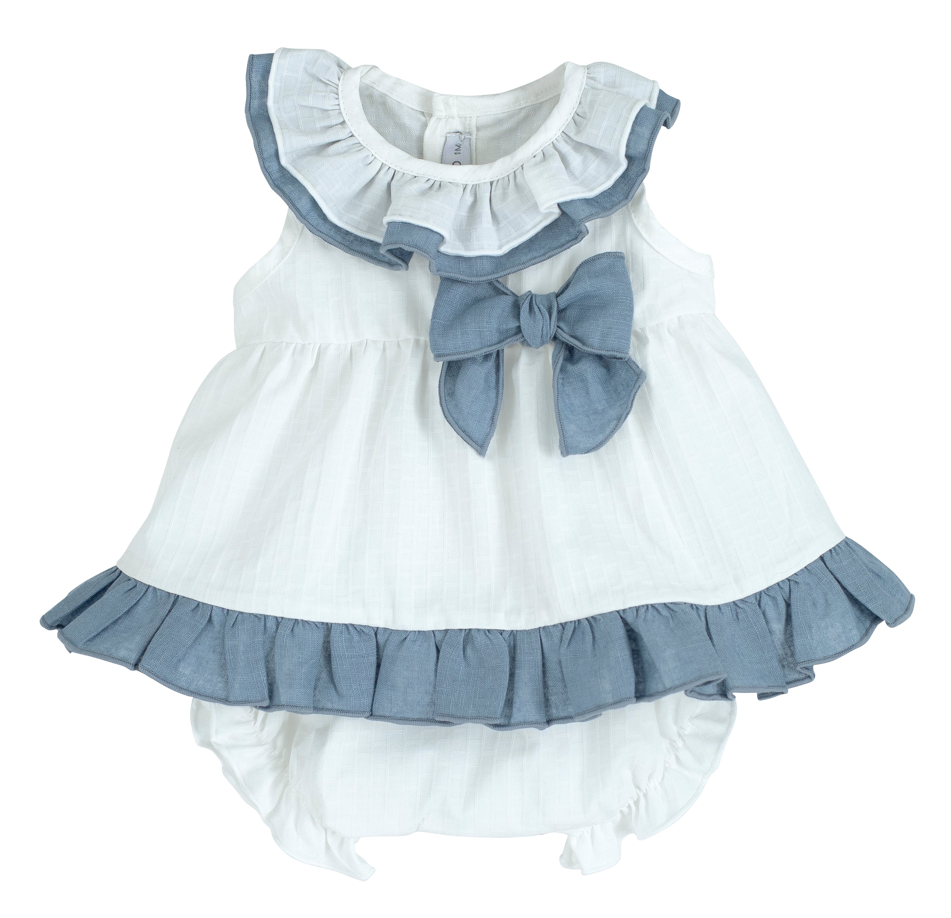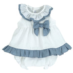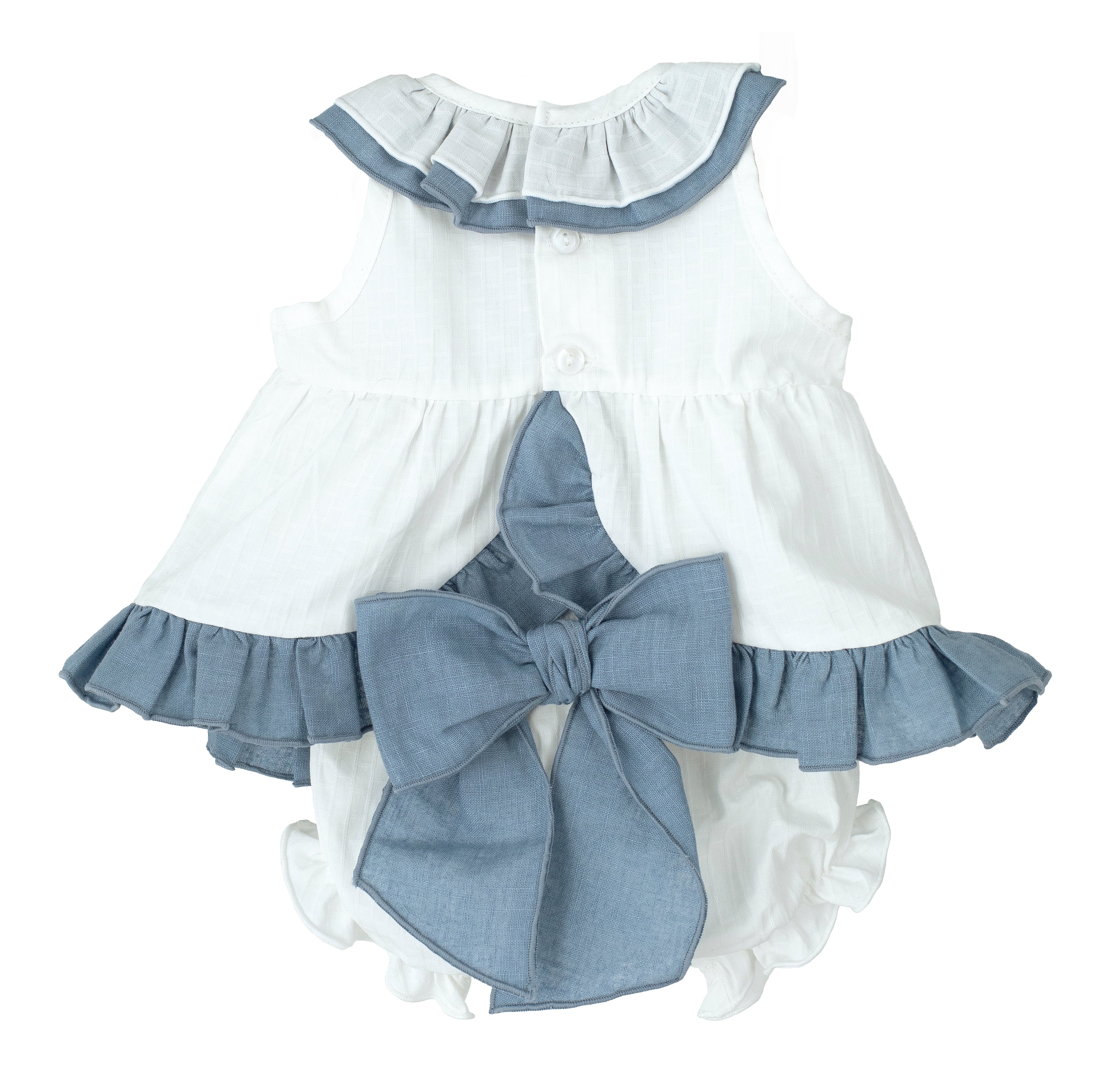 Questo abito smanicato in cotone neonata è perfetto per le sue occasioni . Con la sua base bianca e dettagli color denim, è un mix di eleganza e comodità. Il colletto con rouches e l'apertura sul retro aggiungono un tocco di stile, mentre la culotte bianca con fiocchettone color denim è adorabile e funzionale per i movimenti della neonata.