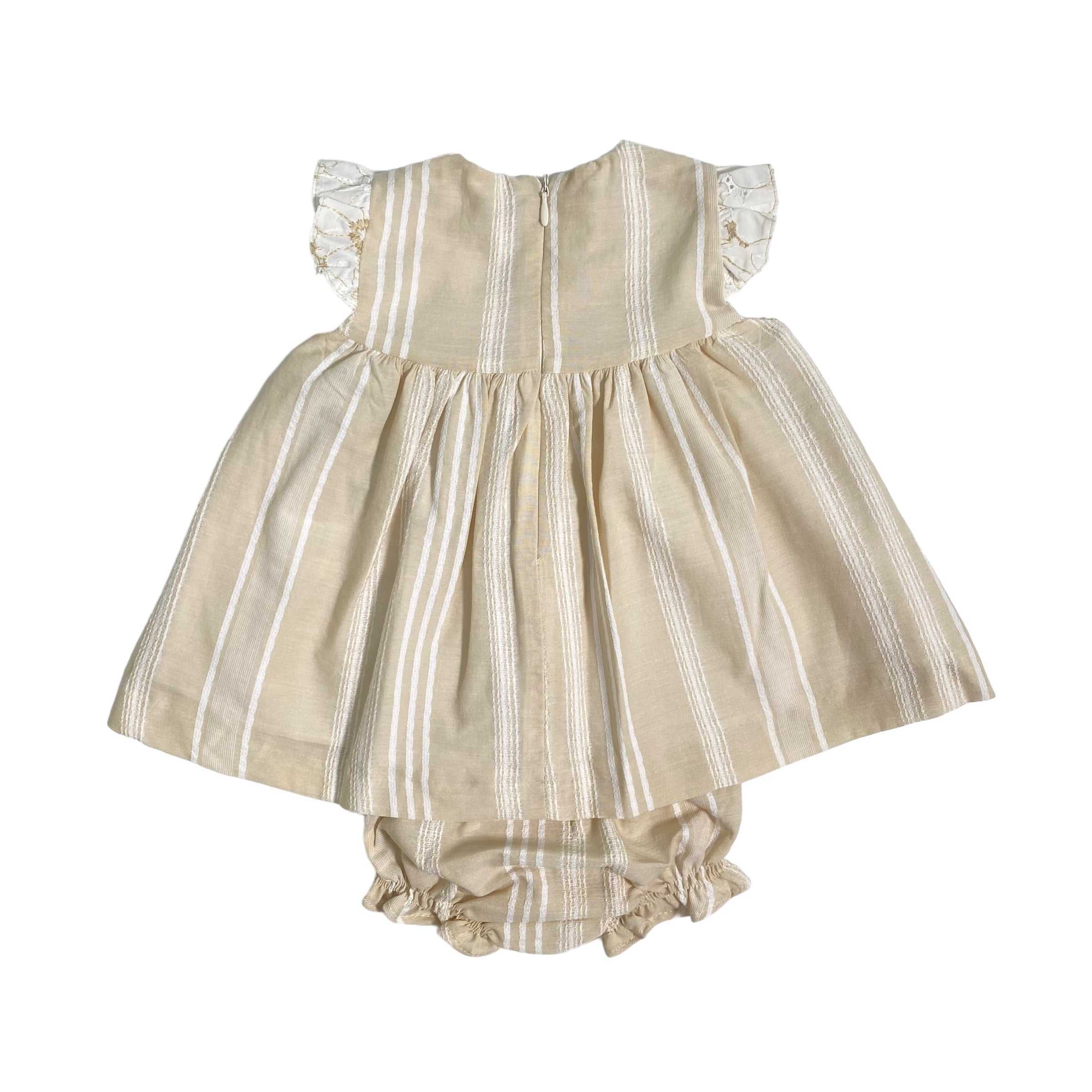 Questo abito con culotte in cotone per neonata è una scelta elegante e chic per ogni occasione. Il corpetto in pizzo San Gallo aggiunge un tocco di raffinatezza mentre le righe donano un look dinamico e alla moda. Comodo e chic, perfetto per la tua piccola fashionista.