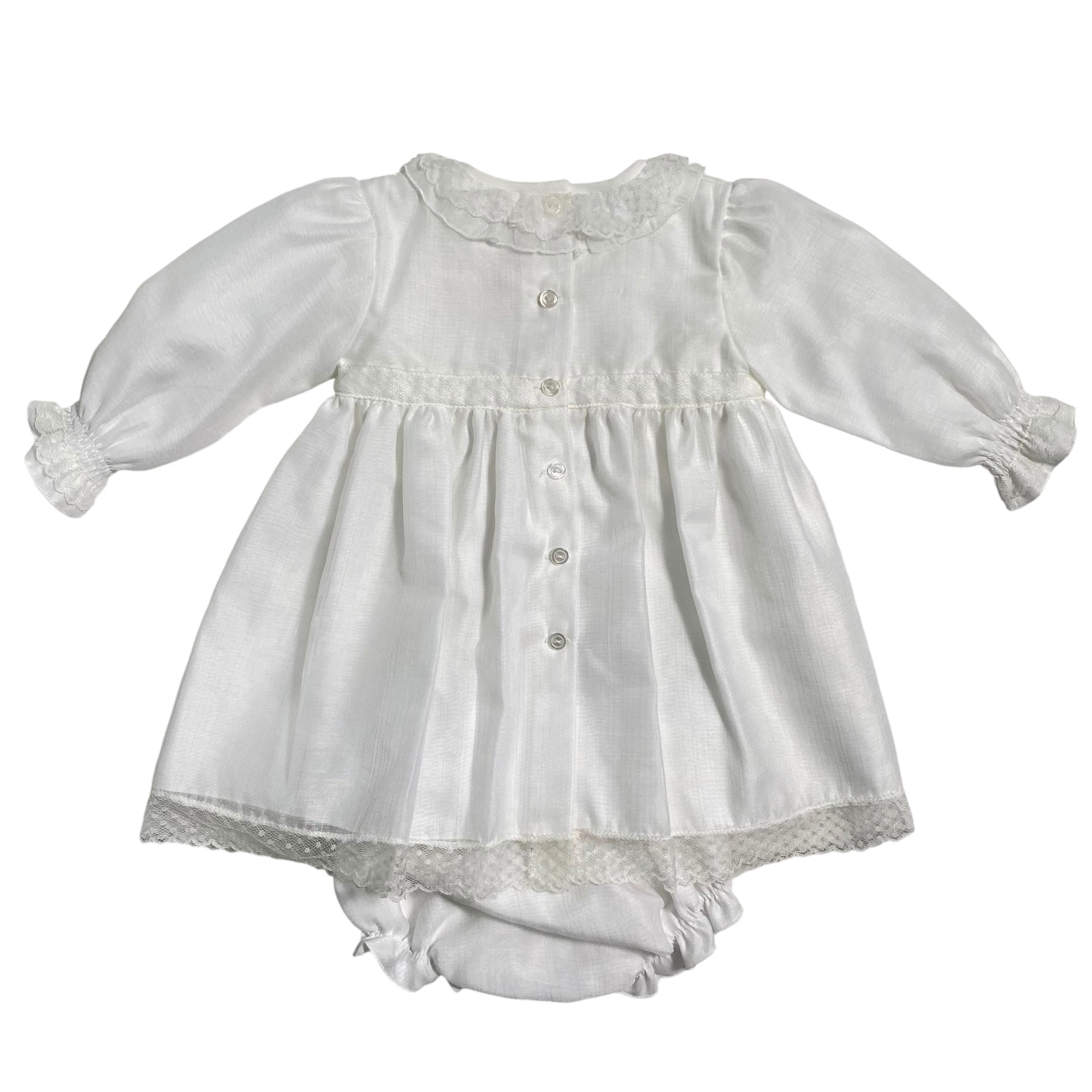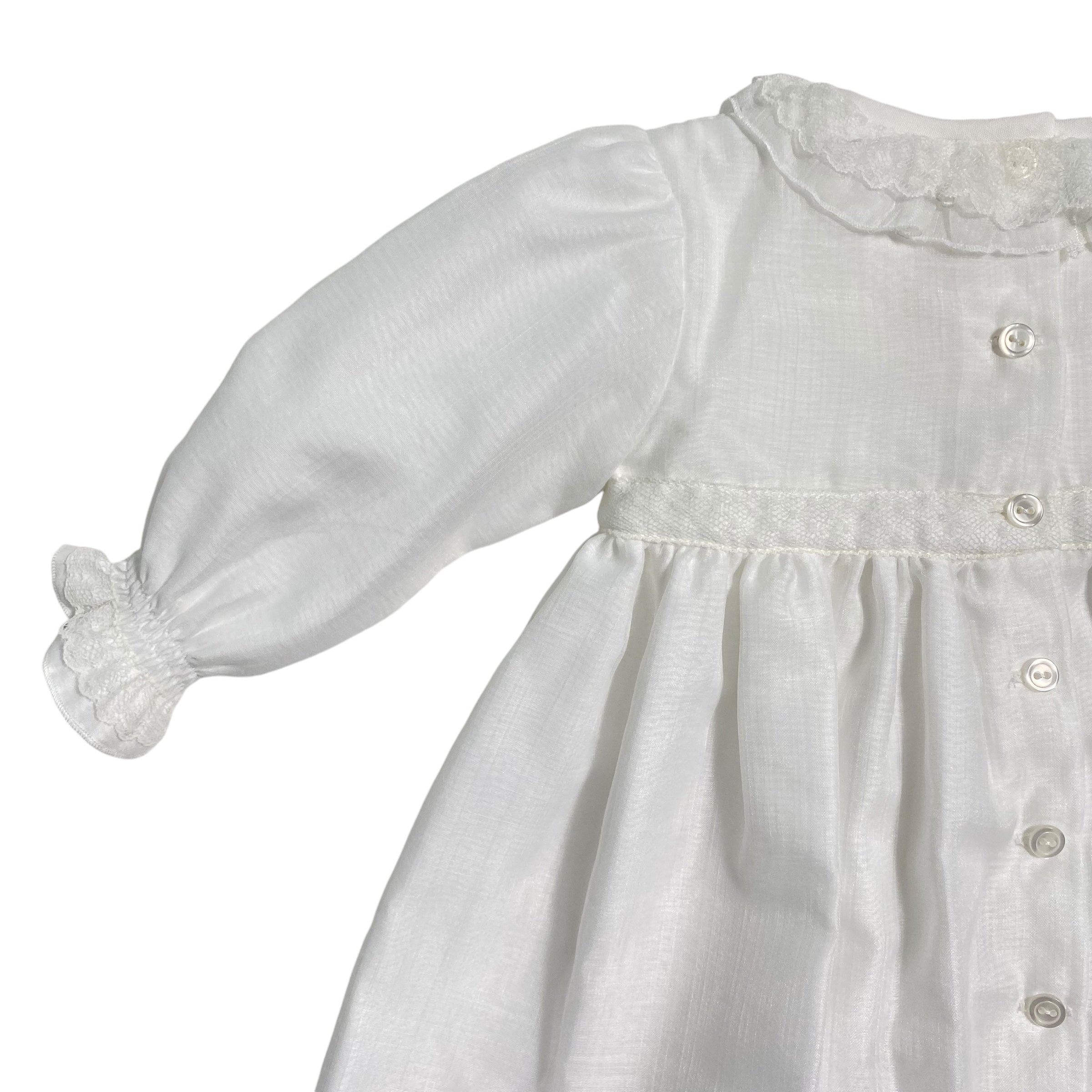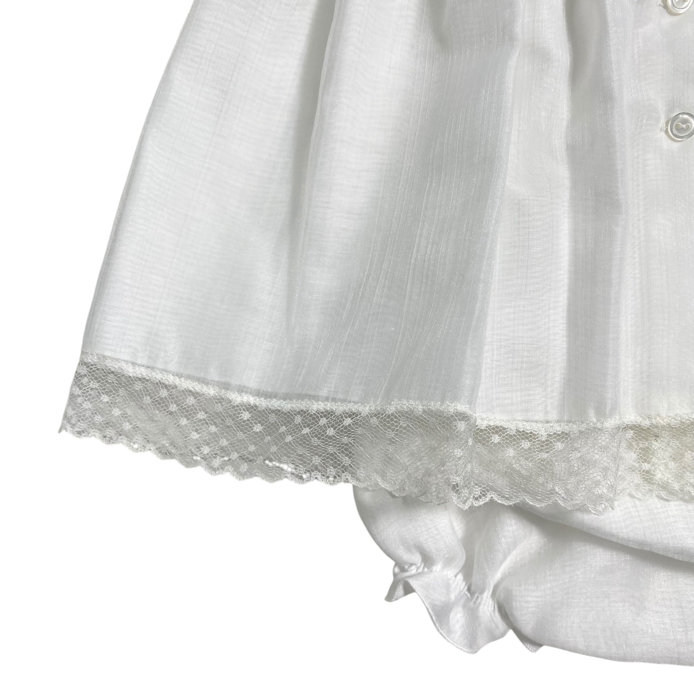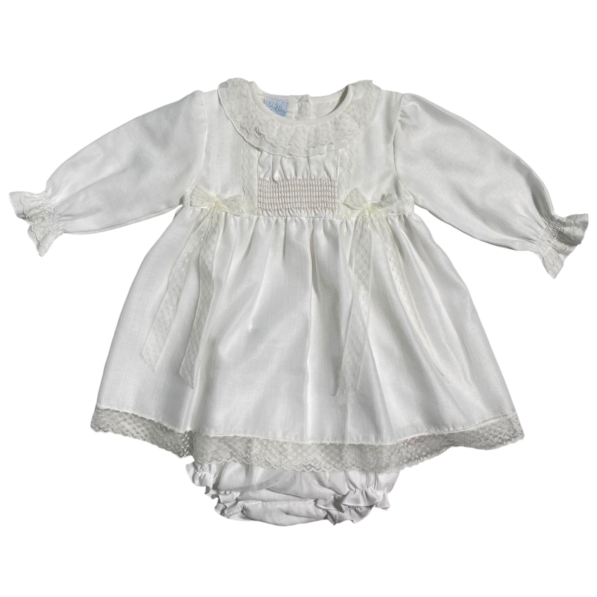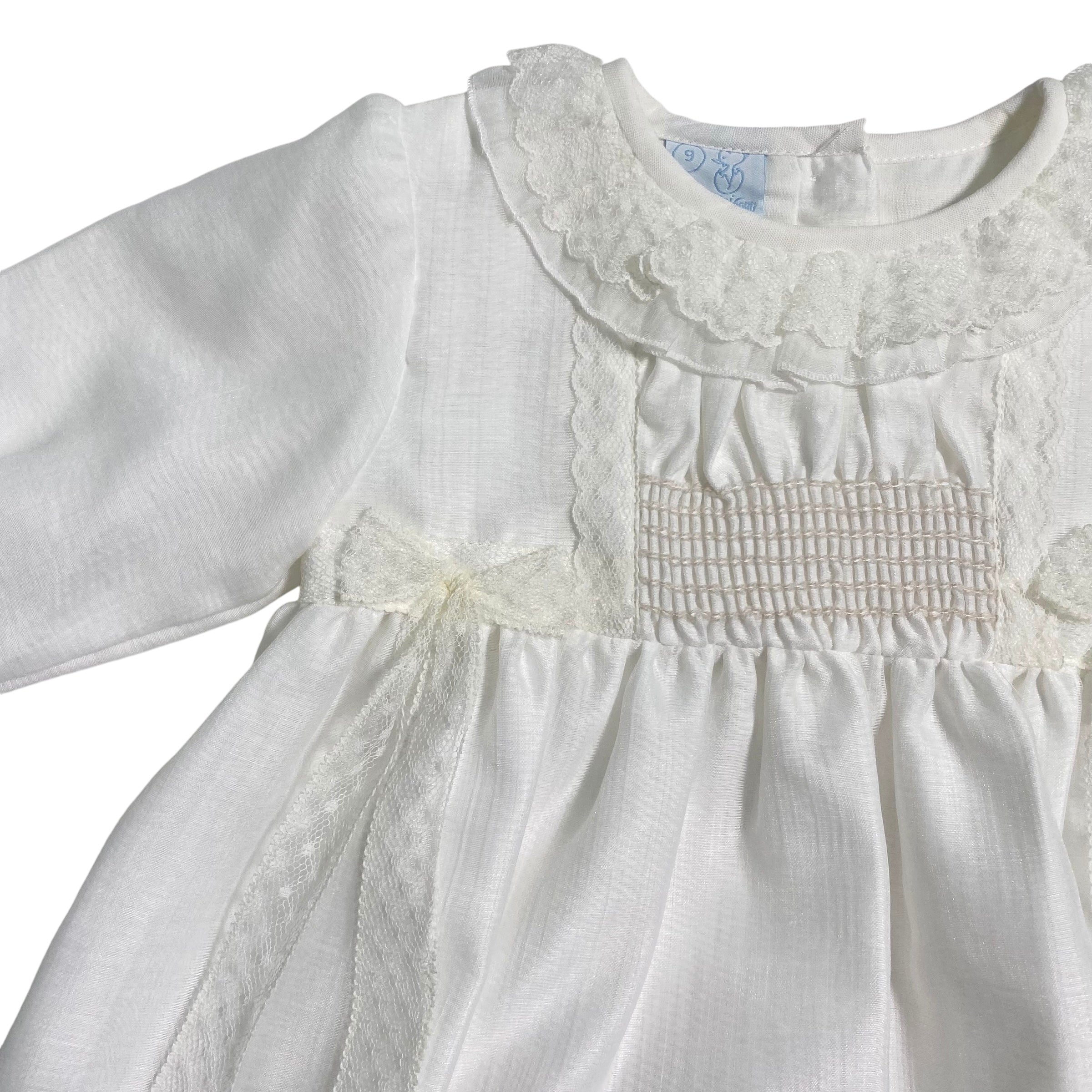 Questo elegante abito battesimale GRANLEI è realizzato in caldo cotone, ricoperto da organza e arricchito da un colletto e fiocchi sul davanti in pizzo. Il punto smoke sul petto aggiunge un tocco di charme a questo outfit perfetto per un'occasione speciale come il battesimo. Culotte abbinata inclusa.
