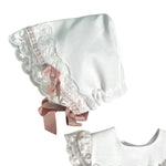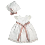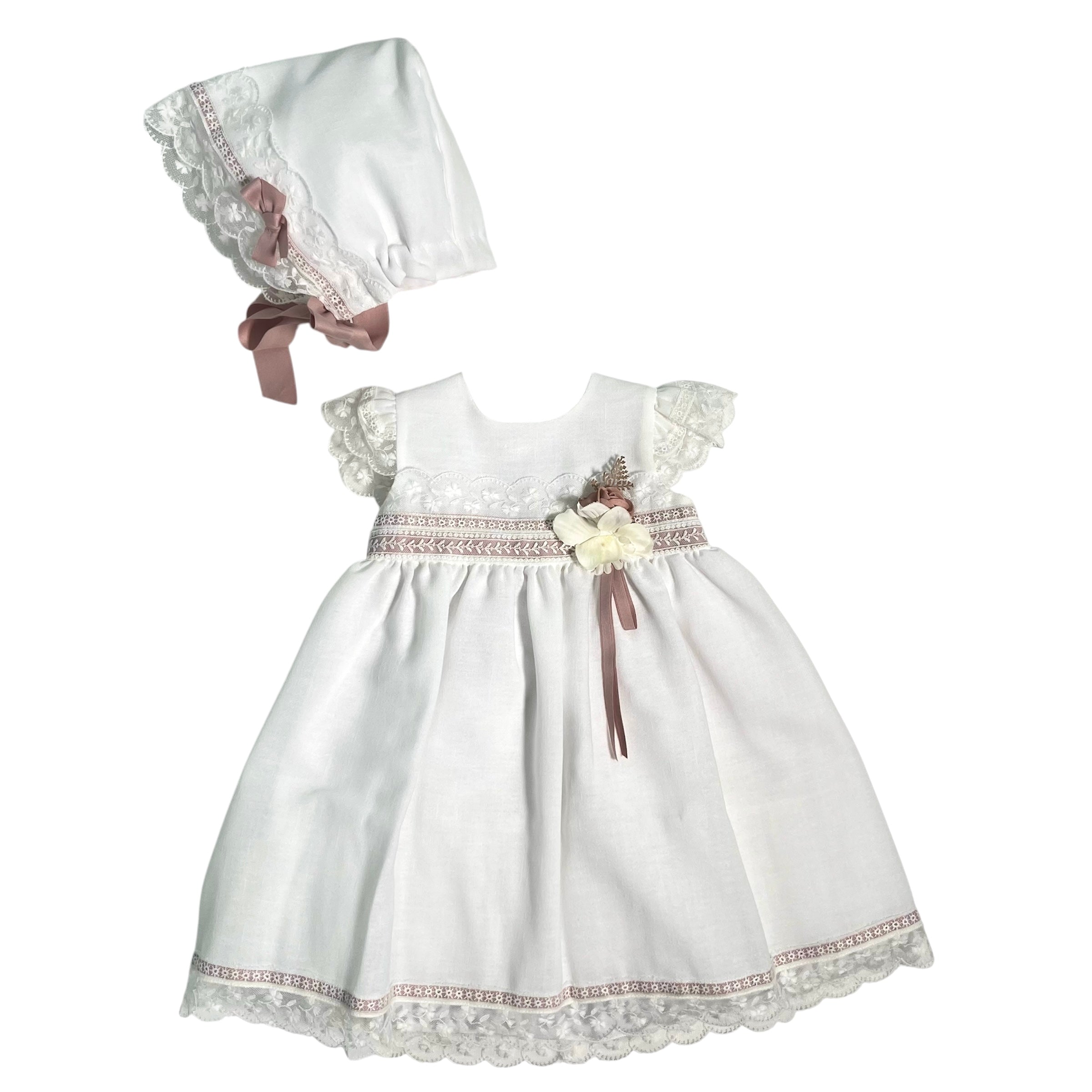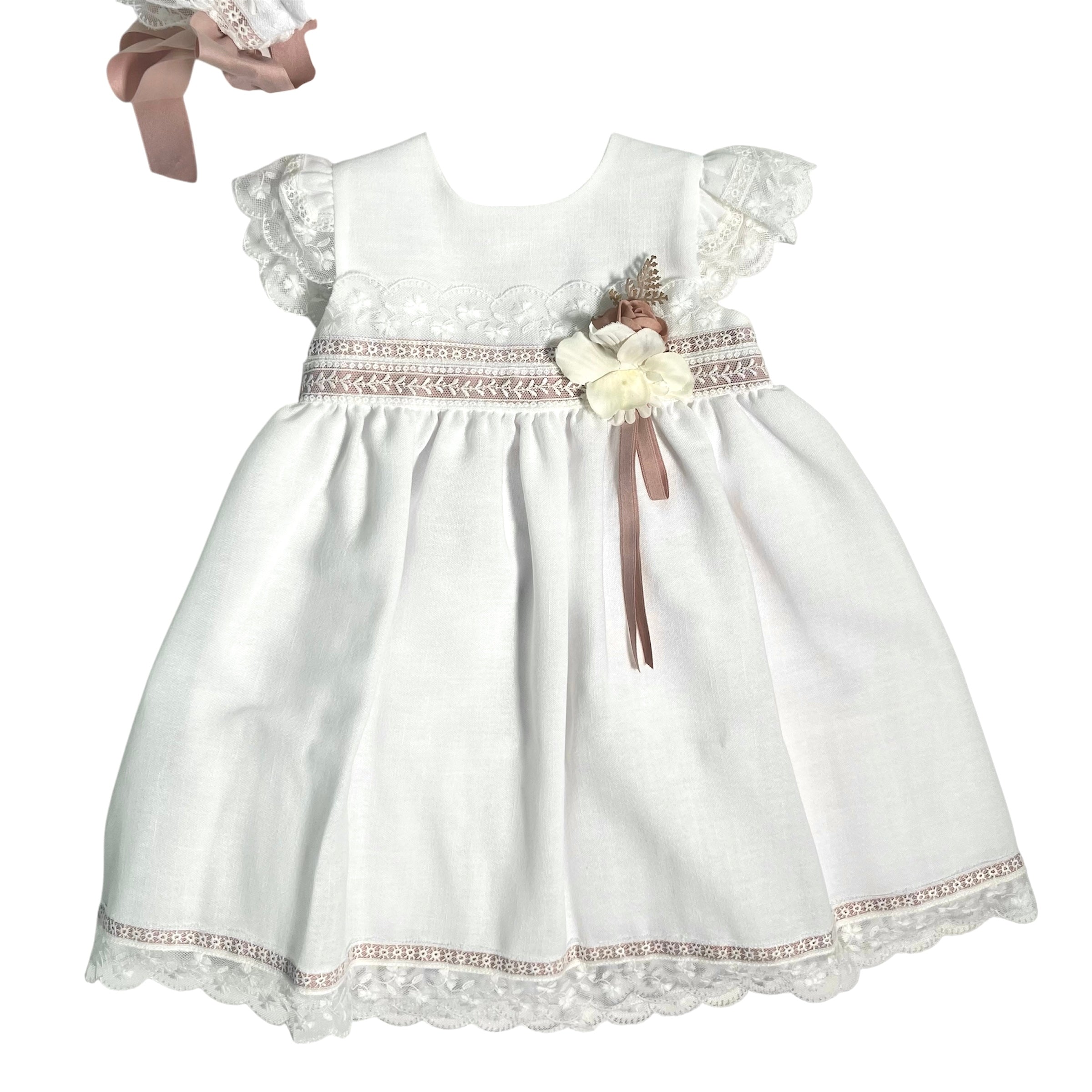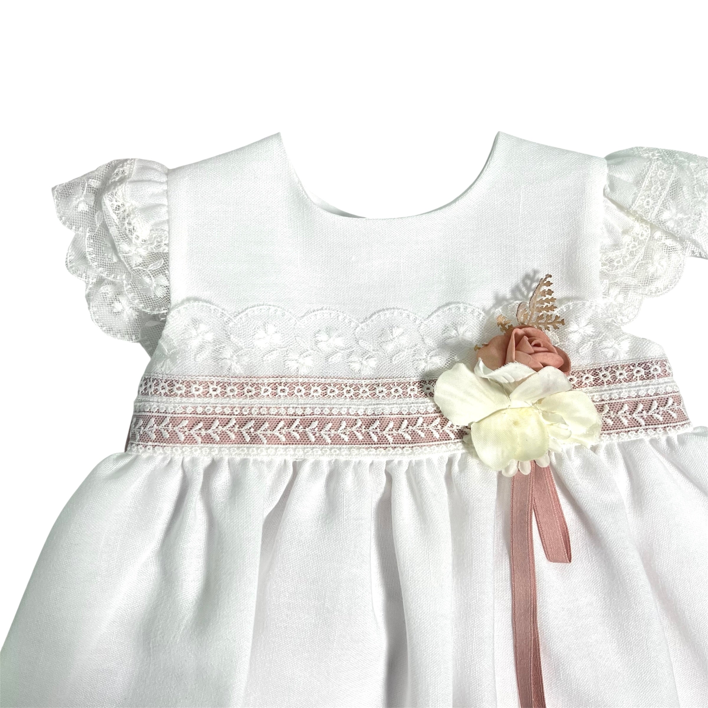 Elegantes Taufkleid aus gepunktetem Tüll, mit halbem Spitzenärmel und altrosafarbener Taillenapplikation.
