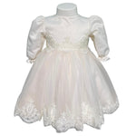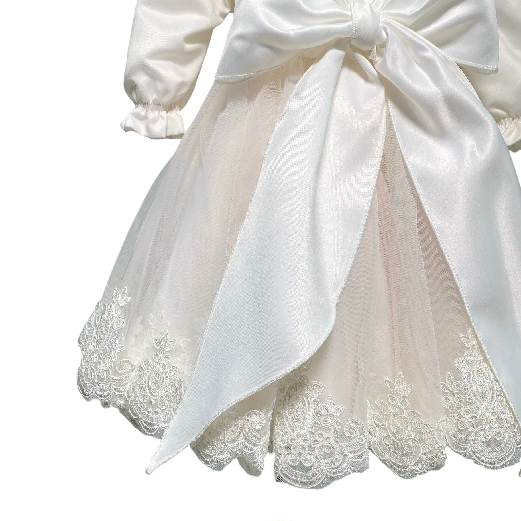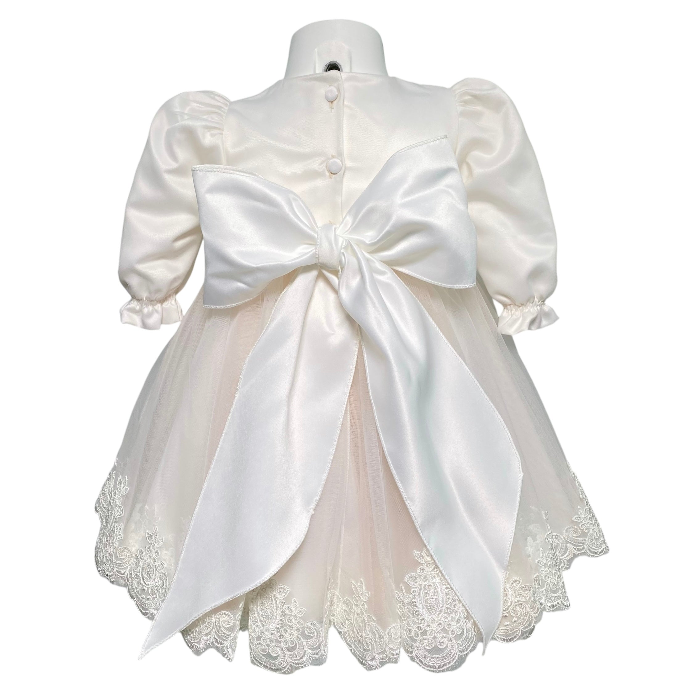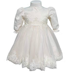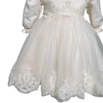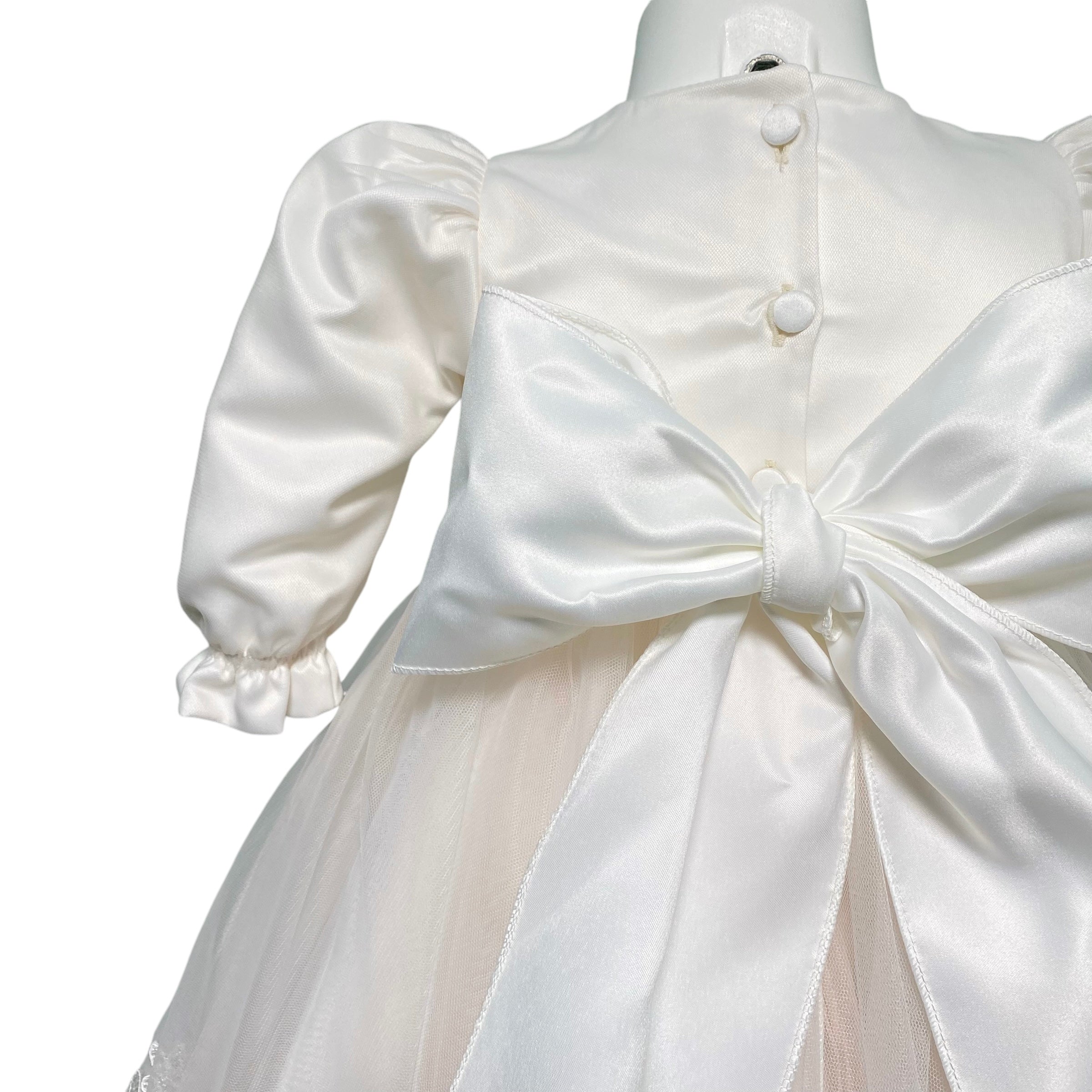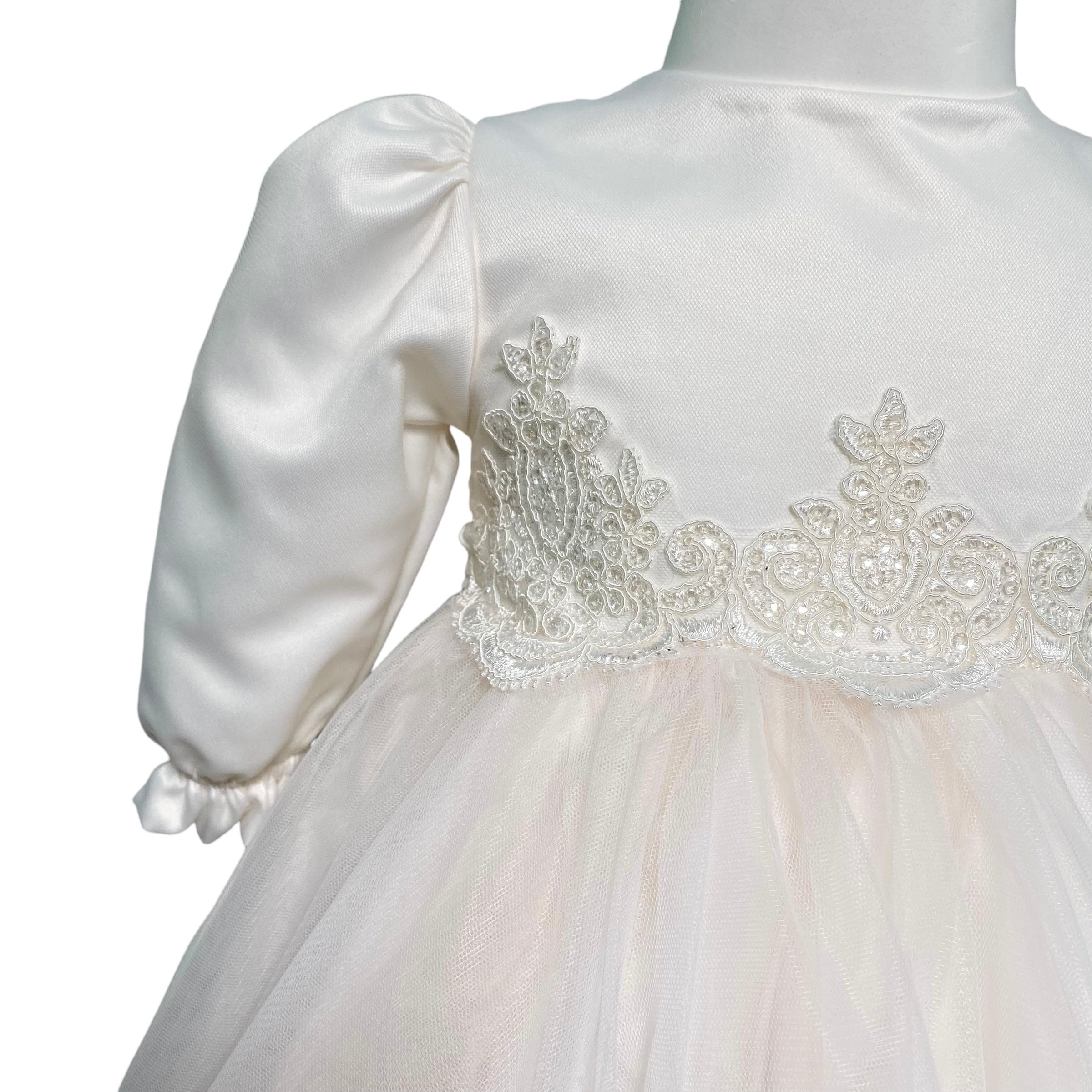 Questo abito elegante e battesimale è perfetto per la tua bambolina neonata. Con una manica lunga e una gonna in tulle, il design è reso ancora più speciale dalla balza in pizzo e dal ricamo con paillettes sul petto. Dotato di una chiusura con zip invisibile, sarà l'outfit ideale per un'occasione speciale.