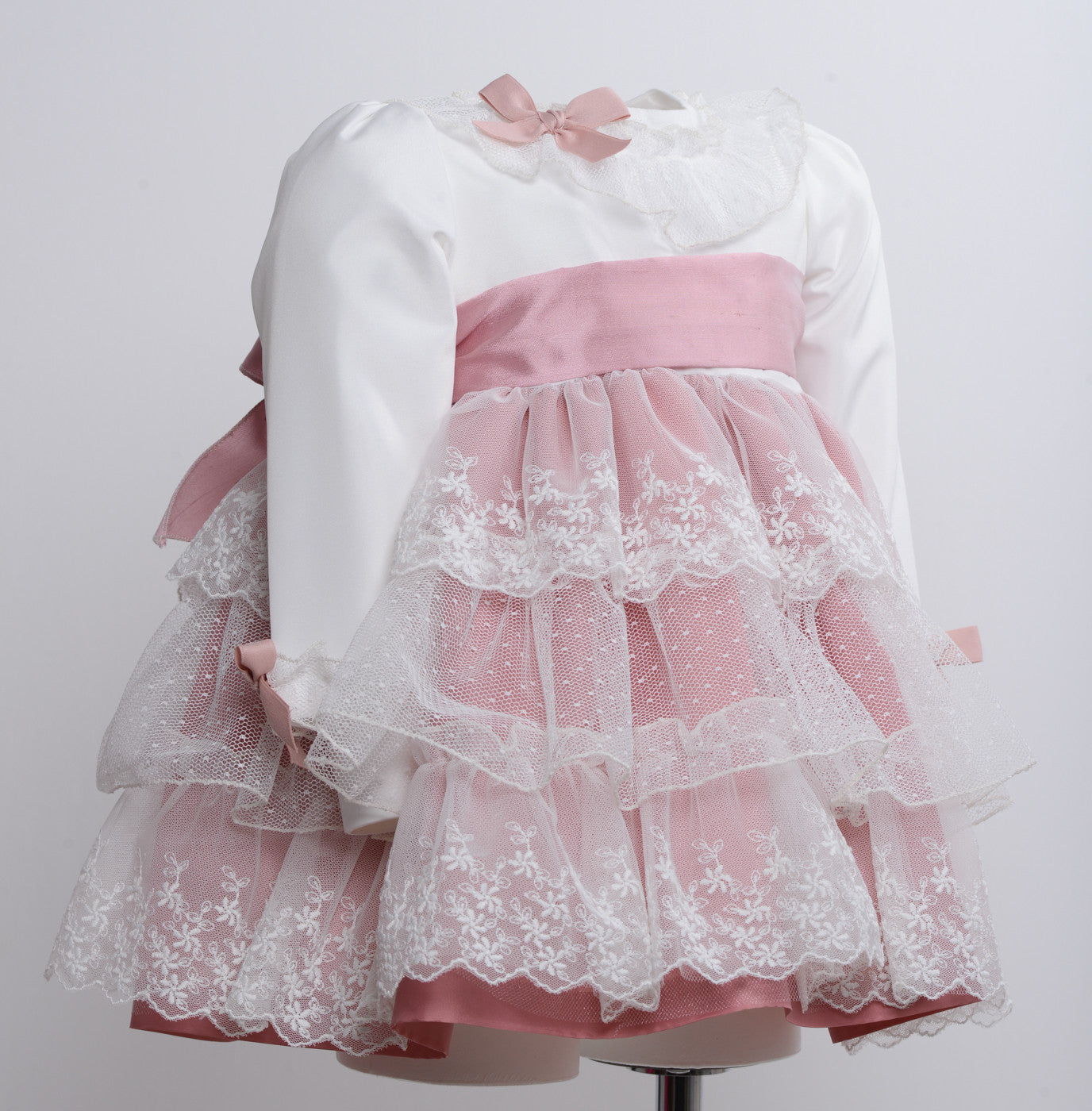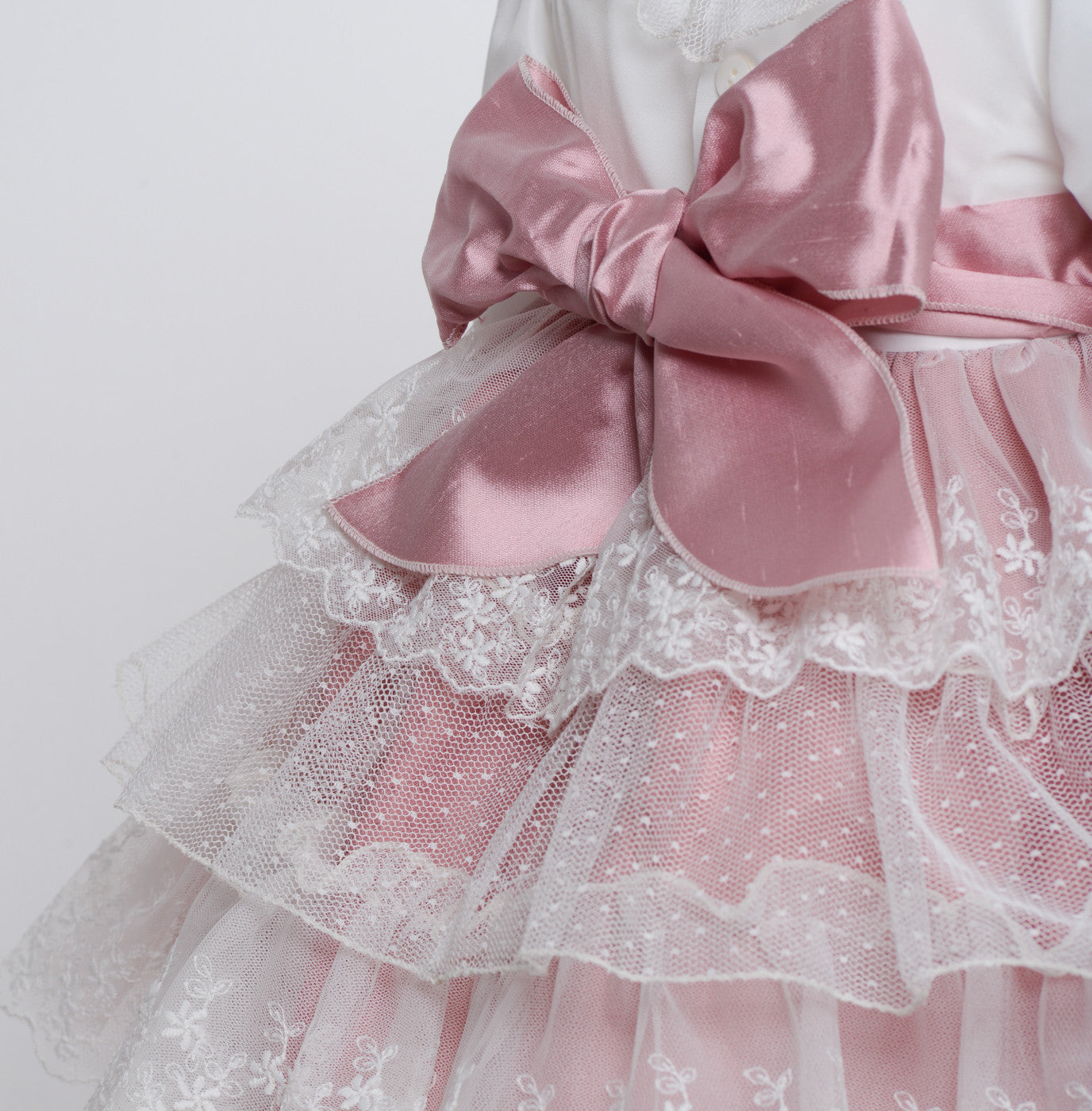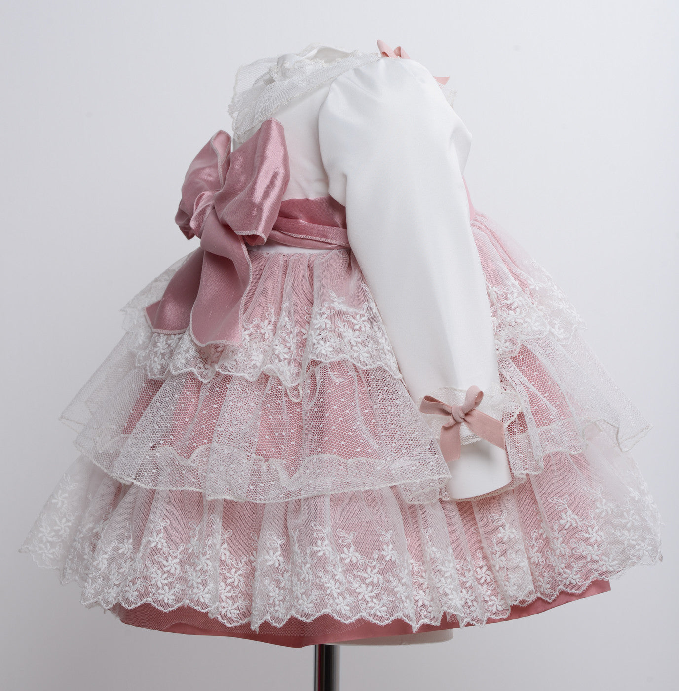 Elegantes Taufkleid mit Culotte für Sie aus weißem Taft mit langen Ärmeln und rosa Kontrast.