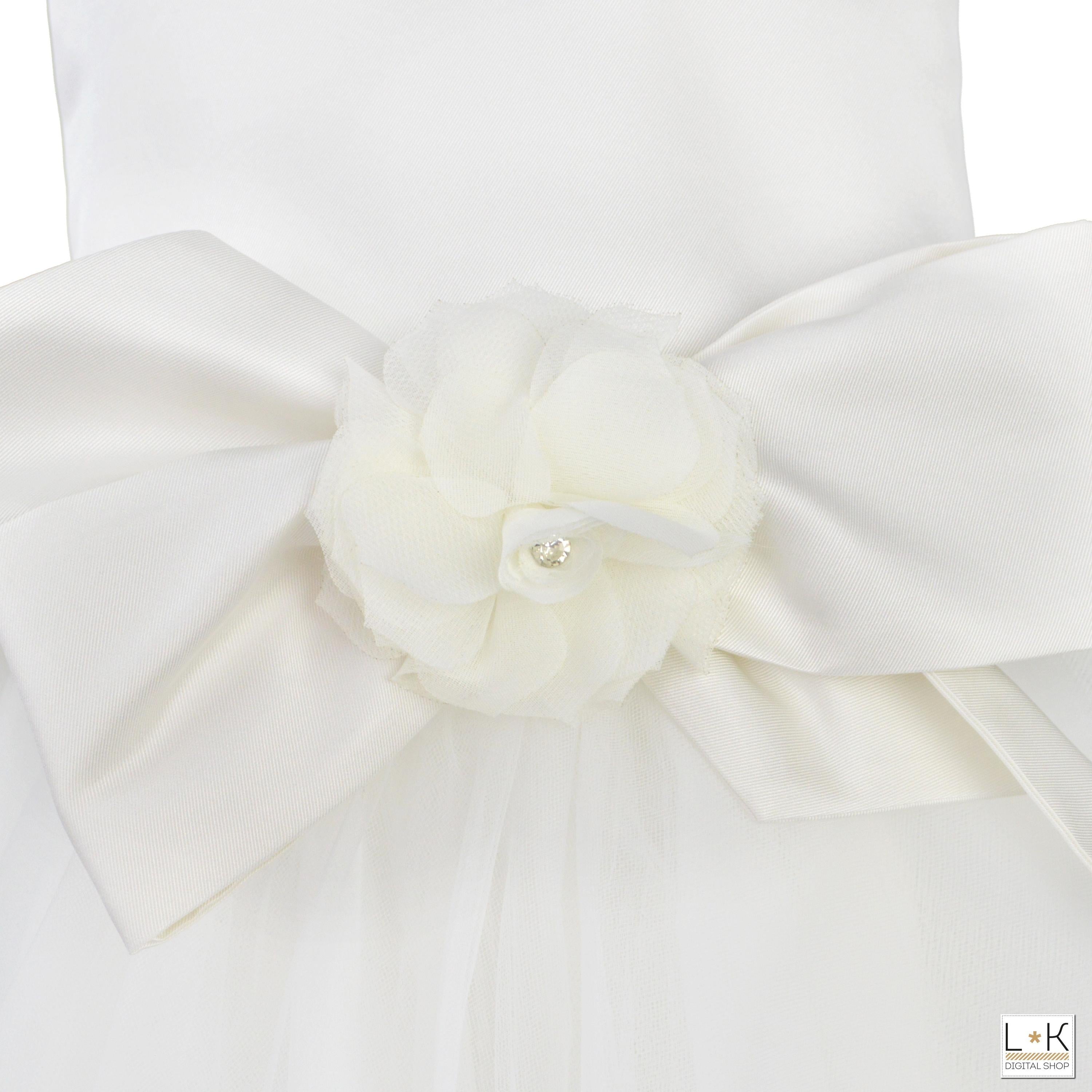 -Applikation einer Satinschleife mit Blume auf der linken Seite der Taille