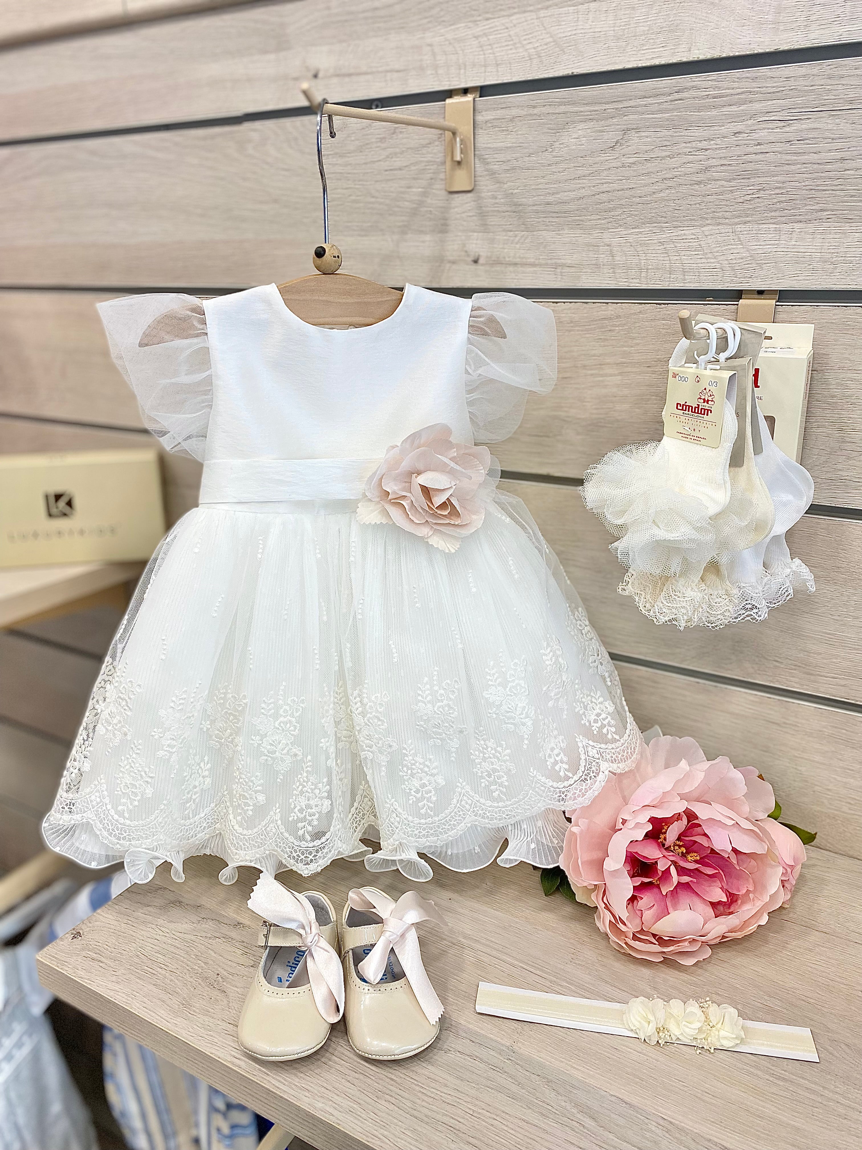 Elegantes Zeremoniekleid mit cremefarbenem Satinoberteil und Faltenrock mit darüber liegender Spitzenapplikation.