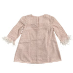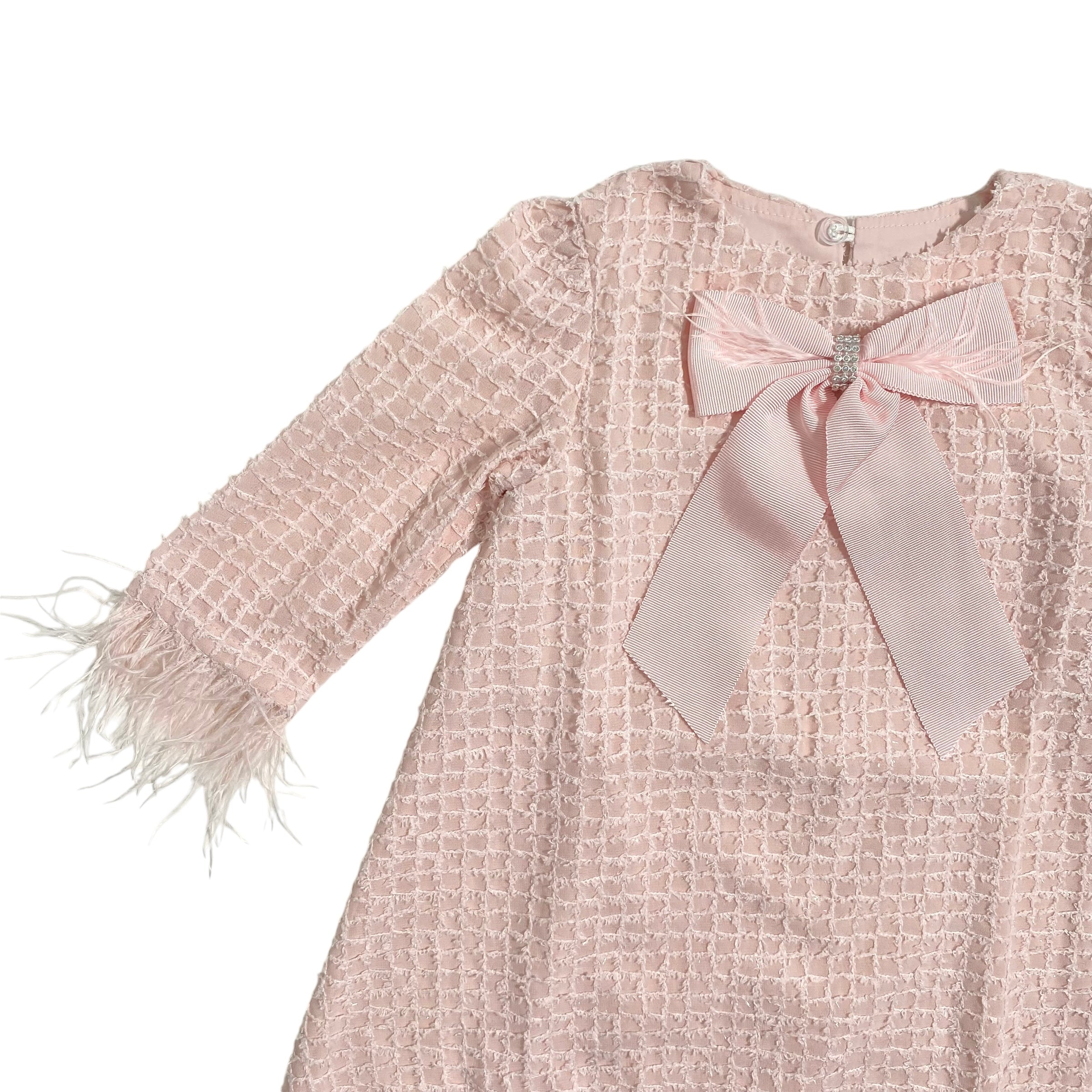Questo elegante abito in chiffon operato con manica lunga è perfetto per le bambine in occasioni speciali. Le piume ai polsi e il fiocco sul davanti aggiungono un tocco di raffinatezza. Vestirà la tua bambina con stile e classe.