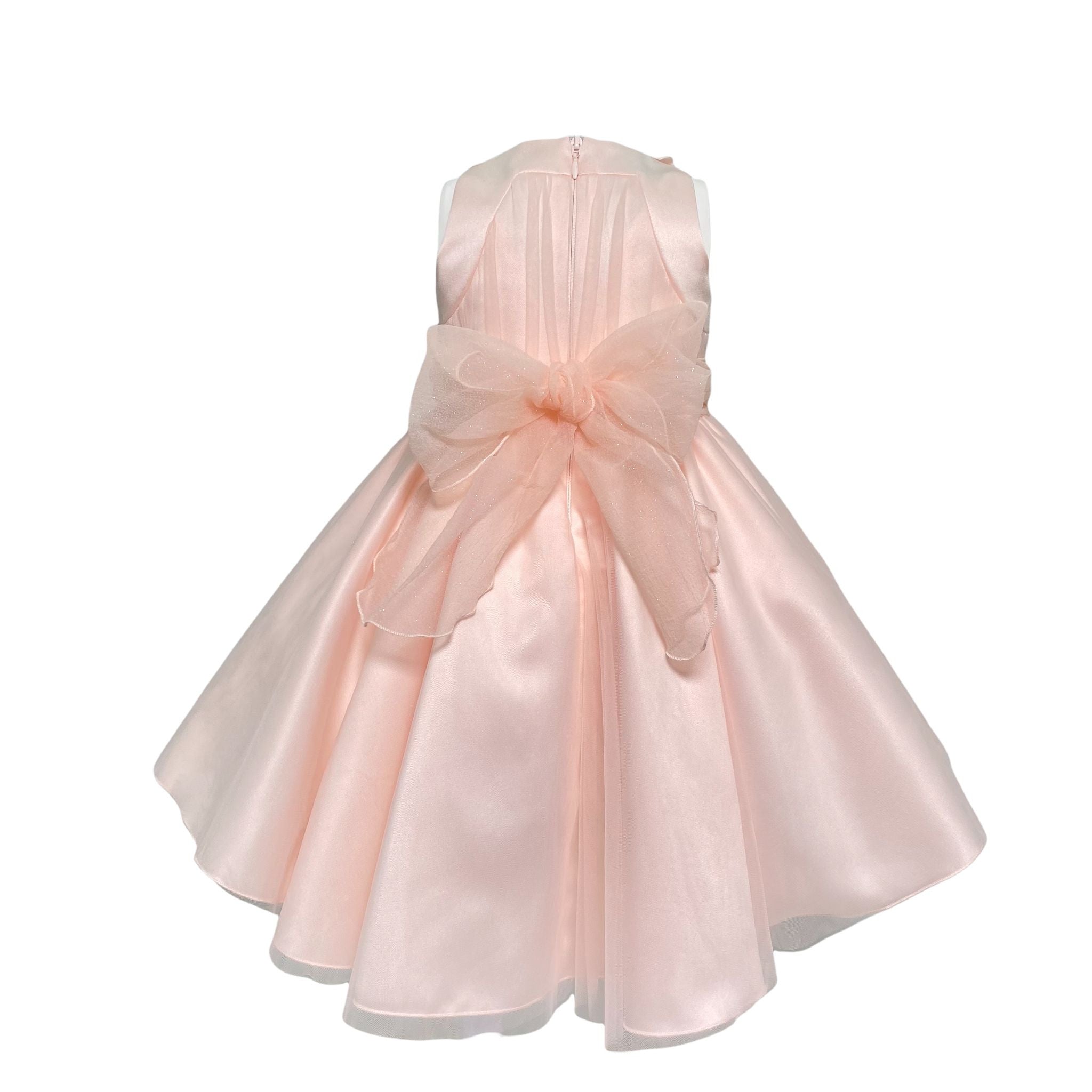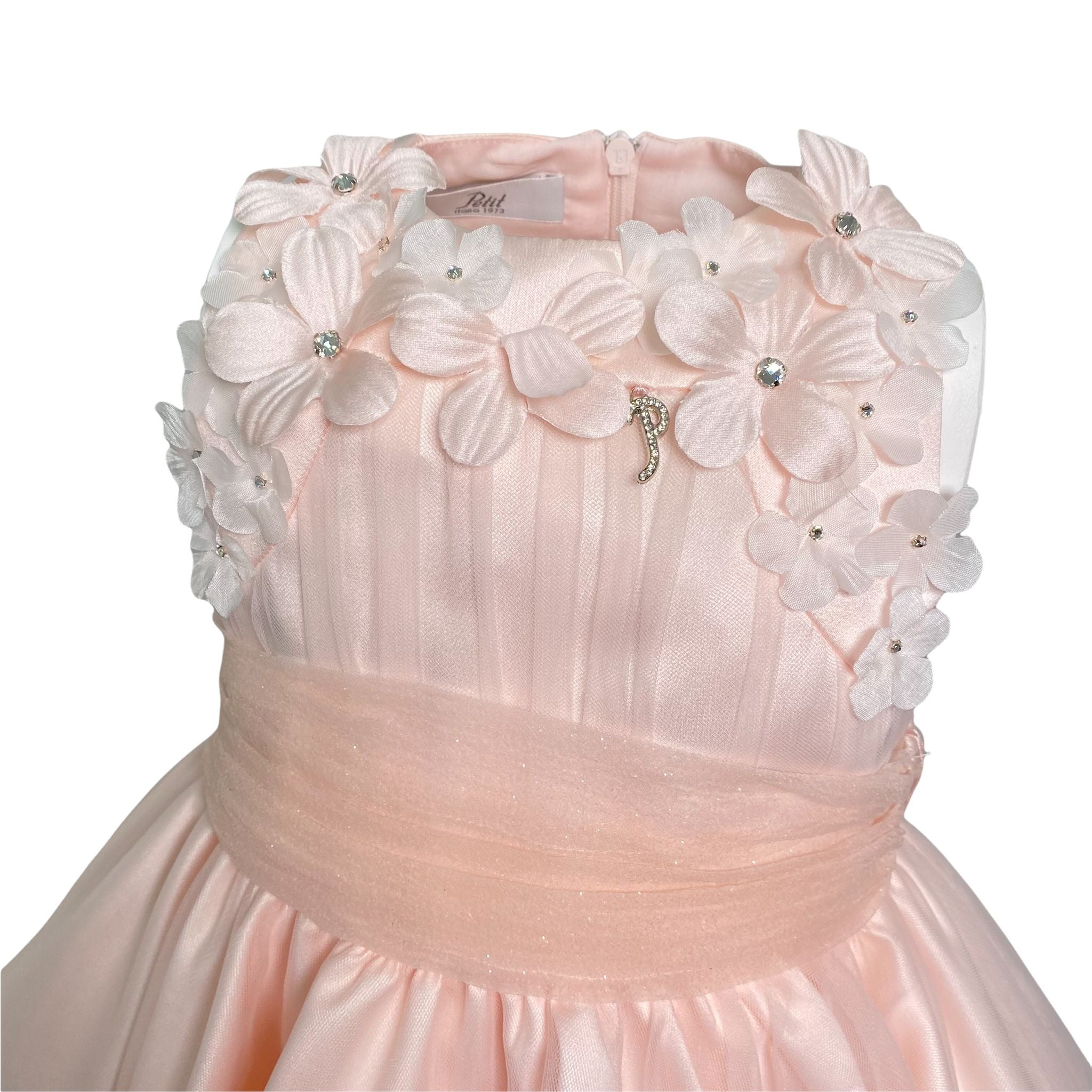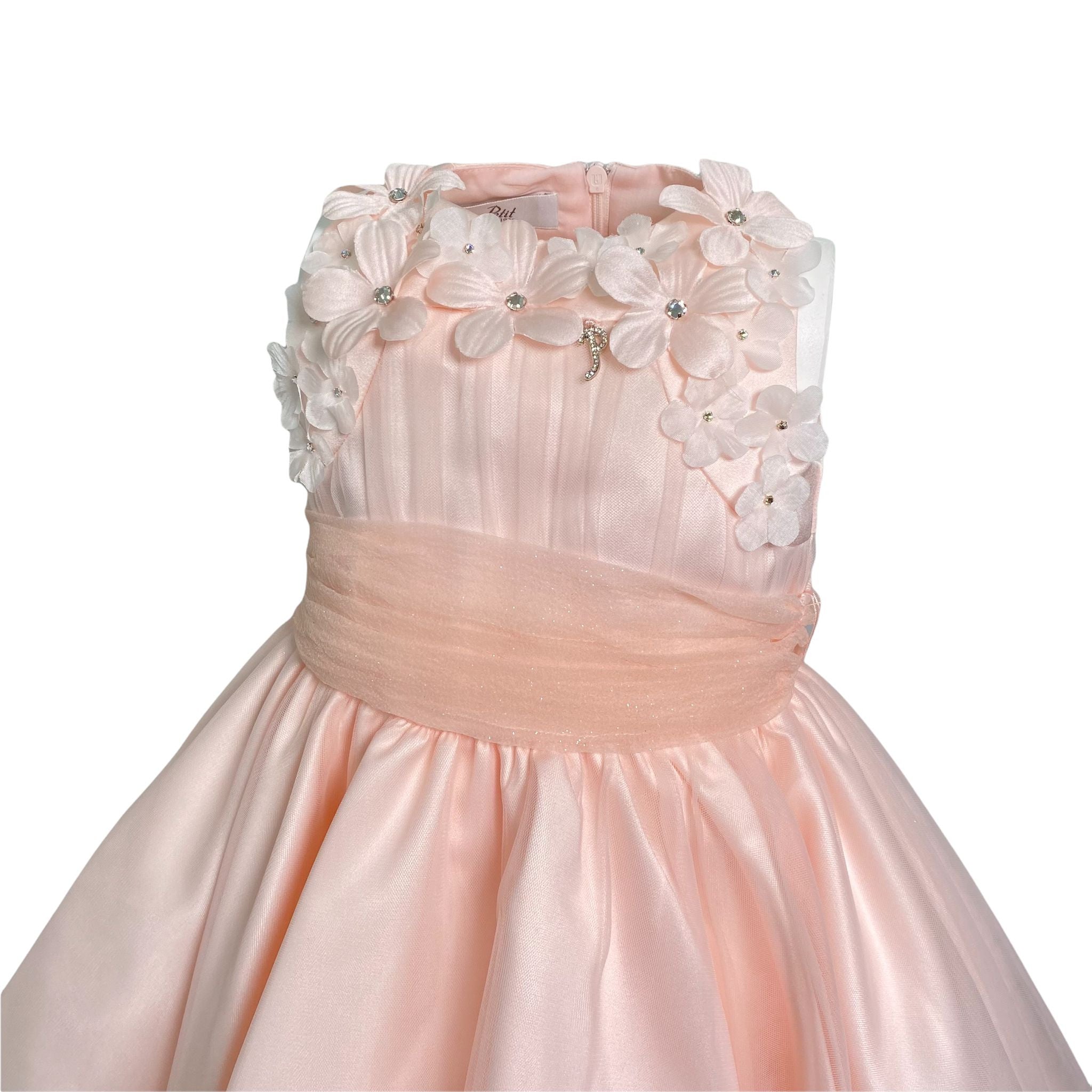 Elegantes ärmelloses Seidenkleid mit Seidenoberteil, das mit Tüll und Blumen bedeckt ist.