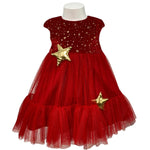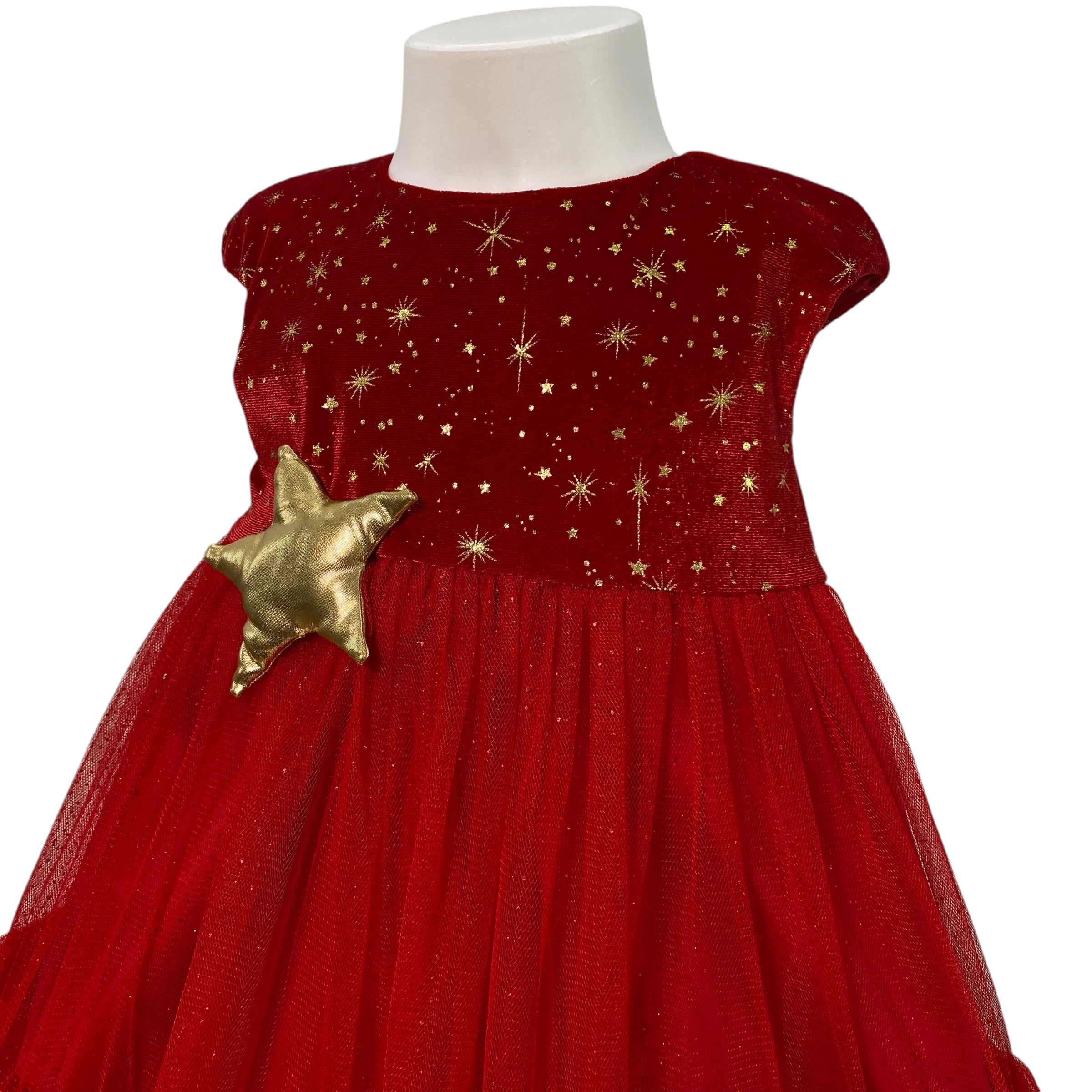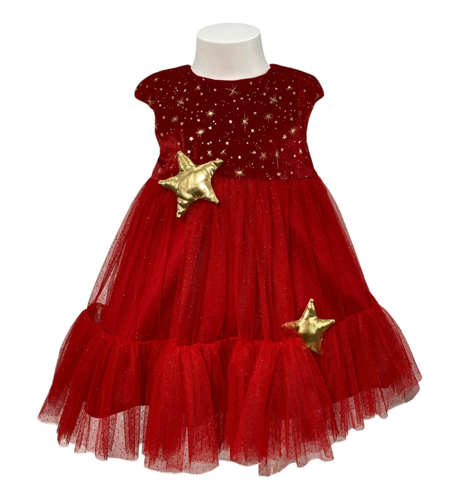 Questo abito elegante e sofisticato presenta una mezza manica e un corpetto in morbido velluto rosso con stelle oro stampate, perfette per creare un look incantevole. La gonna in tulle leggero è adornata con un'appliquazione di stelle oro sul davanti, completando così l'aspetto magico di questo abito. Uno stile unico e perfetto per ogni occasione speciale.