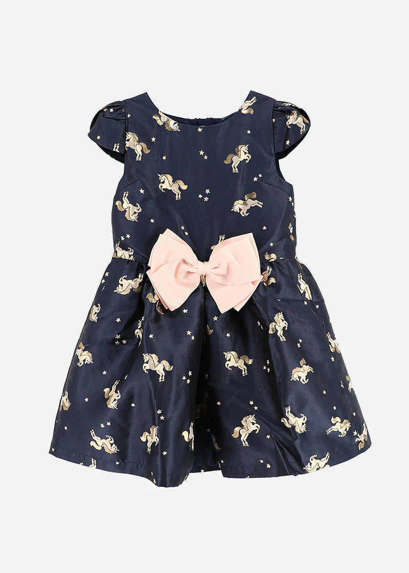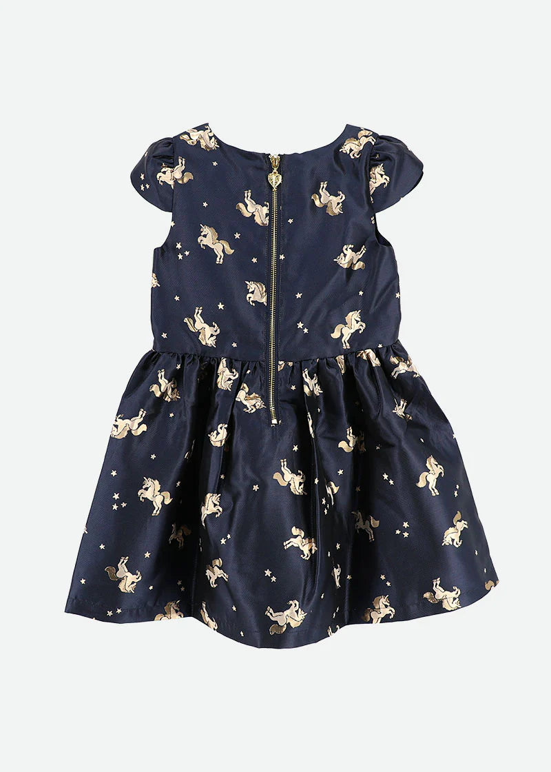 L'Abito Elegante Jacquard Fantasia Unicorno Bambina ANGEL'S FACE DESIREE è un abito magico realizzato in esterno in 100% poliestere, foderato in 100% poliestere per una migliore resistenza. Presenta graziose maniche a petalo, chiusura sul retro con zip dorata e iconico tiretto a cuore. Il tutto arricchito con il nostro fiocco firmato Angel's Face e un ciondolo a cuore d'oro al centro della vita. Splendido vestito blu scuro con unicorni dorati. Lavare in lavatrice a 30°.