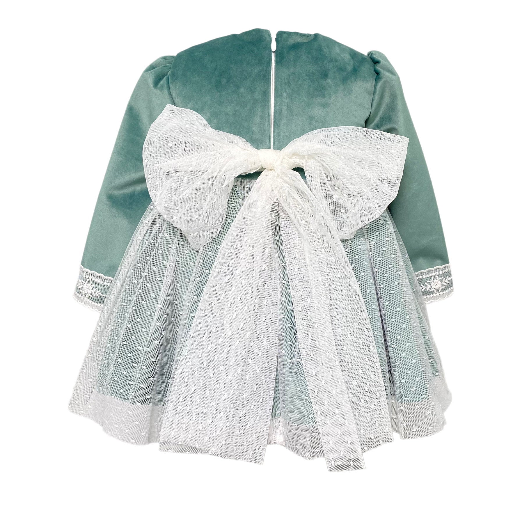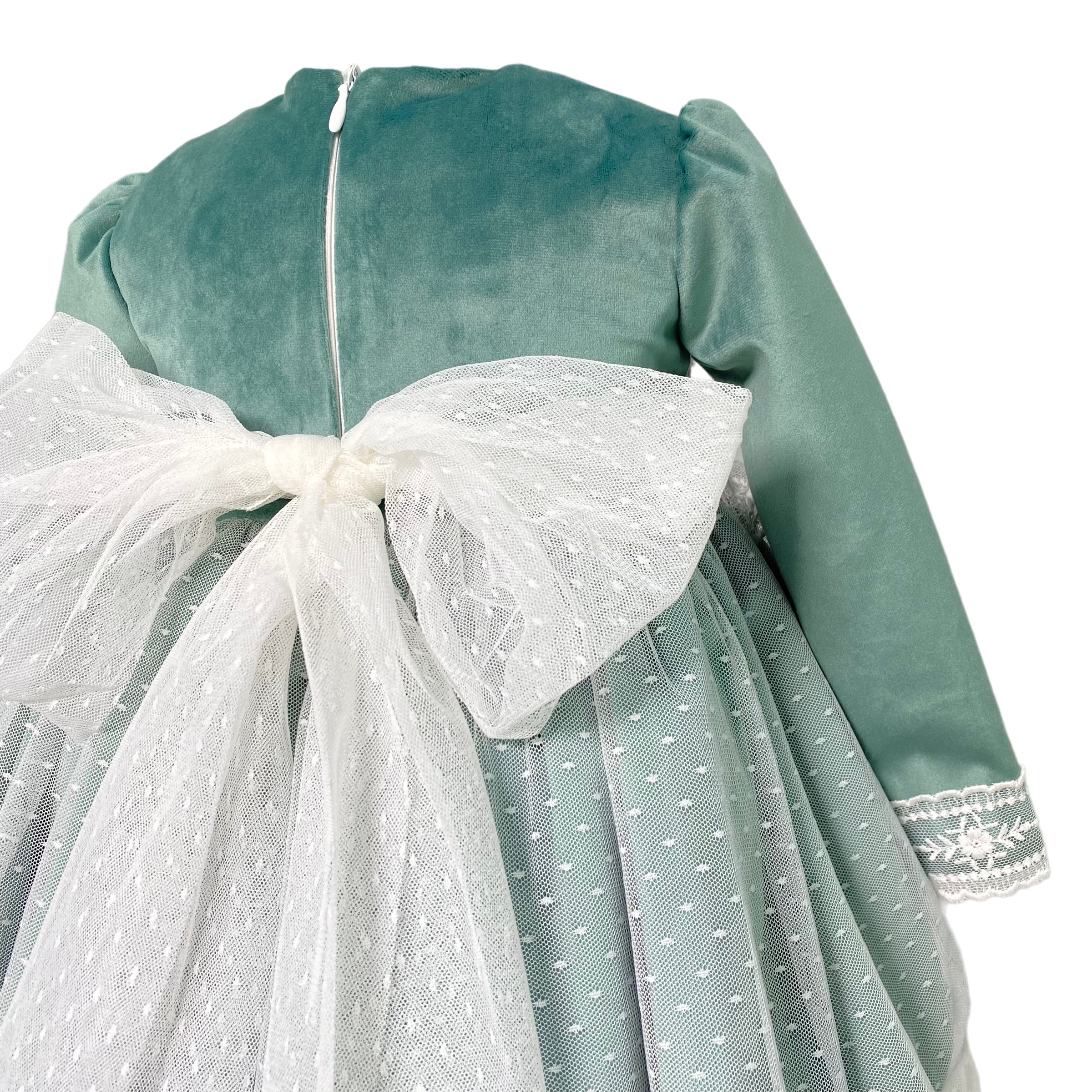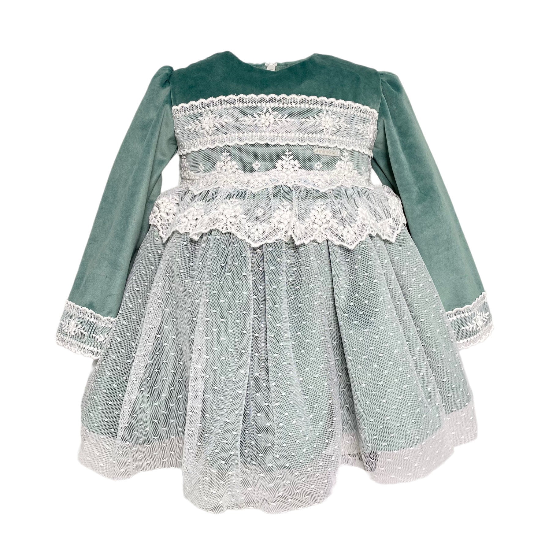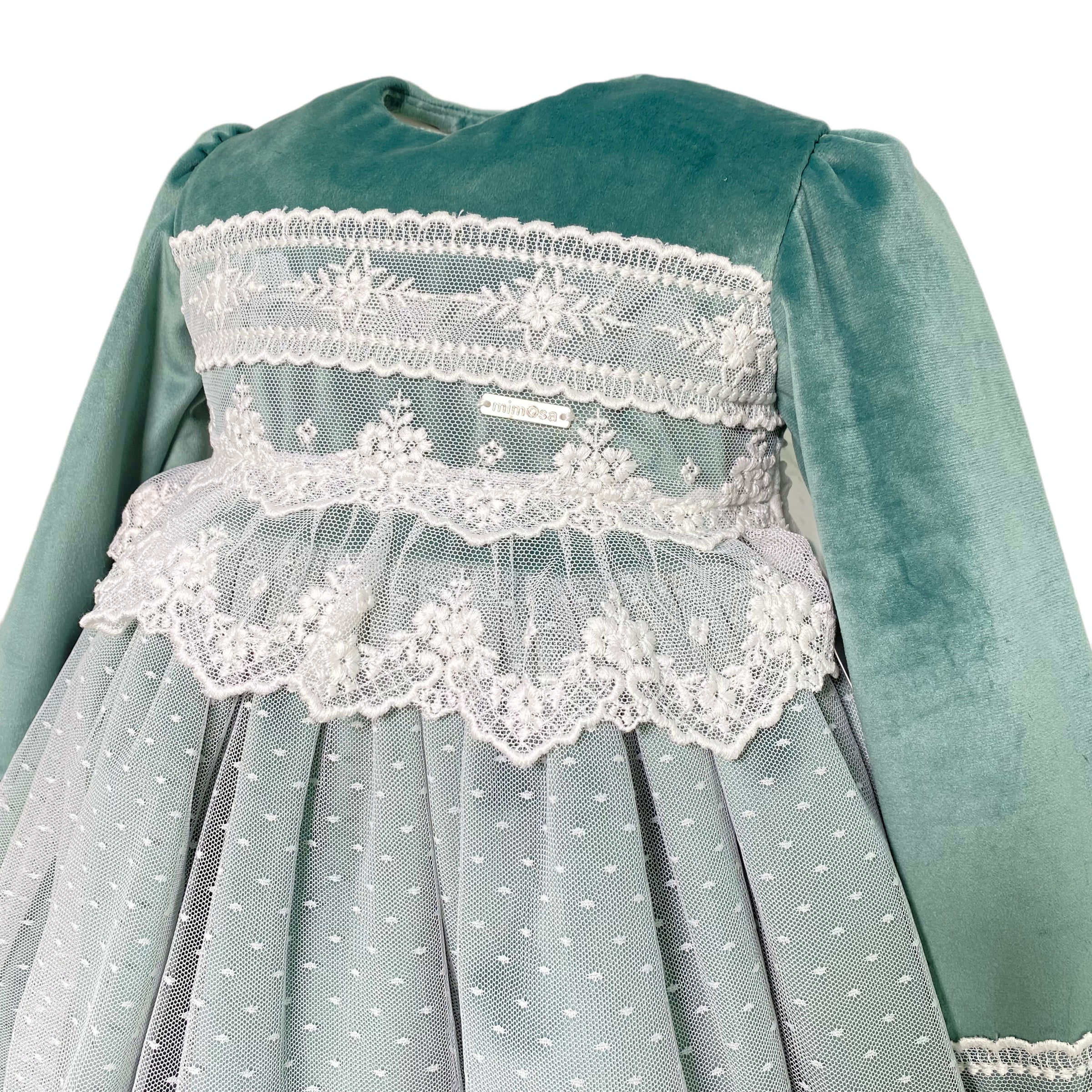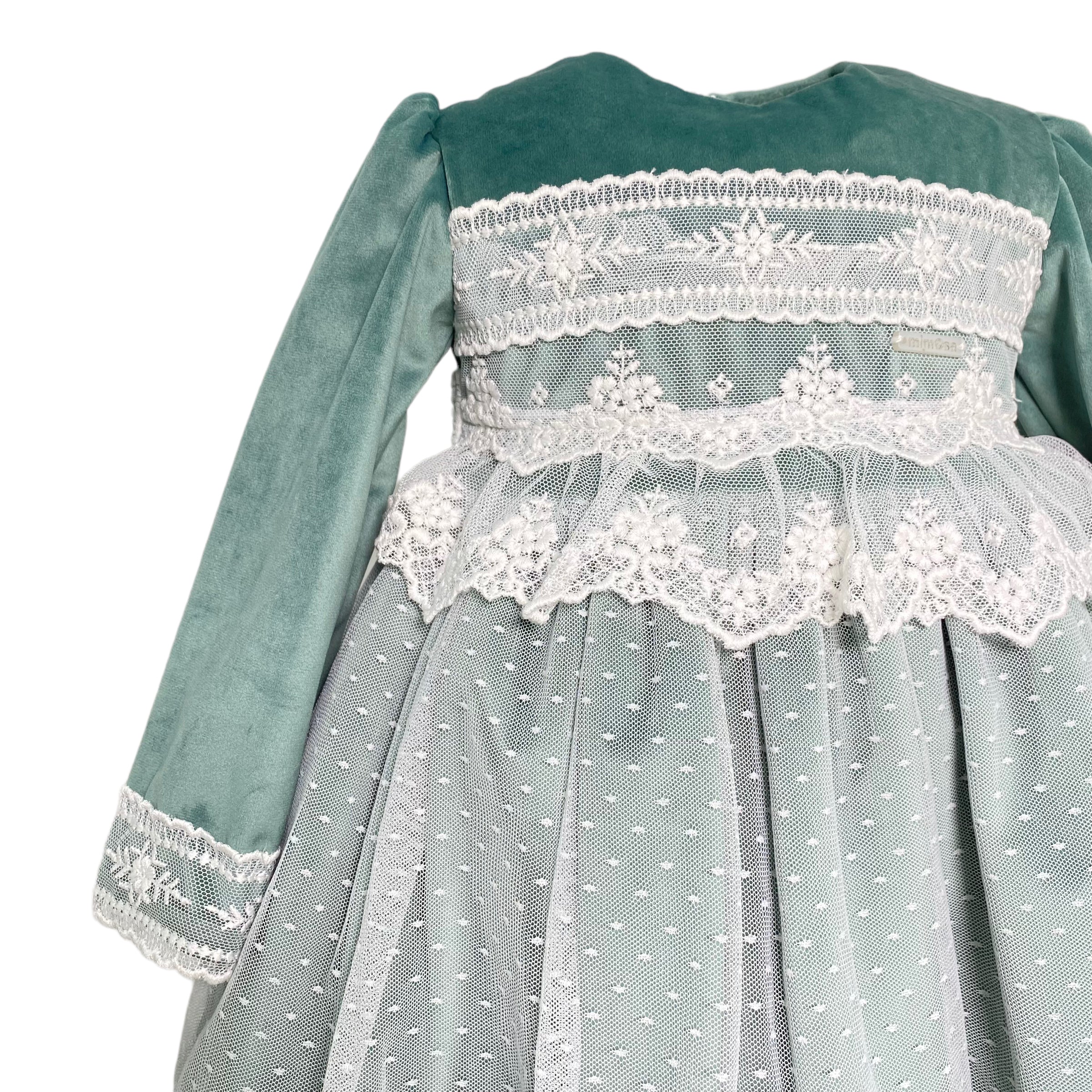 Elegantes langärmliges Kleid aus grünem Samt, mit weißer Spitze auf der Vorderseite und am Rock.