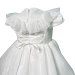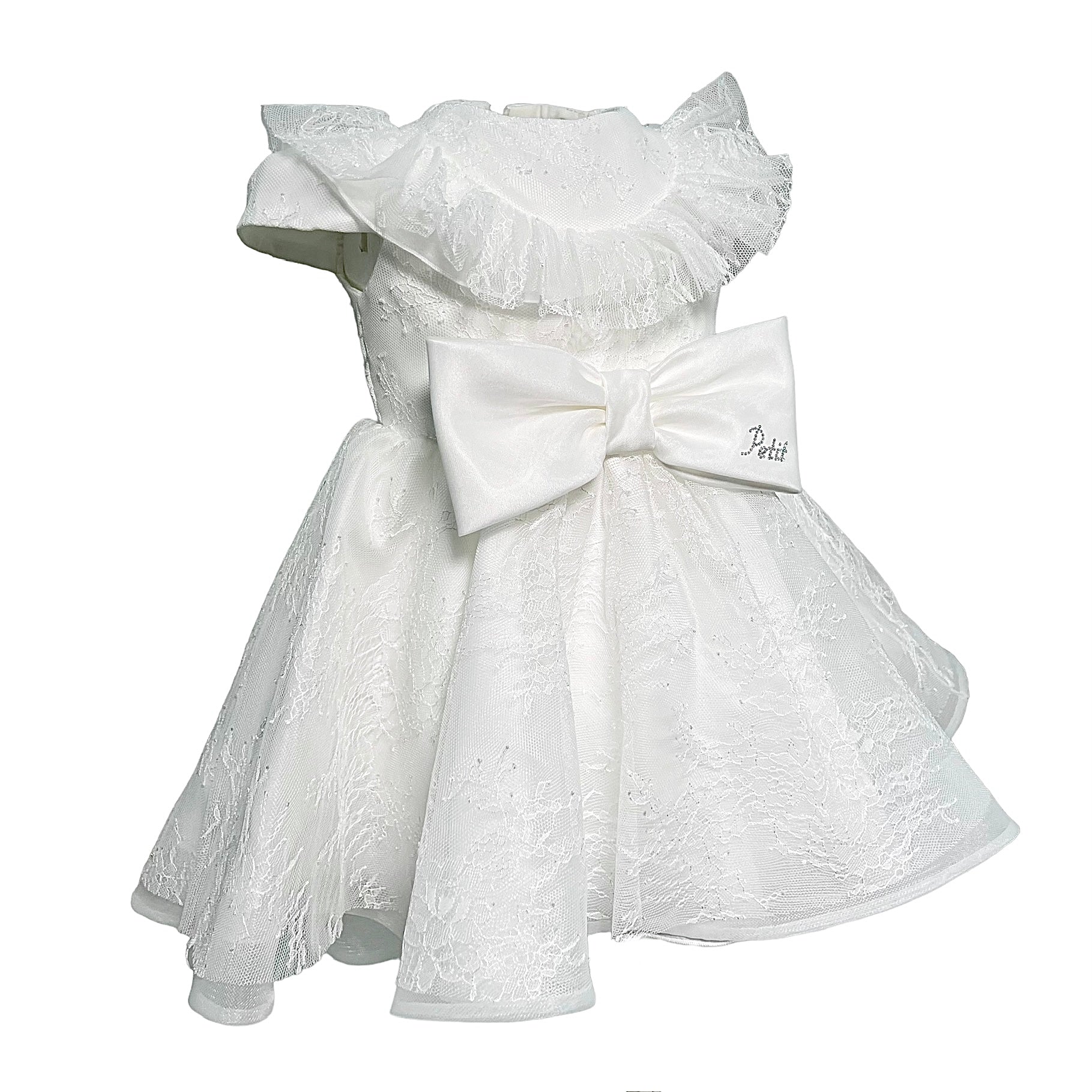 Abito elegante per piccole neonate con maniche a metà braccio, svasato e realizzato con pizzo di alta qualità. Il fiocco in vita e la rouches sul petto aggiungono un tocco di grazia a questo abito leggero e raffinato con code. Perfetto per un'occasione speciale.