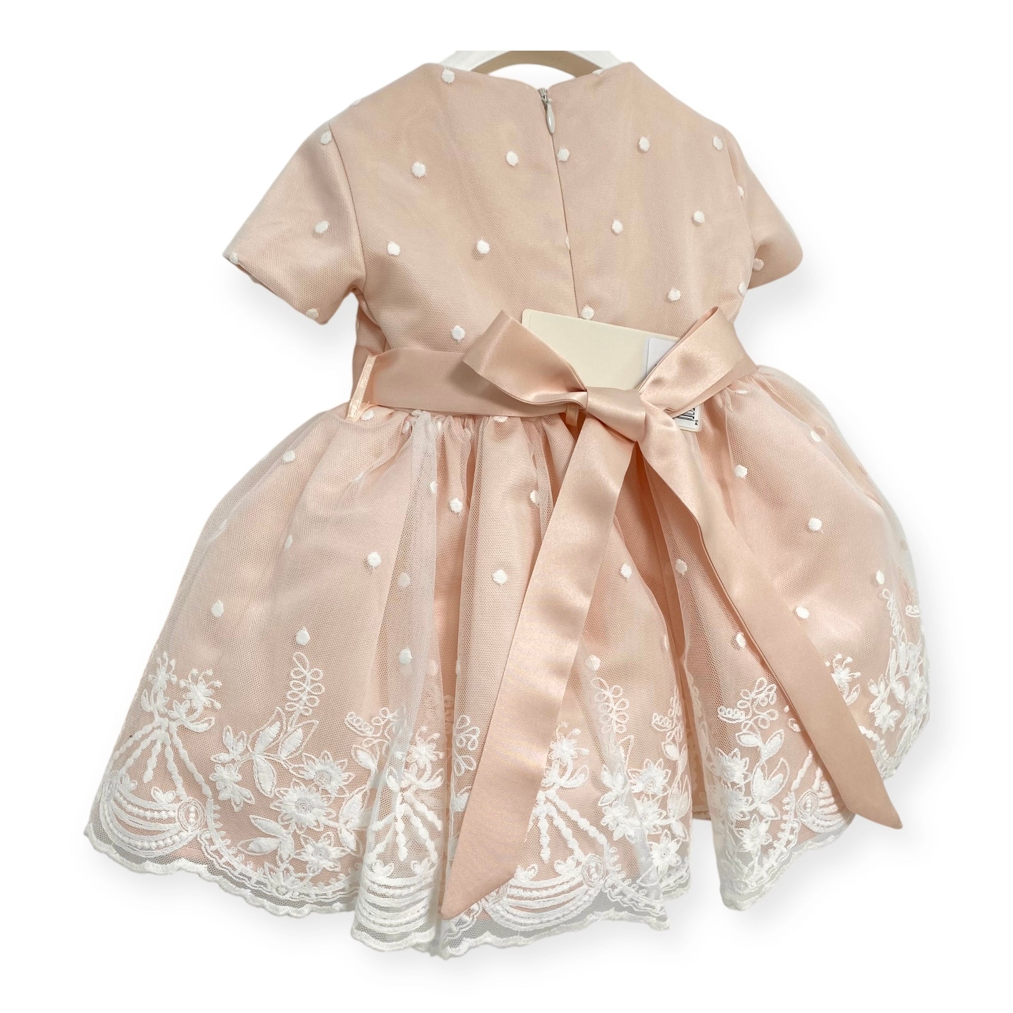 Questo abito elegante per neonata è perfetto per le occasioni speciali. Realizzato in tulle ricamato con mezza manica, presenta un modello bambolina con una fascia di fiori in vita e fiocco sul retro. La chiusura con zip invisibile garantisce una vestizione comoda e facile. Aggiungi un tocco di eleganza al guardaroba della tua bambina con questo abito unico.