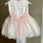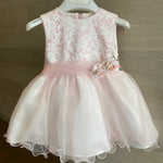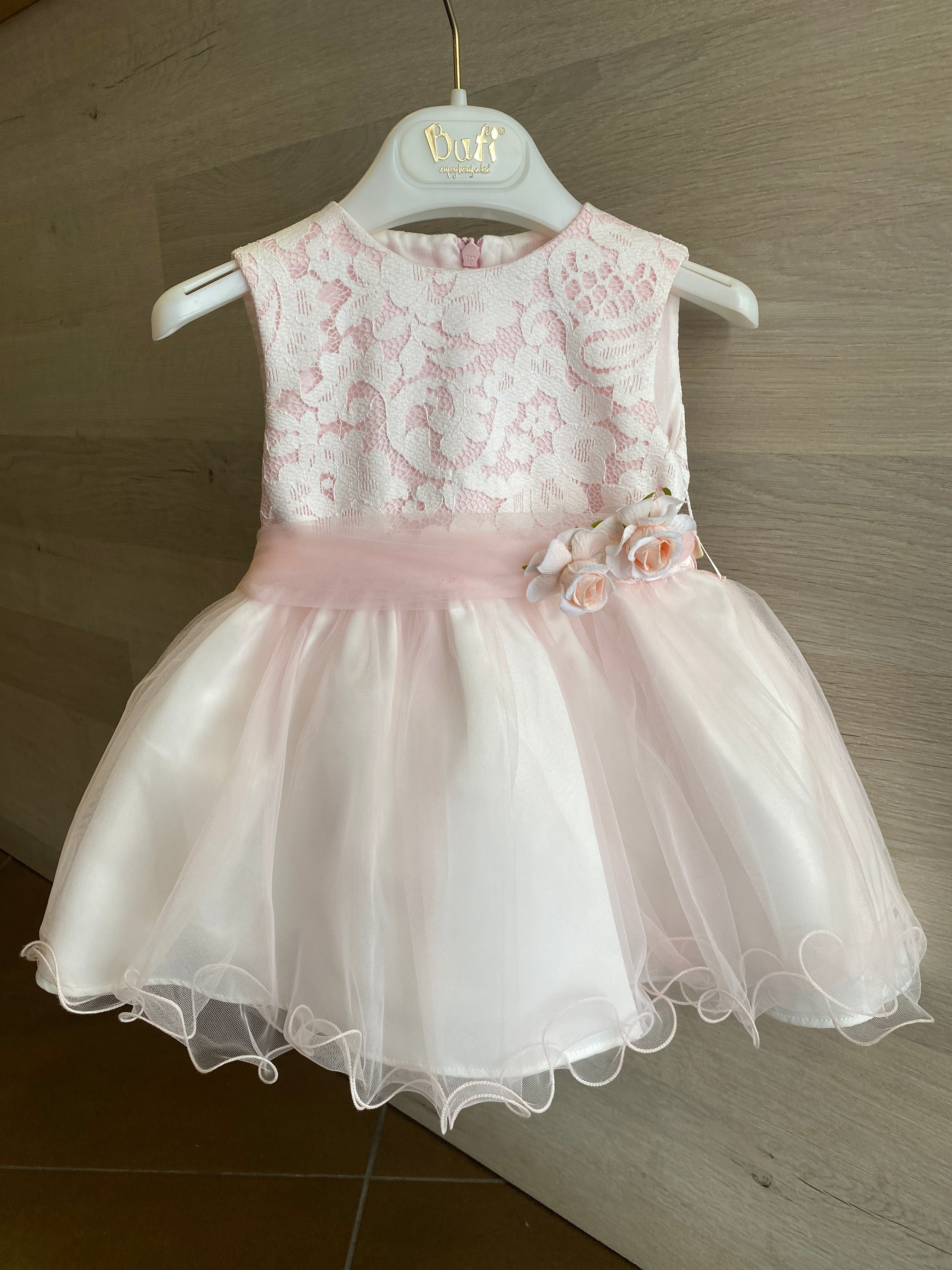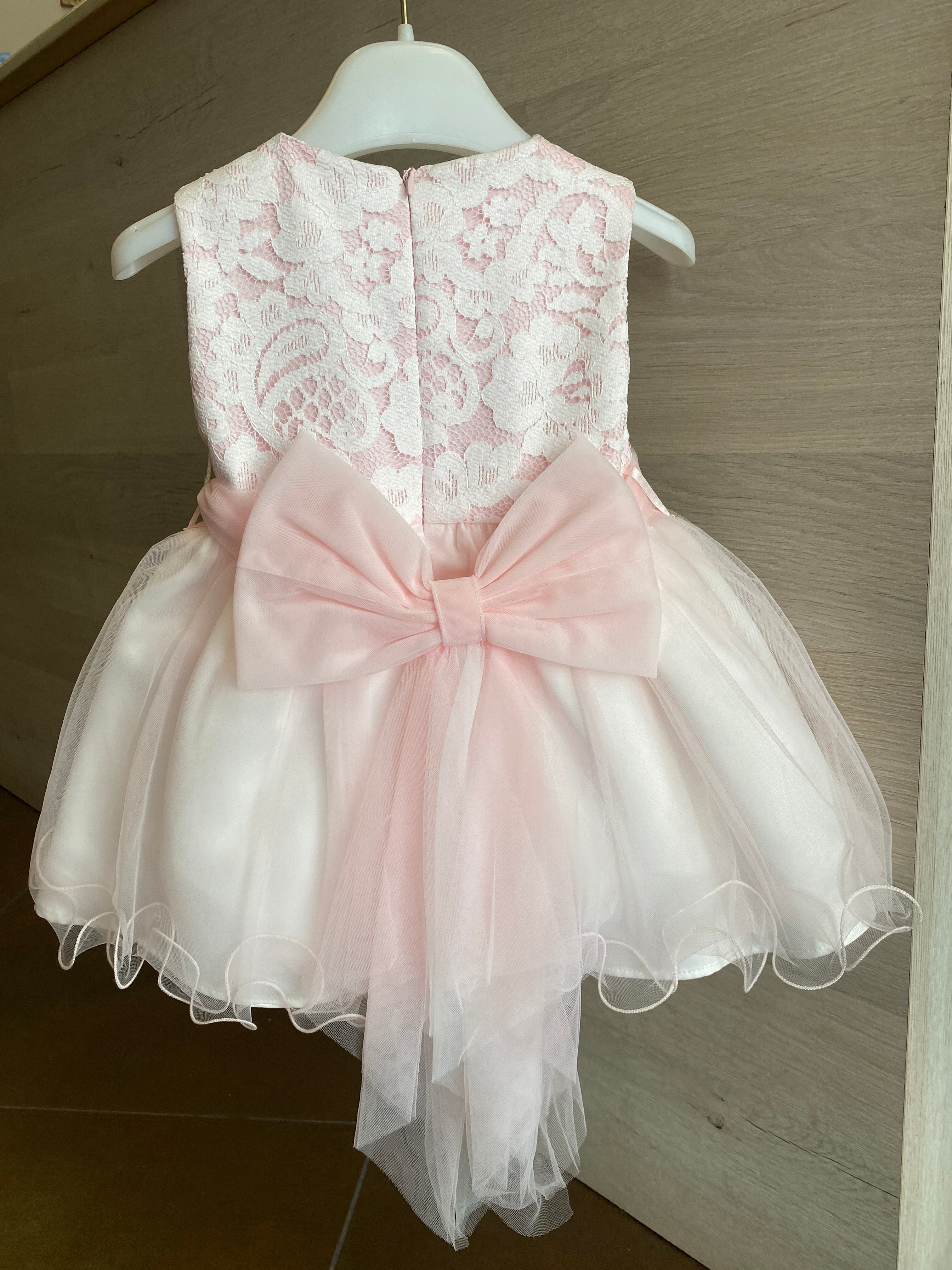 Elegantes rosafarbenes ärmelloses Kleid mit Spitzenoberteil und weitem Organzarock.