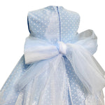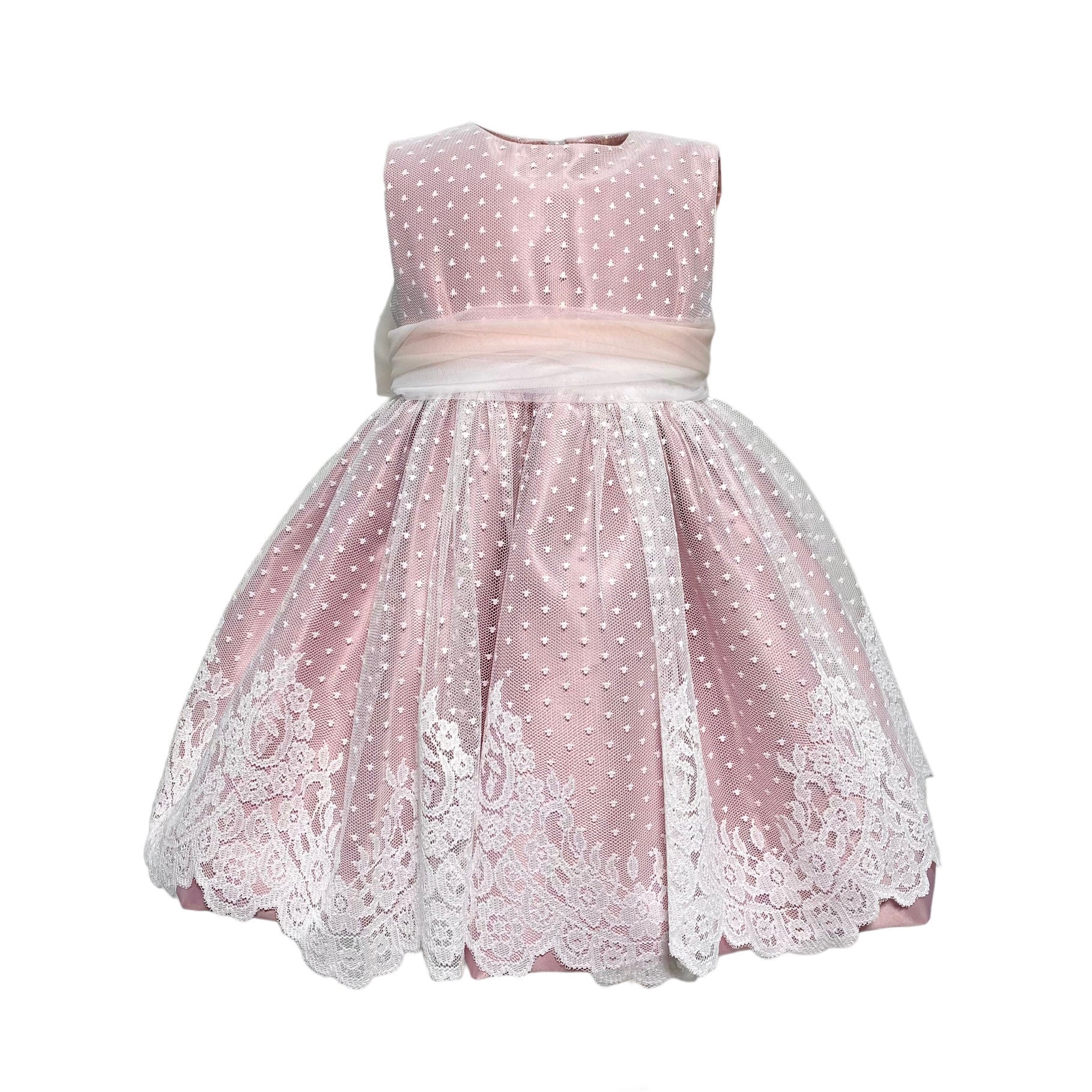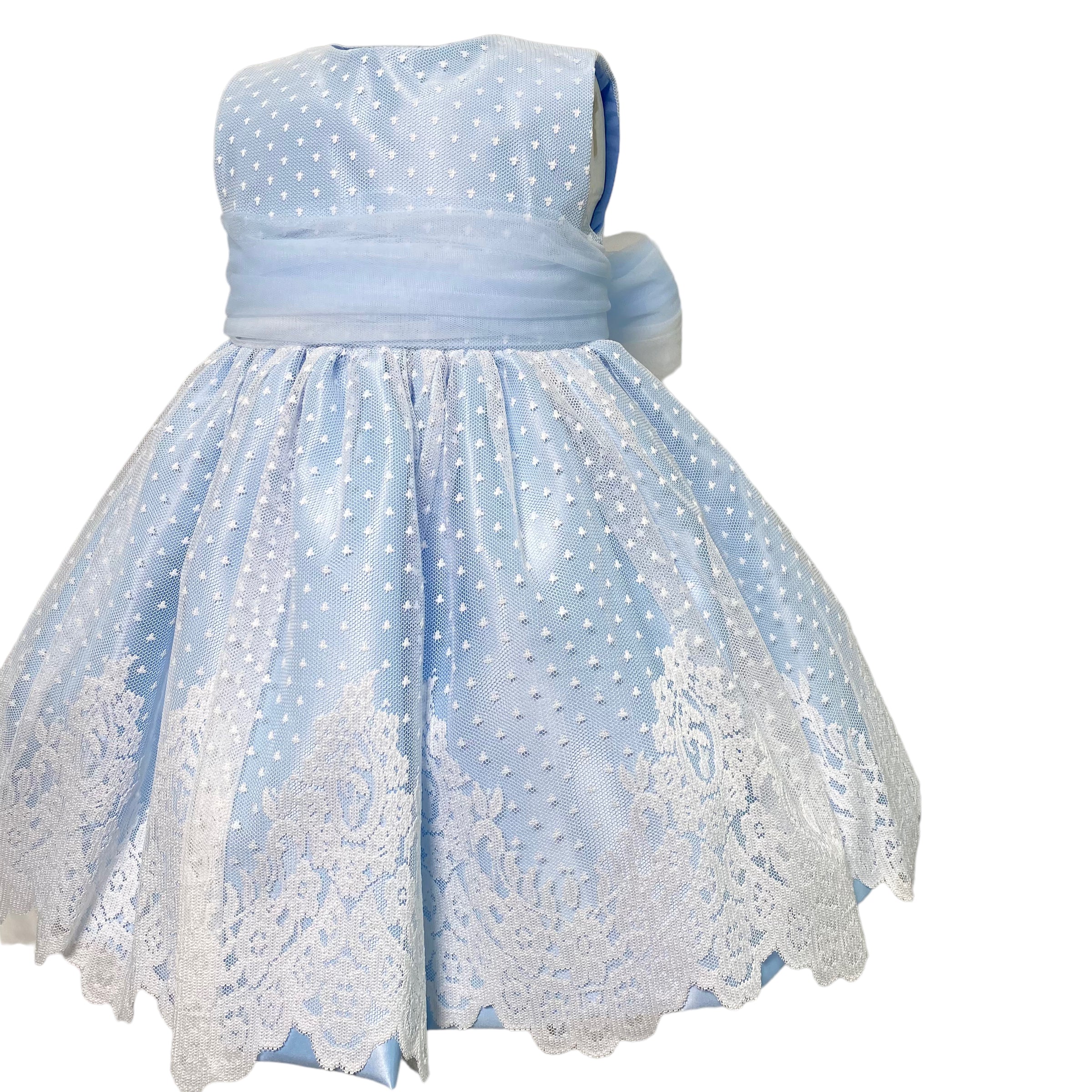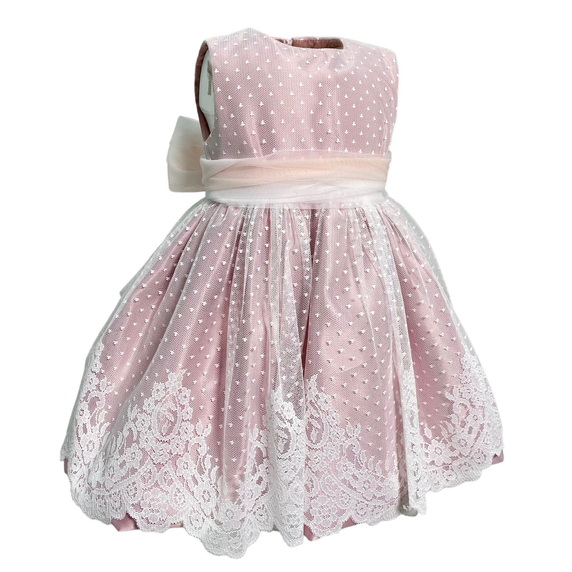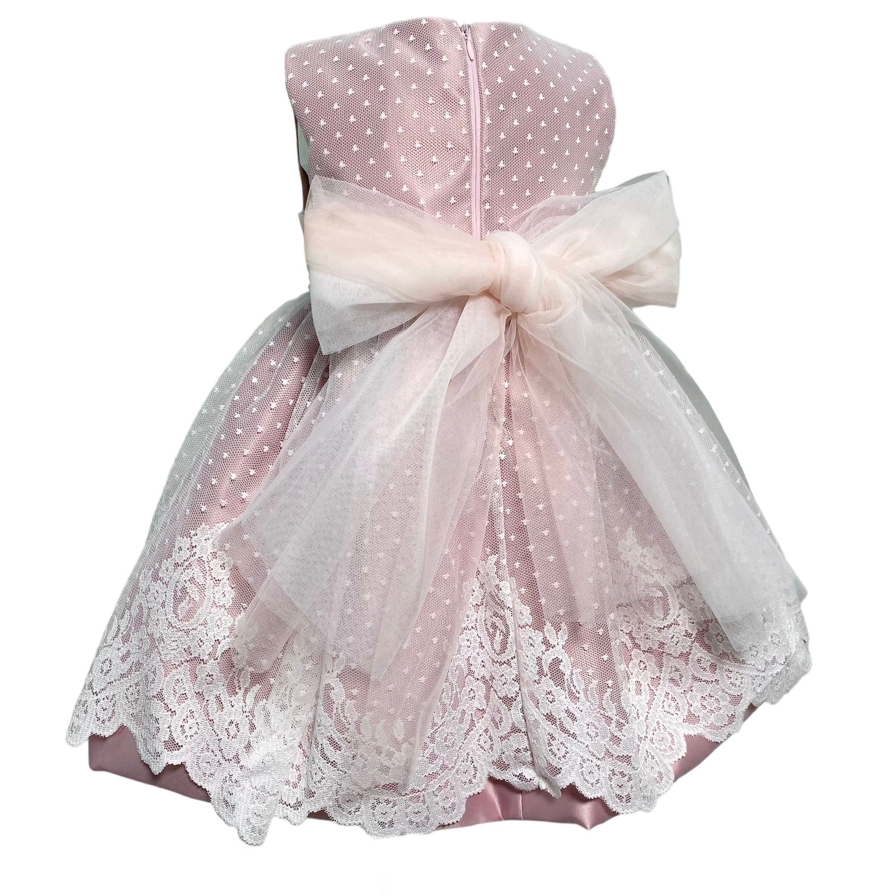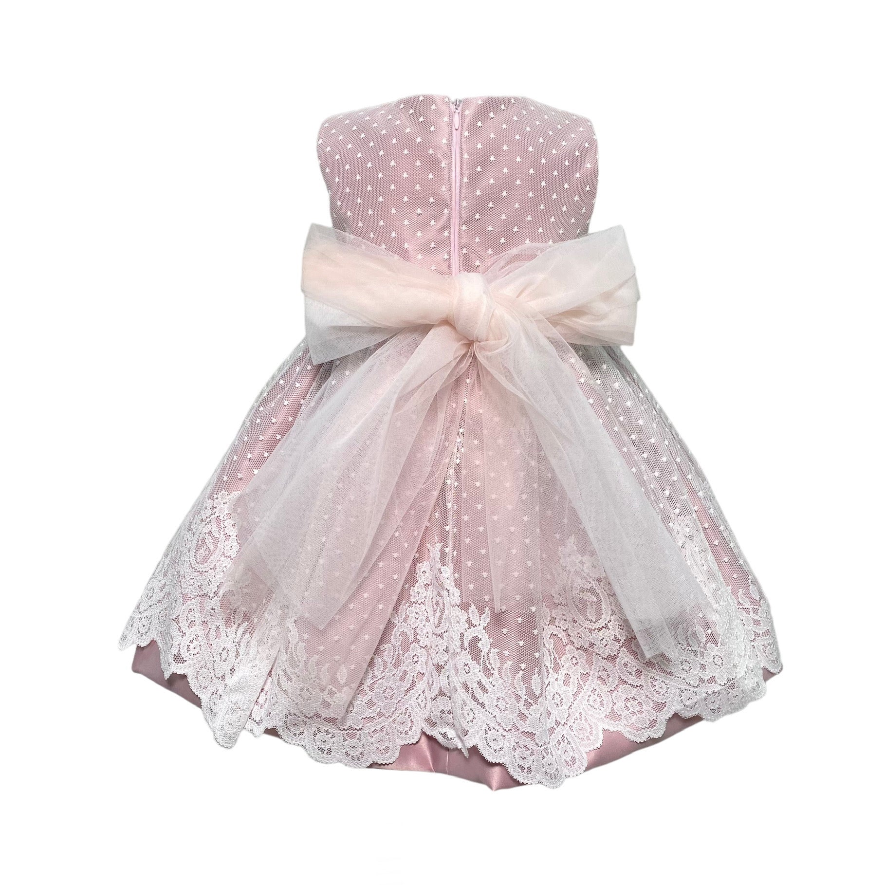 Abito elegante smanicato in raso, ricoperto da tulle puntinato e ricamato sul fondo.