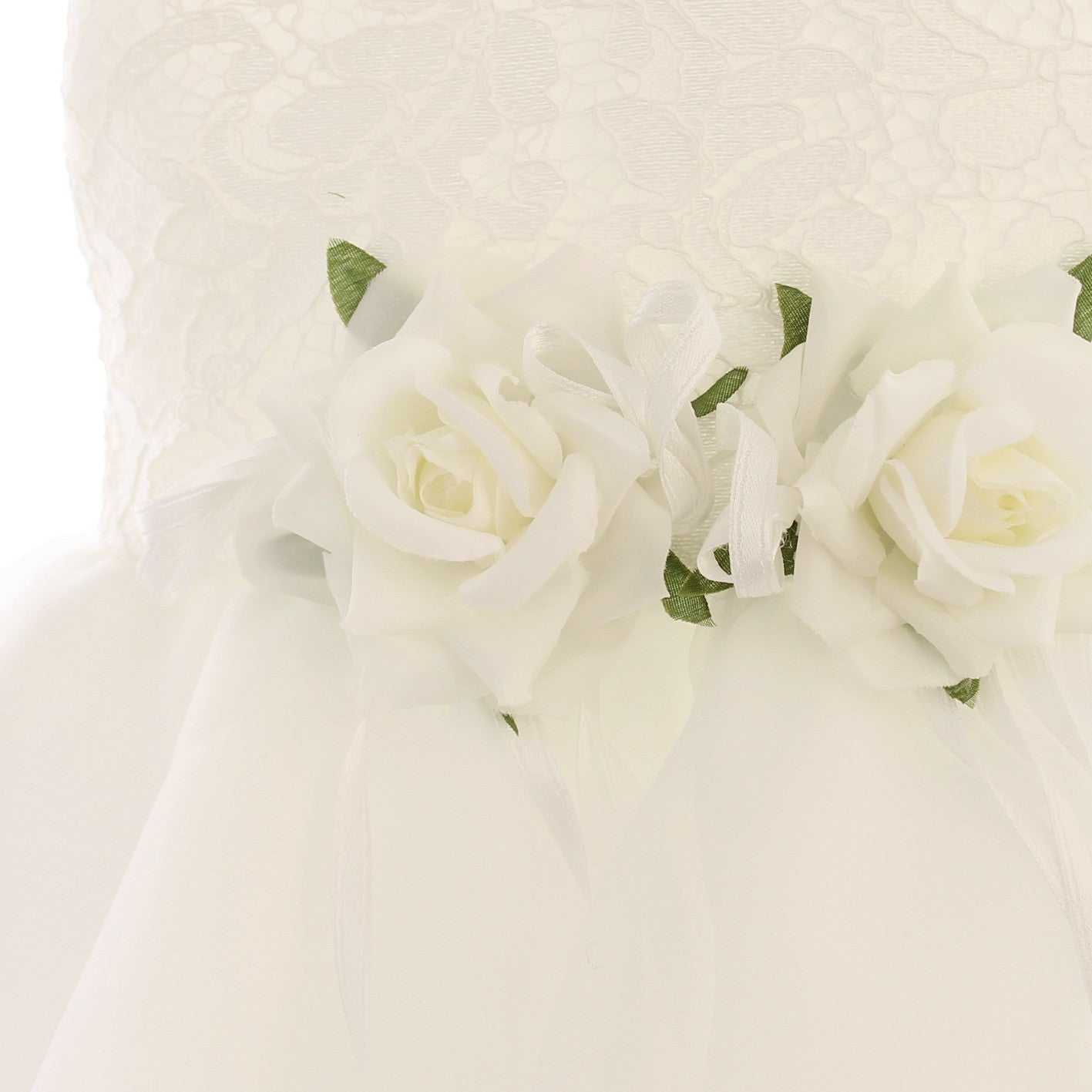 An der Taille verziert mit wunderschönen cremefarbenen Blumen mit Bändern, die einen Hauch von Eleganz verleihen.