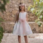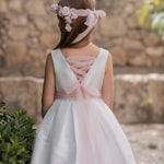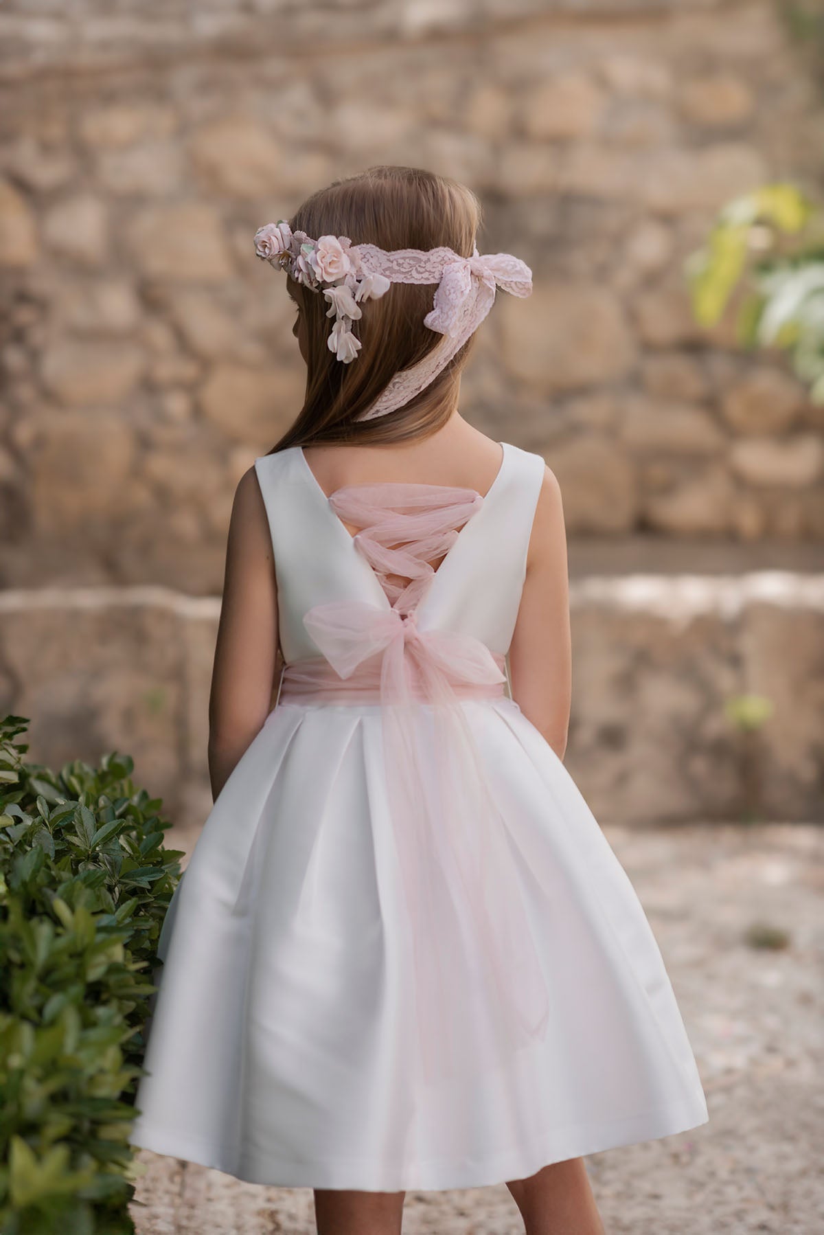 Questo abito In mikado bianco con cintura rosa antico e fiocchettone con fiori centrali è ideale per una cerimonia o un'occasione speciale. Sul retro scollo a V con La particolarità  della chiusura a incrocio con tulle e zip invisibile lo rende elegante e confortevole da indossare. l'abito è foderato internamente per una vestibilità perfetta.