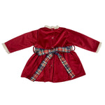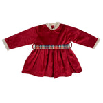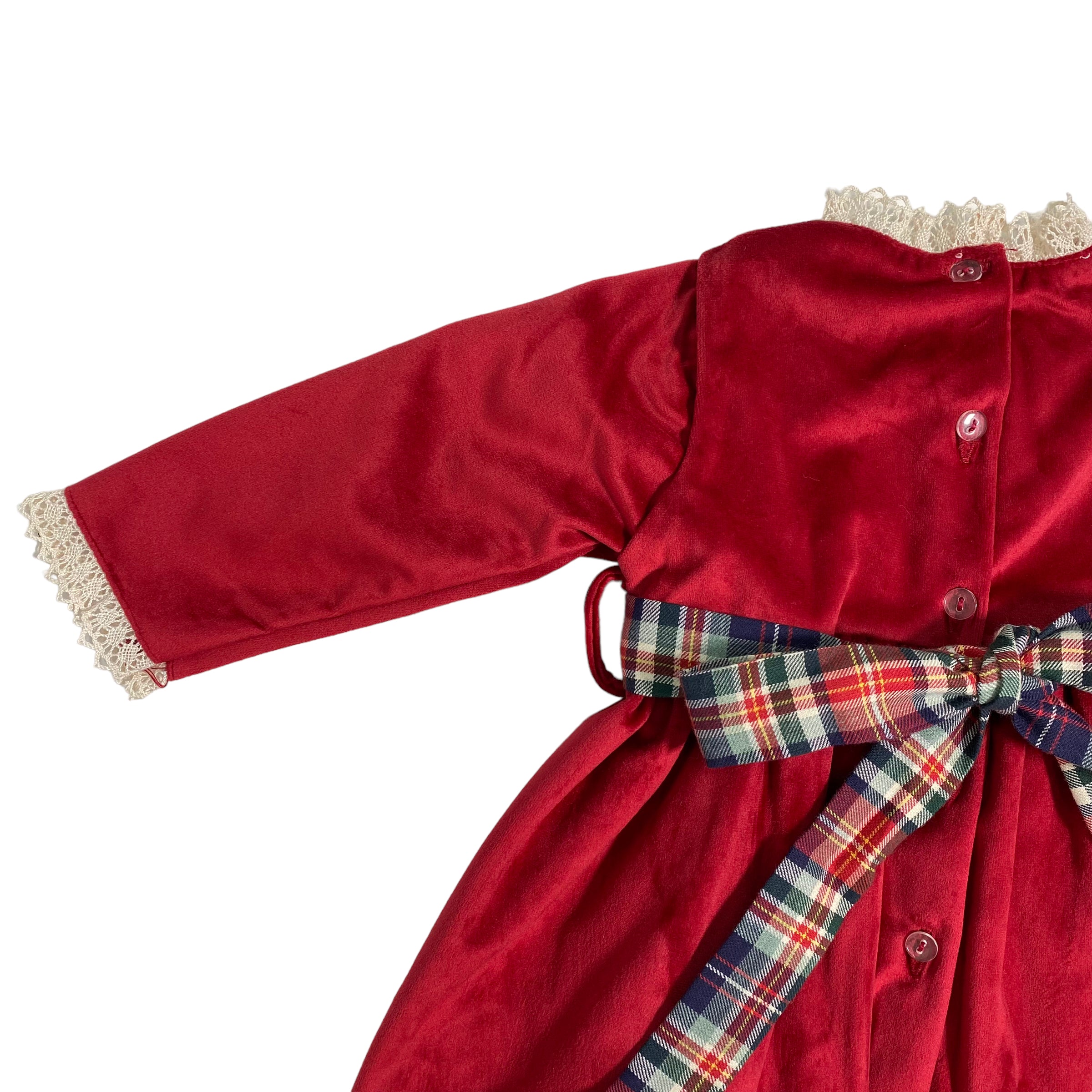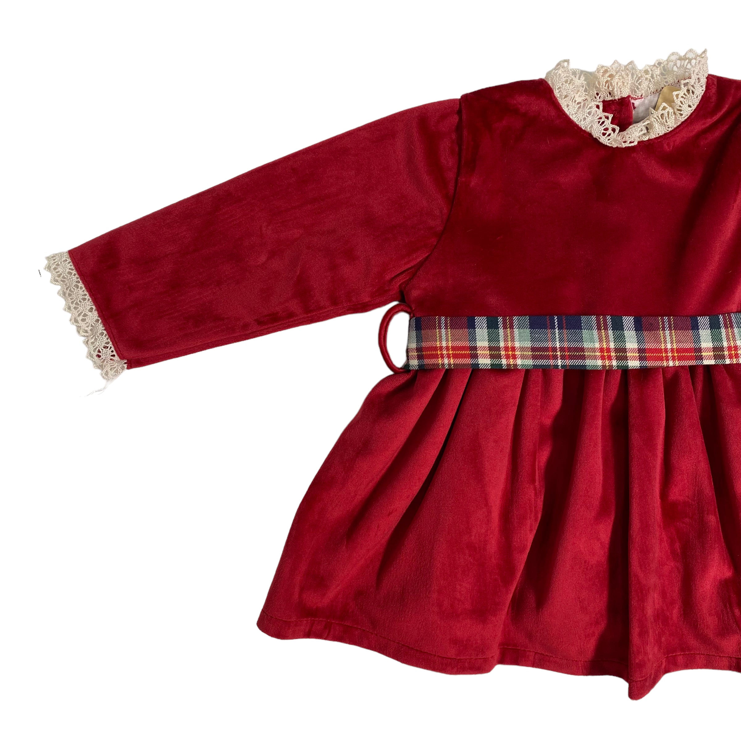 Abito manica lunga in velluto ,rifinito sul girocollo e all'estremità della manica con pizzo panna ,cintura in vita scozzese con fiocco sul retro