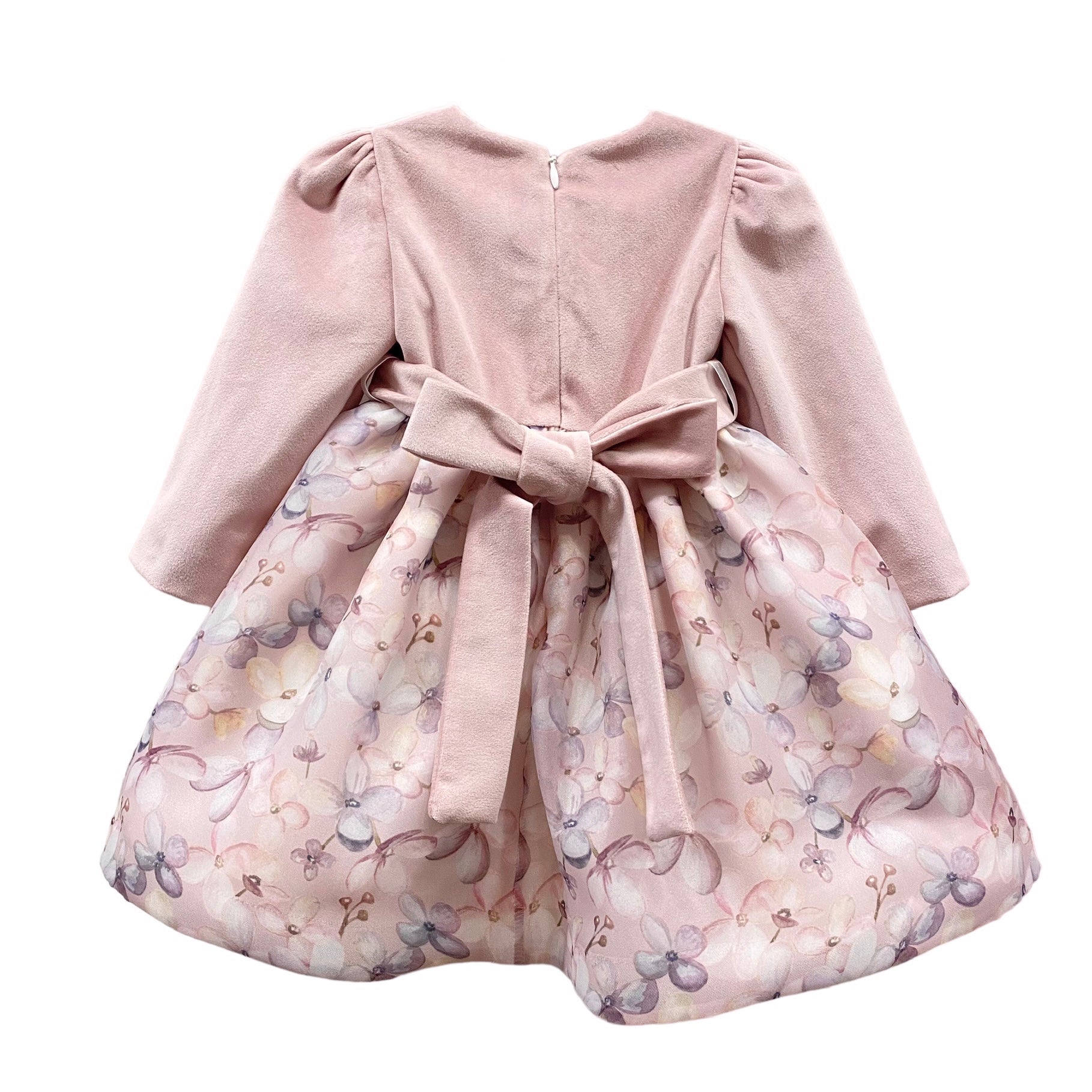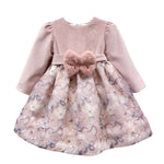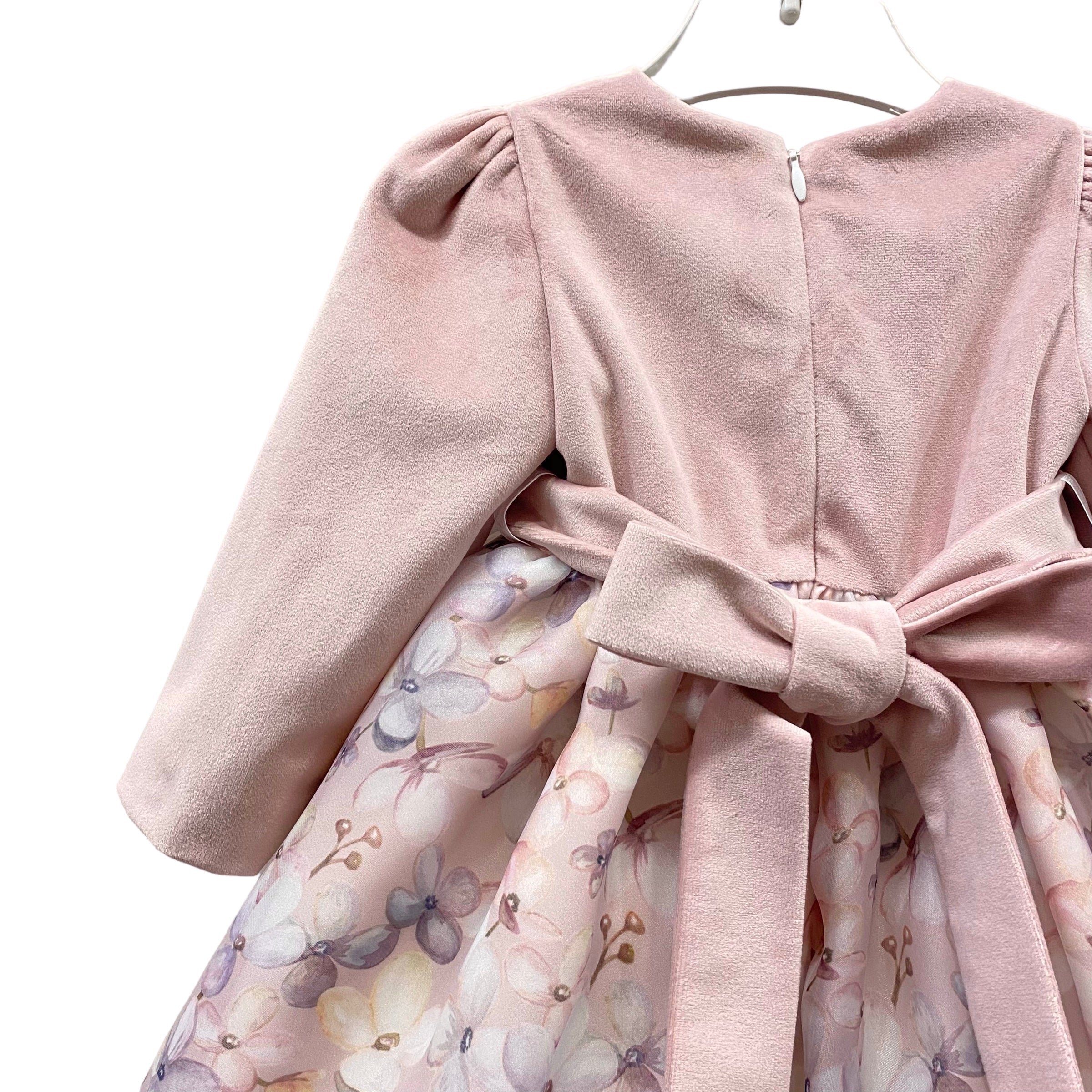 Langärmliges Kleid mit Samtoberteil und weitem Blumenrock.