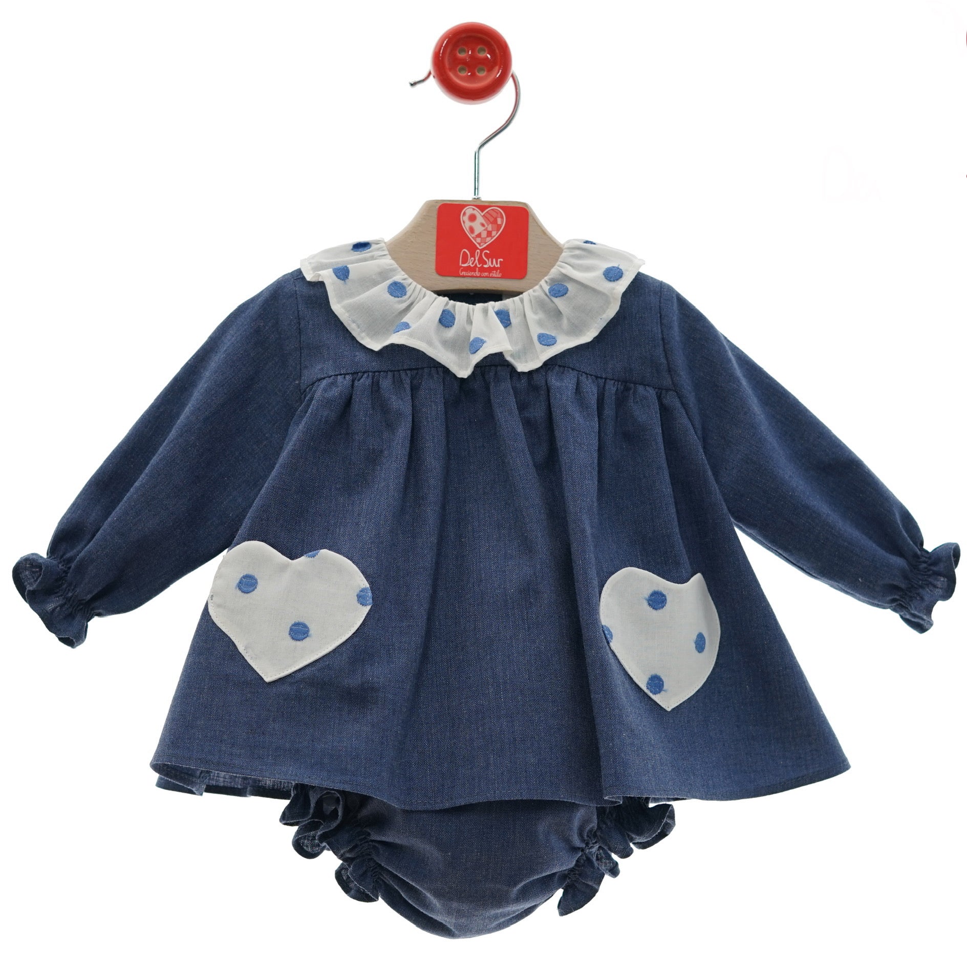 Questo Abito Neonata DEL SUR con culotte, manica lunga, collo squadrato e applicazione di rouche scozzese sul petto è elegante e raffinato. Il tessuto in velluto lo rende ancora più sofisticato, perfetto per un'occasione speciale.
