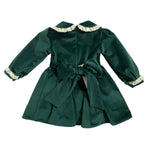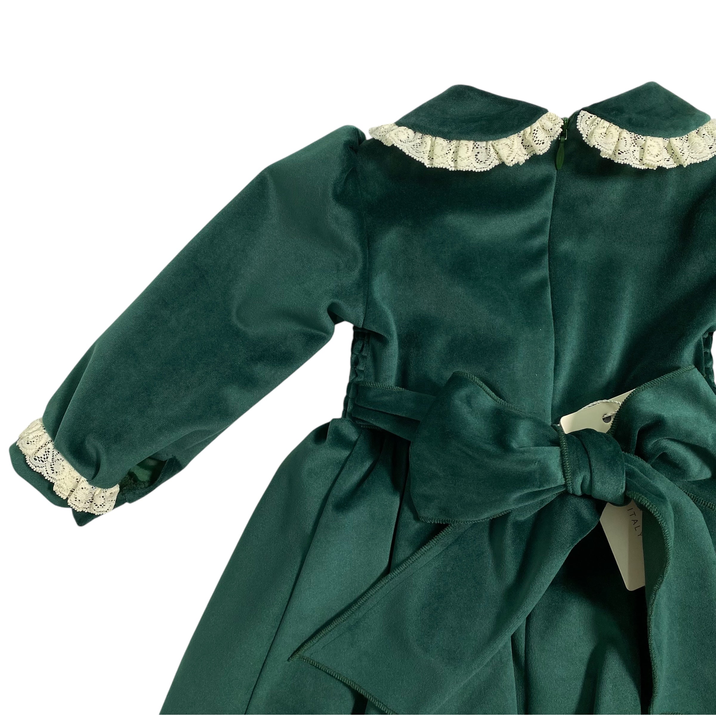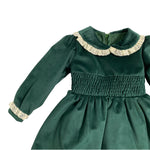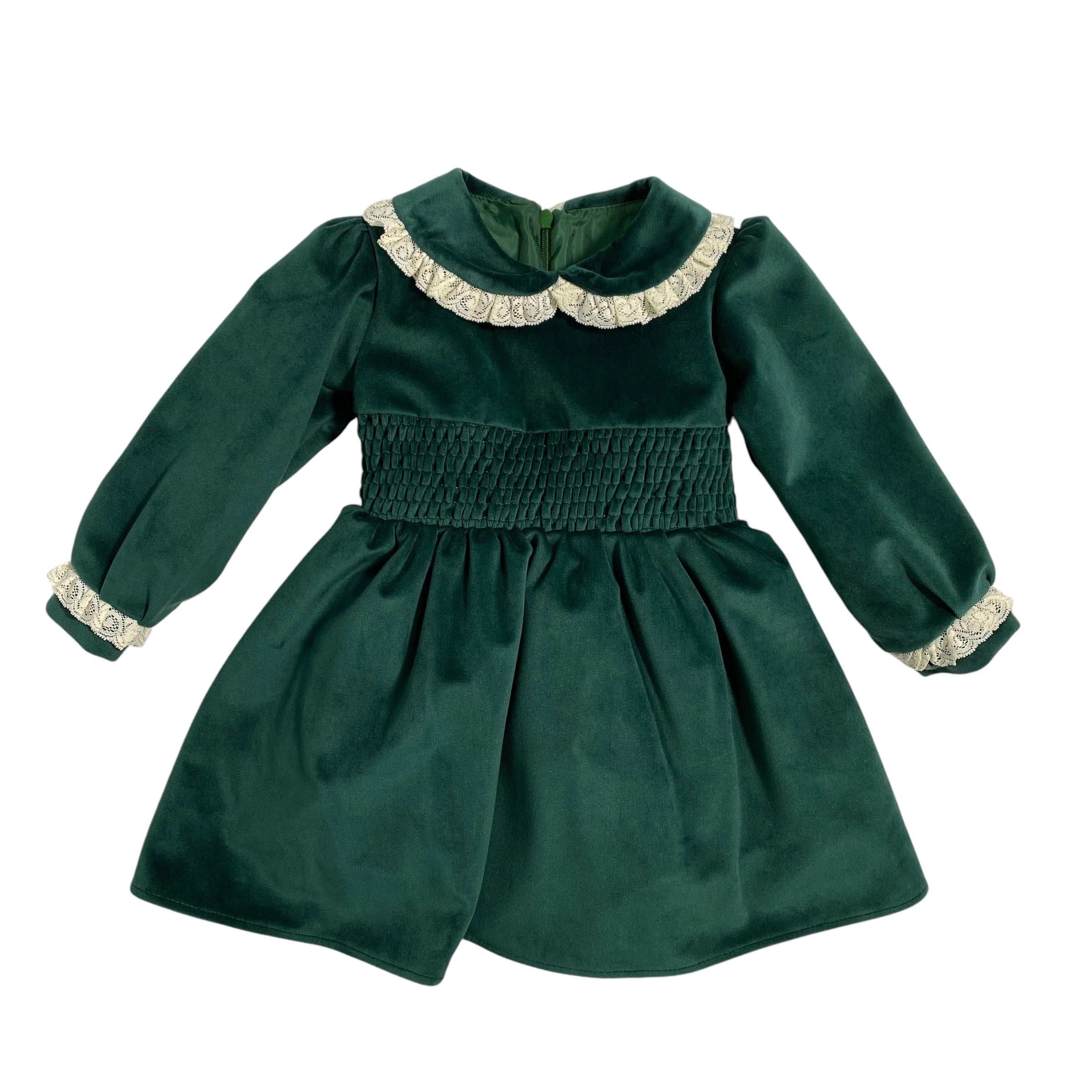 Un abito manica lunga in velluto per neonate, perfetto per un'occasione speciale. Caratterizzato da un elegante collo tondo con pizzo e una delicata arricciatura sul petto. Stile alla moda per le piccole fashioniste.