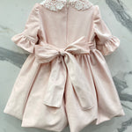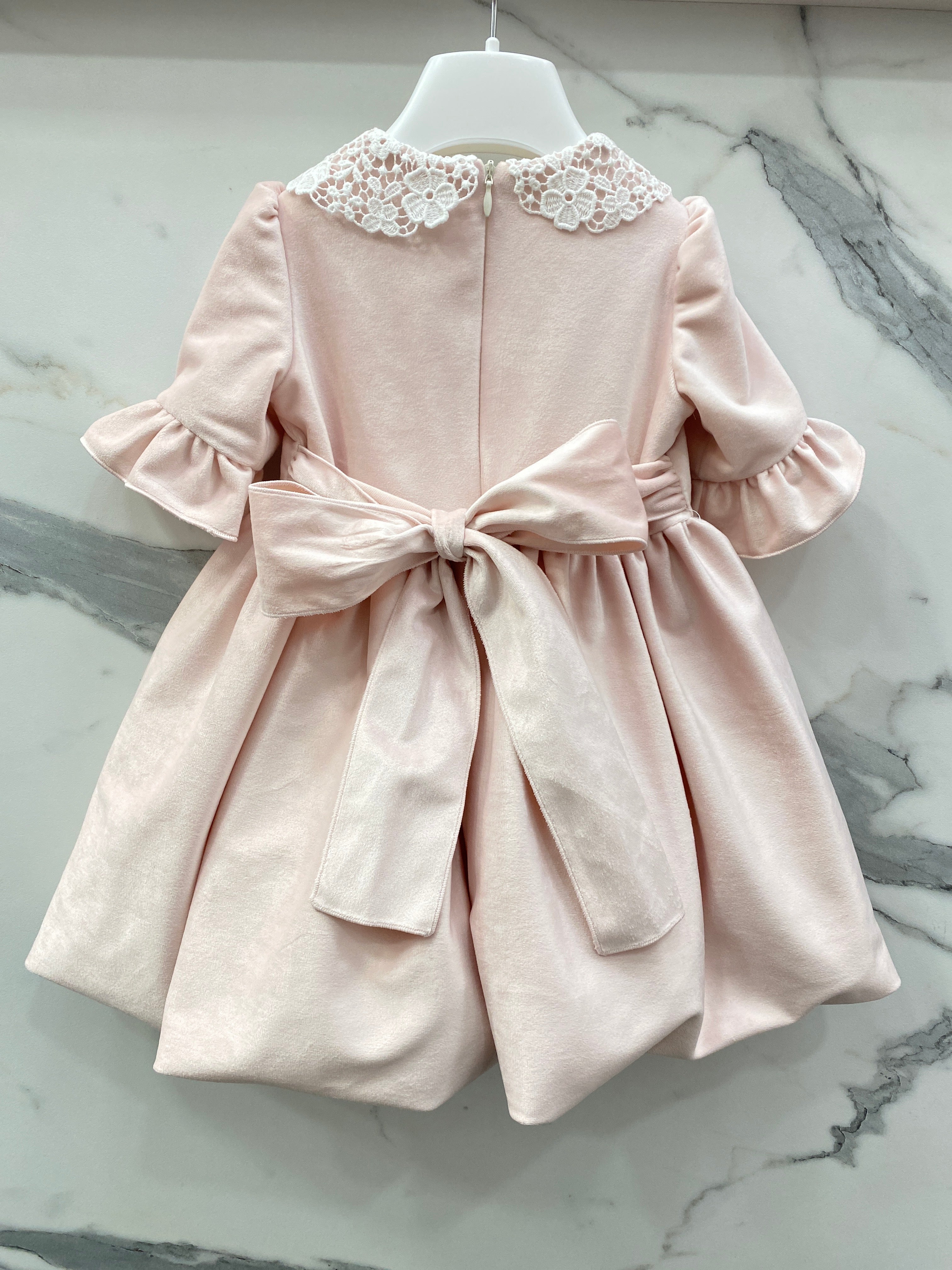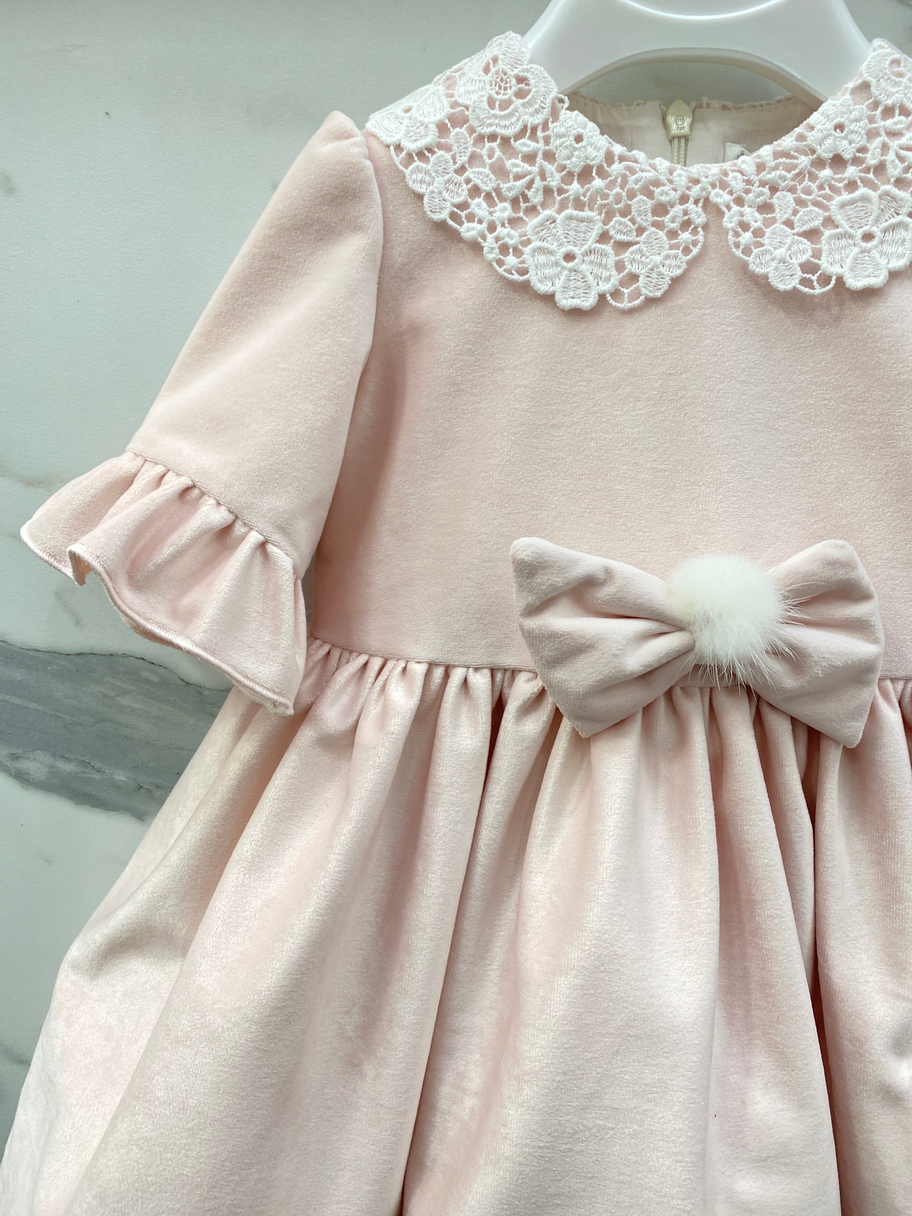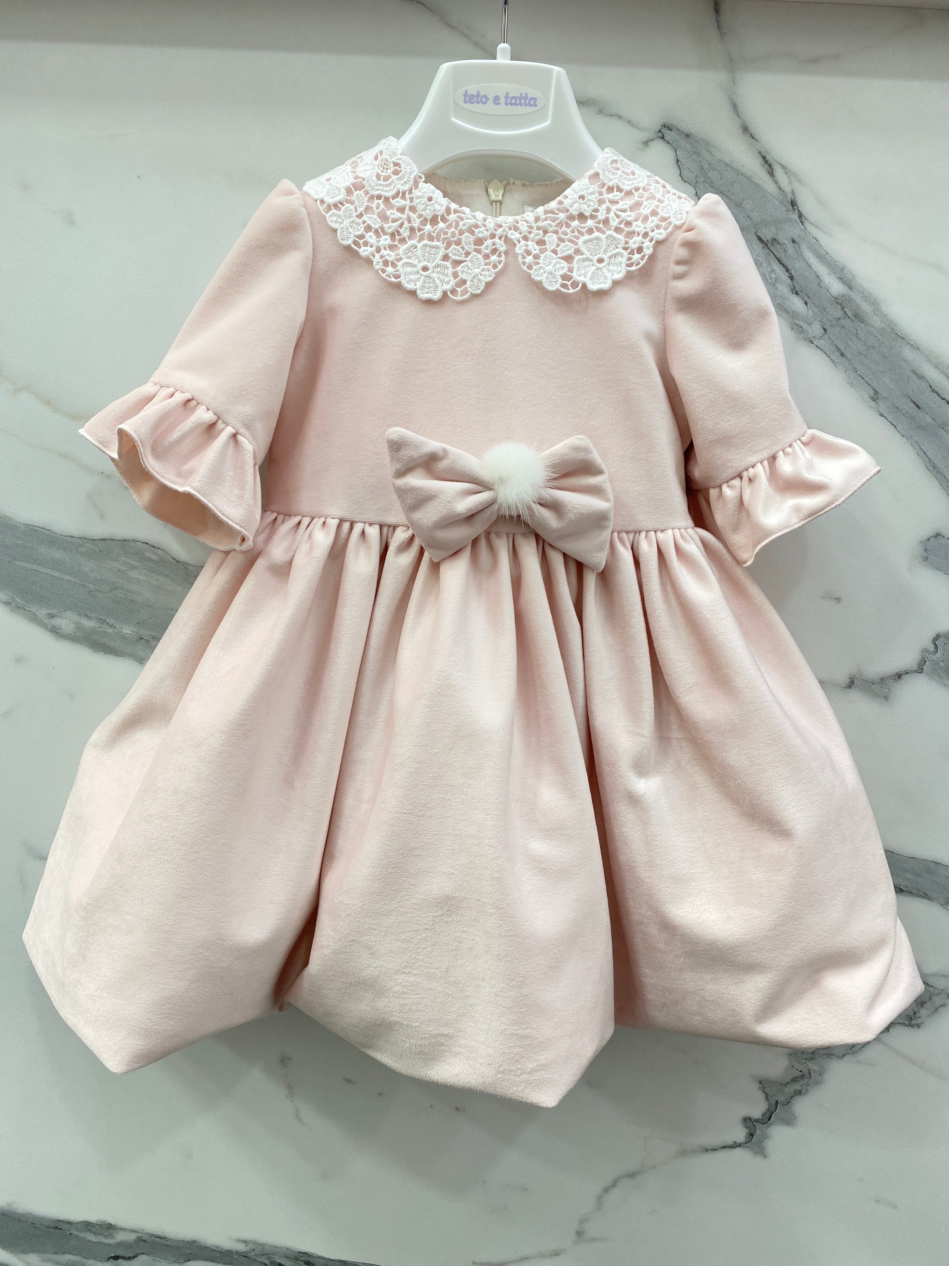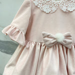 Questo abito elegante è perfetto per le occasioni speciali della tua neonata. Realizzato in morbido velluto, vanta una manica corta e un grazioso colletto in pizzo. La fascia in vita con fiocco con pom pon aggiunge un tocco di eleganza, rendendo questo abito un must-have per il guardaroba della tua bimba.