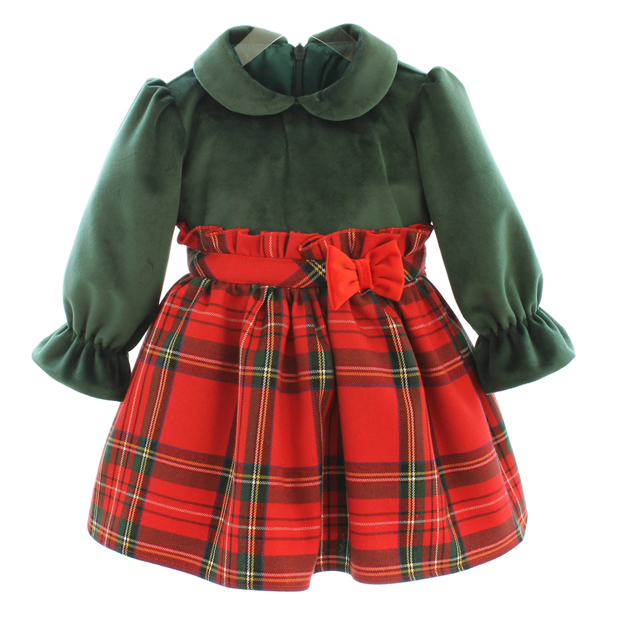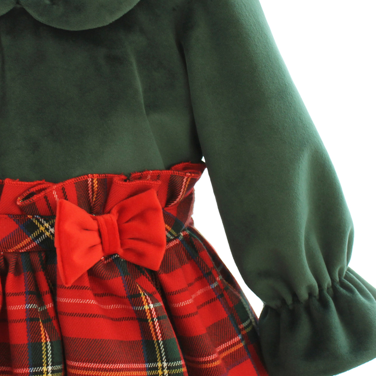Langärmliges Kleid mit grünem Samtoberteil und weitem Schottenrock.