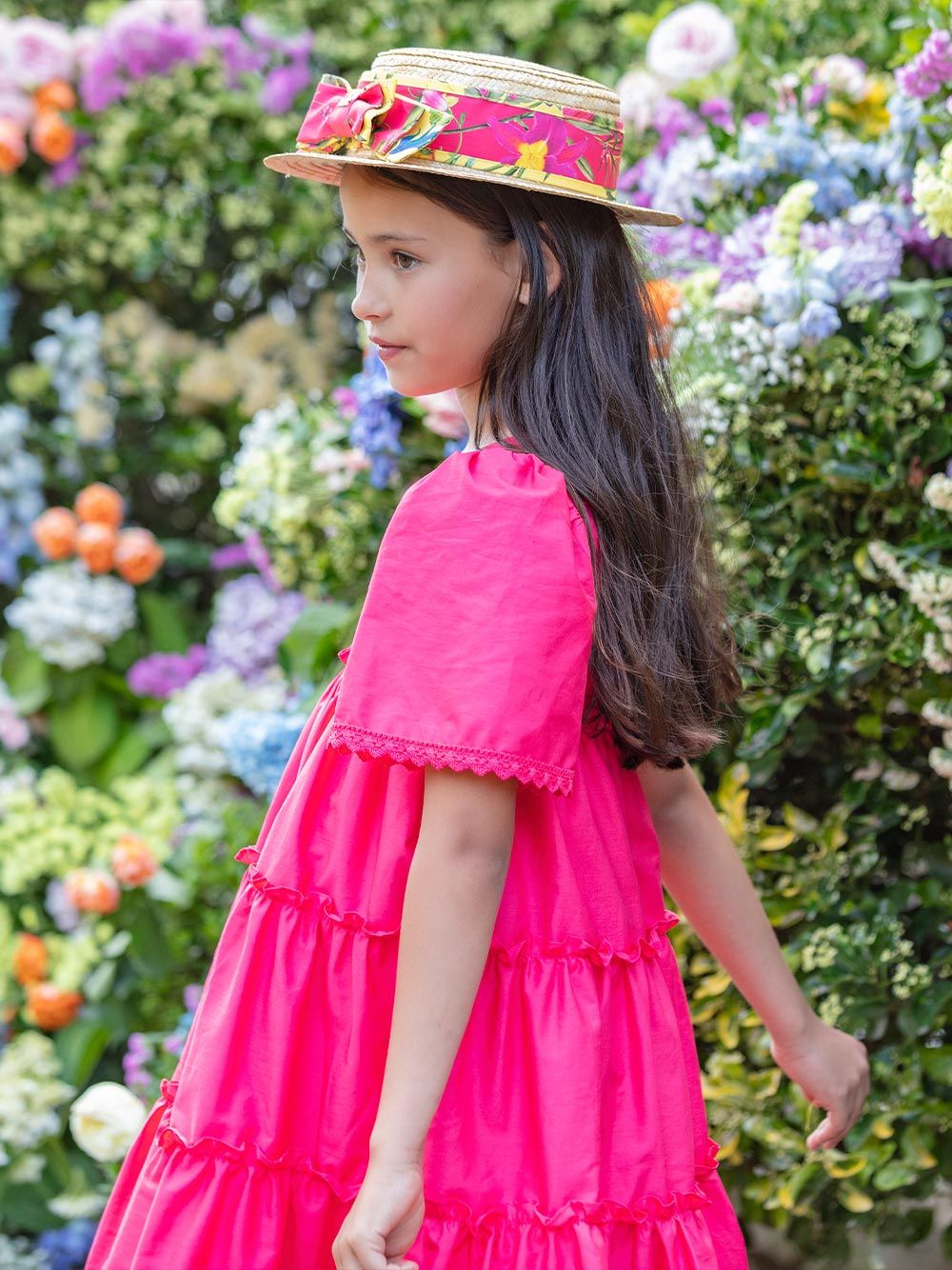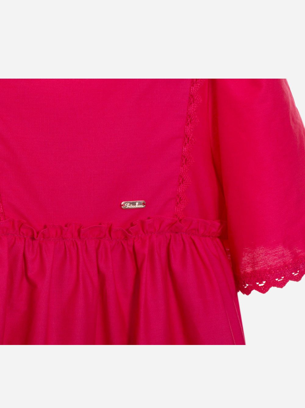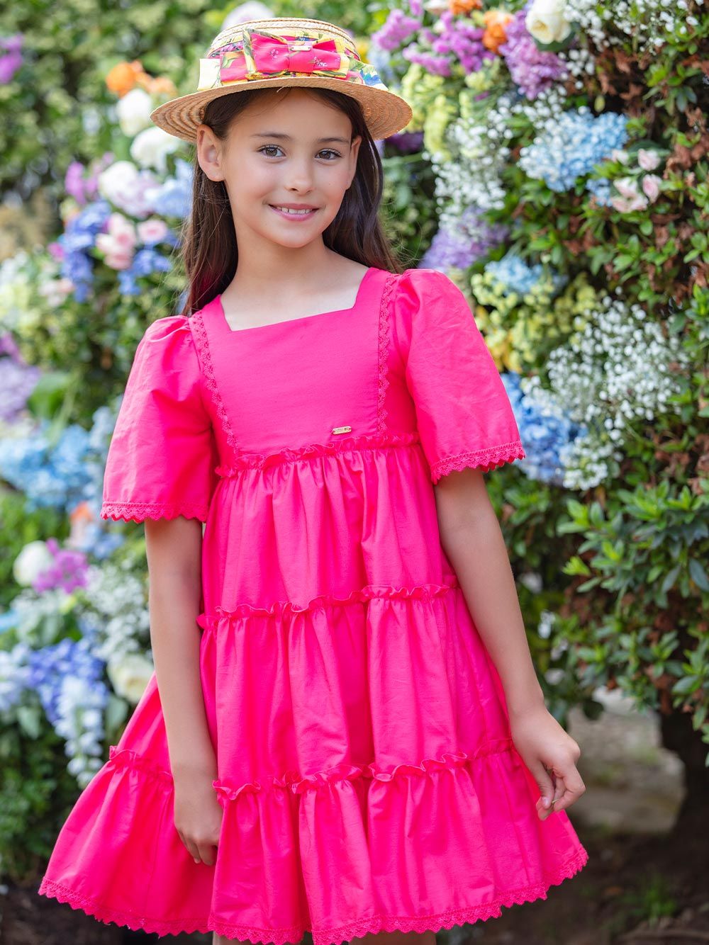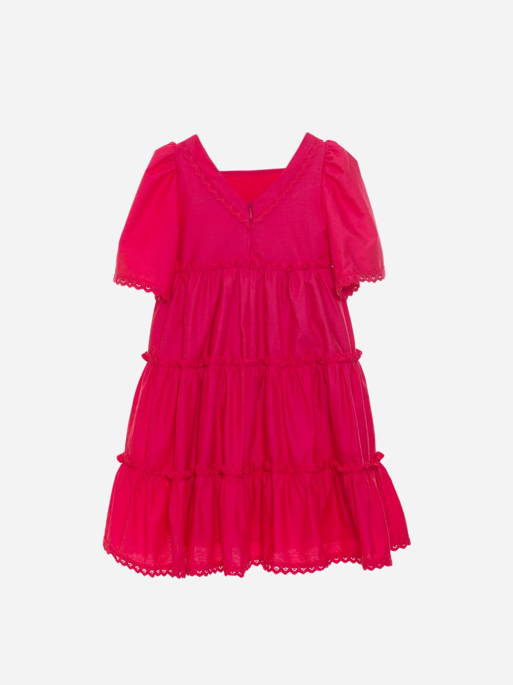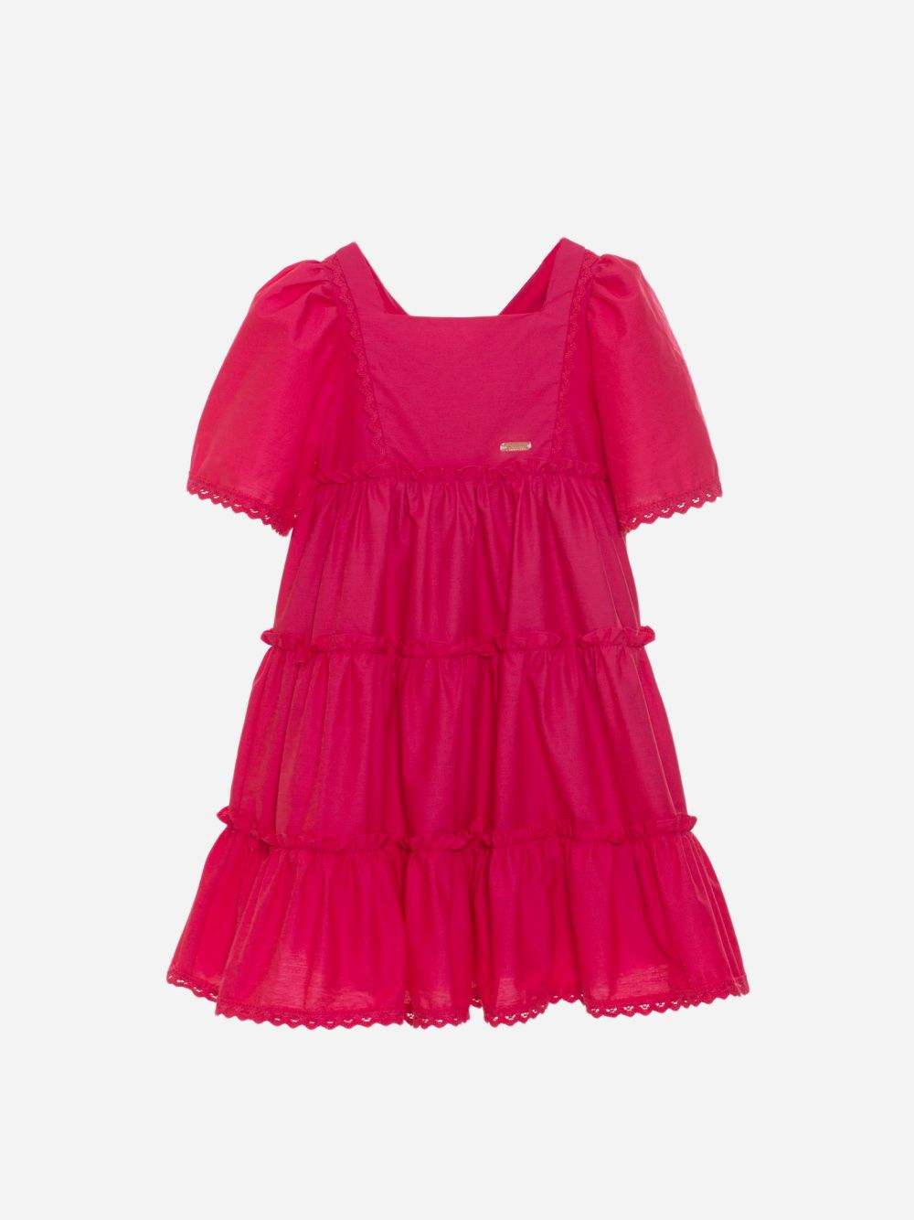 Entzückendes fuchsiafarbenes Kleid für Mädchen von Patachou aus Popeline mit mehrlagigem Rock.