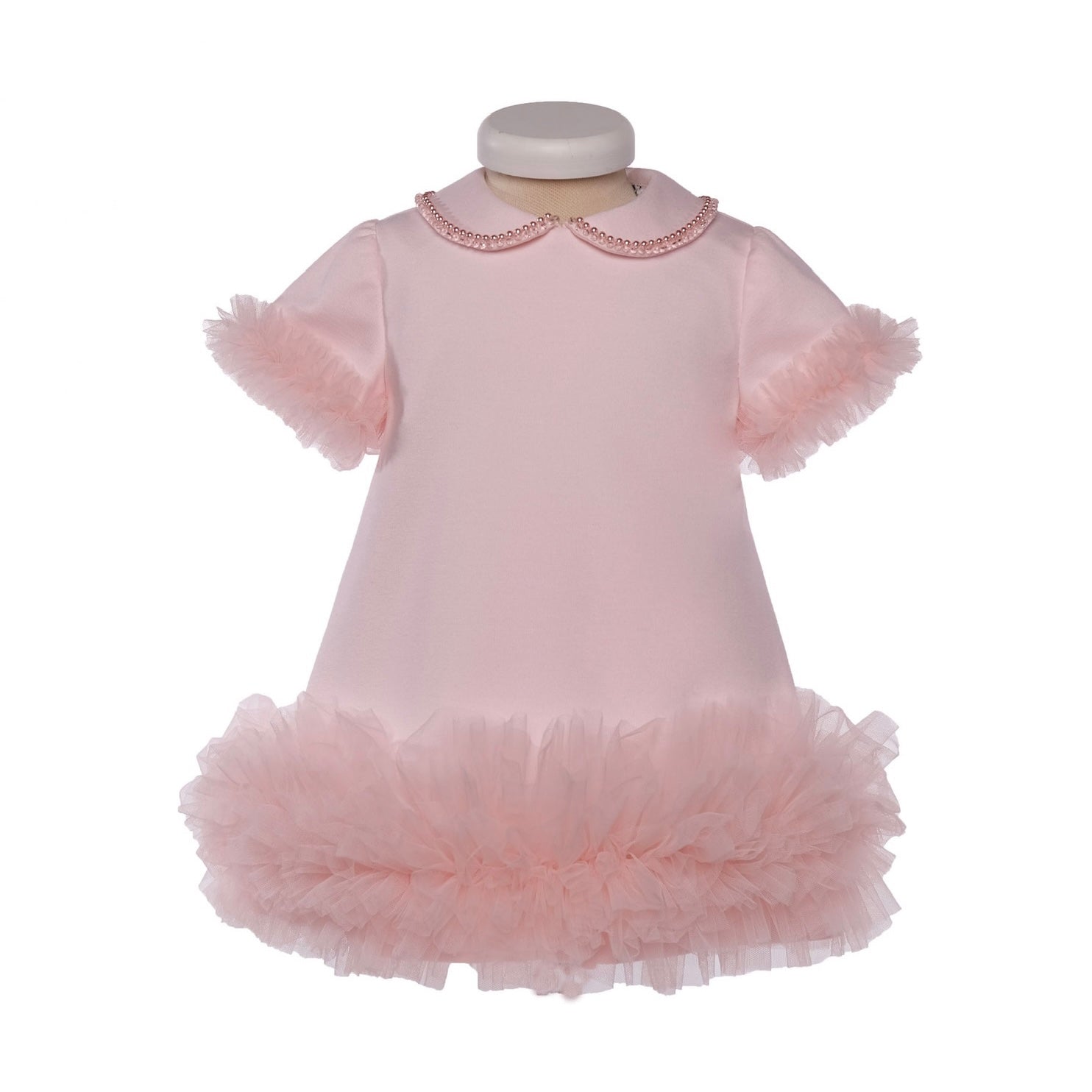 Halbärmeliges Kleid im Milano-Stich mit Tüllapplikationen am unteren Rockrand und an den Ärmeln.