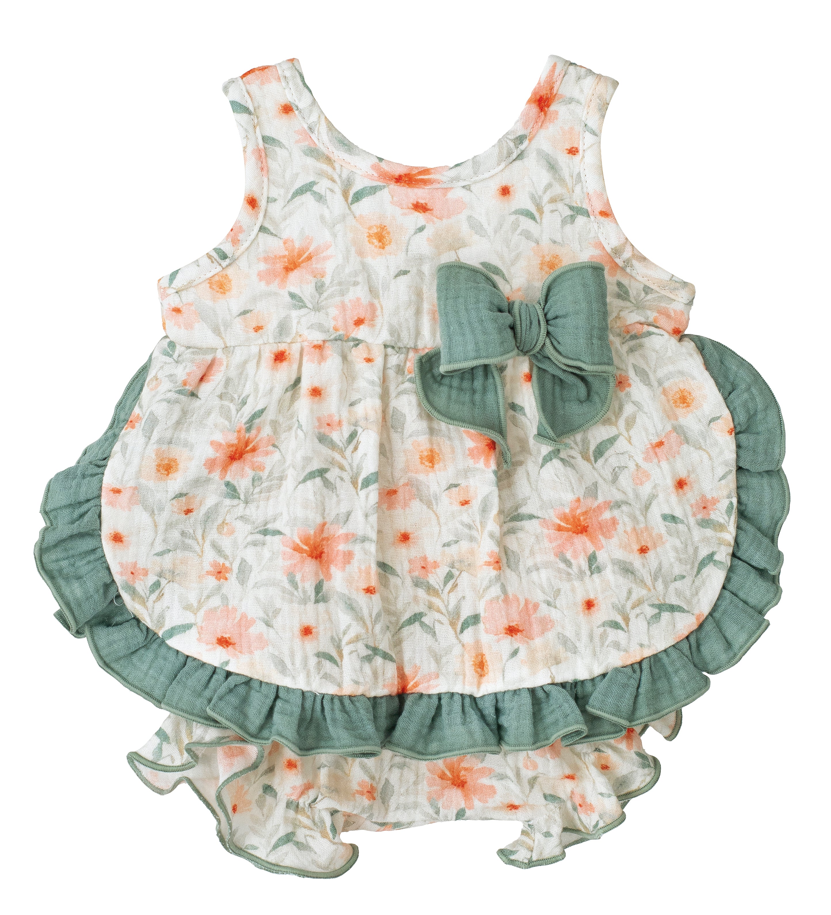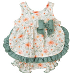 Realizzato in morbido cotone, questo abito smanicato CALAMARO 22078 è perfetto per le neonate. La culotte fantasia floreale multicolor, con i dettagli verde fiocchetto sul corpetto, dona un tocco vivace e allegro. Ideale per i giorni caldi, questo abito ti permetterà di vestire la tua bambina con comfort e stile.