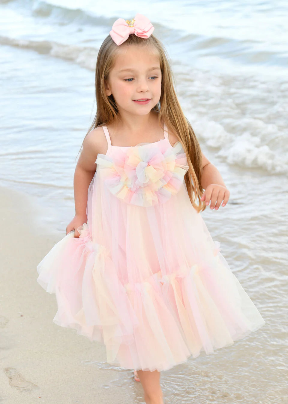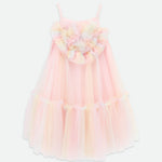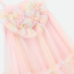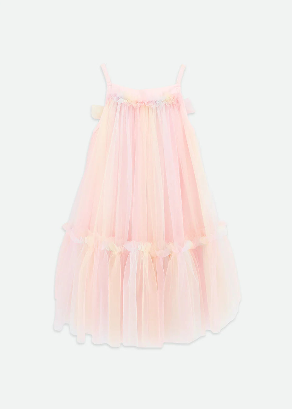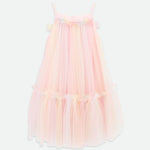 Elegante prendisole a trapezio in morbido tulle con effetto arcobaleno per bambine. Dettagliato con una rosetta in tulle sul petto e un bordo arricciato attorno alla gonna. Completamente foderato in un cotone super morbido per garantire il massimo comfort sulla pelle delicata.