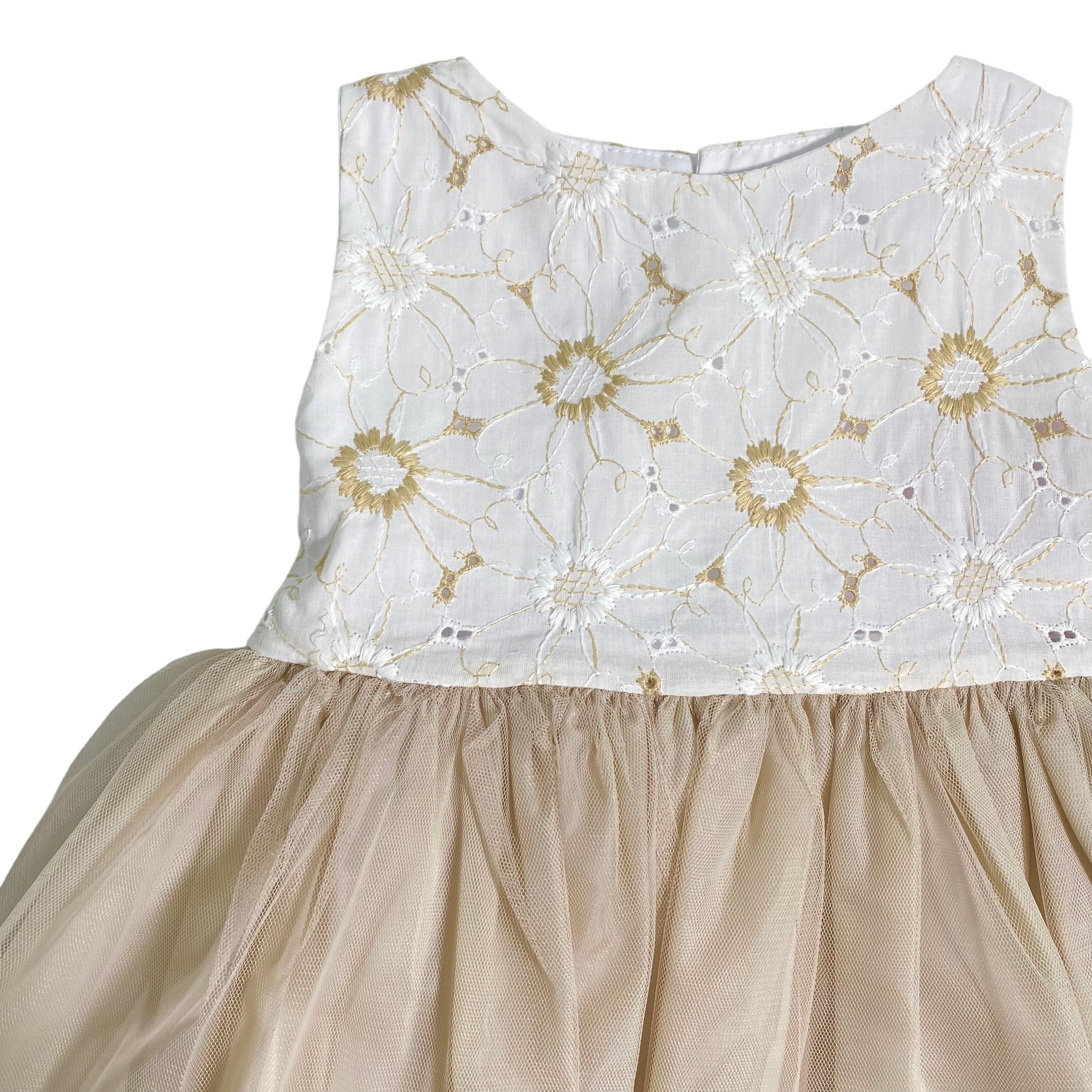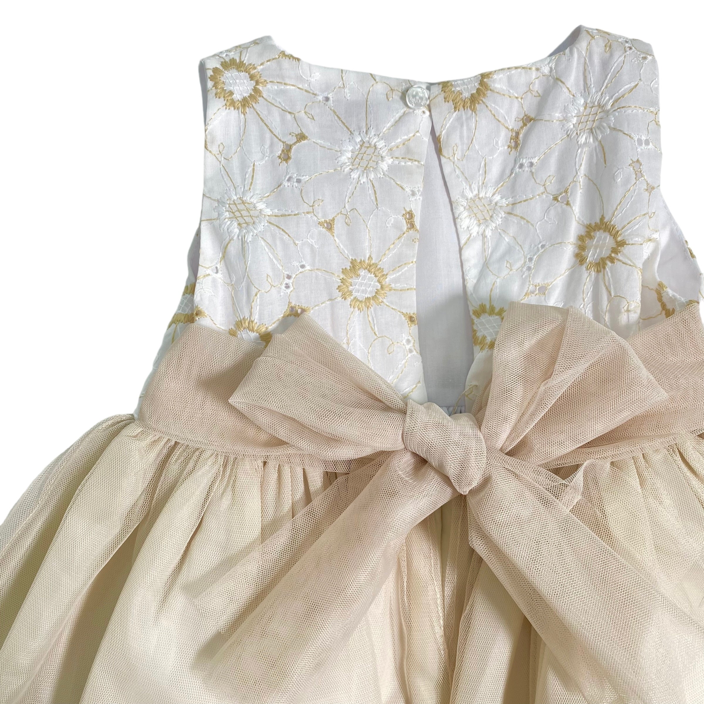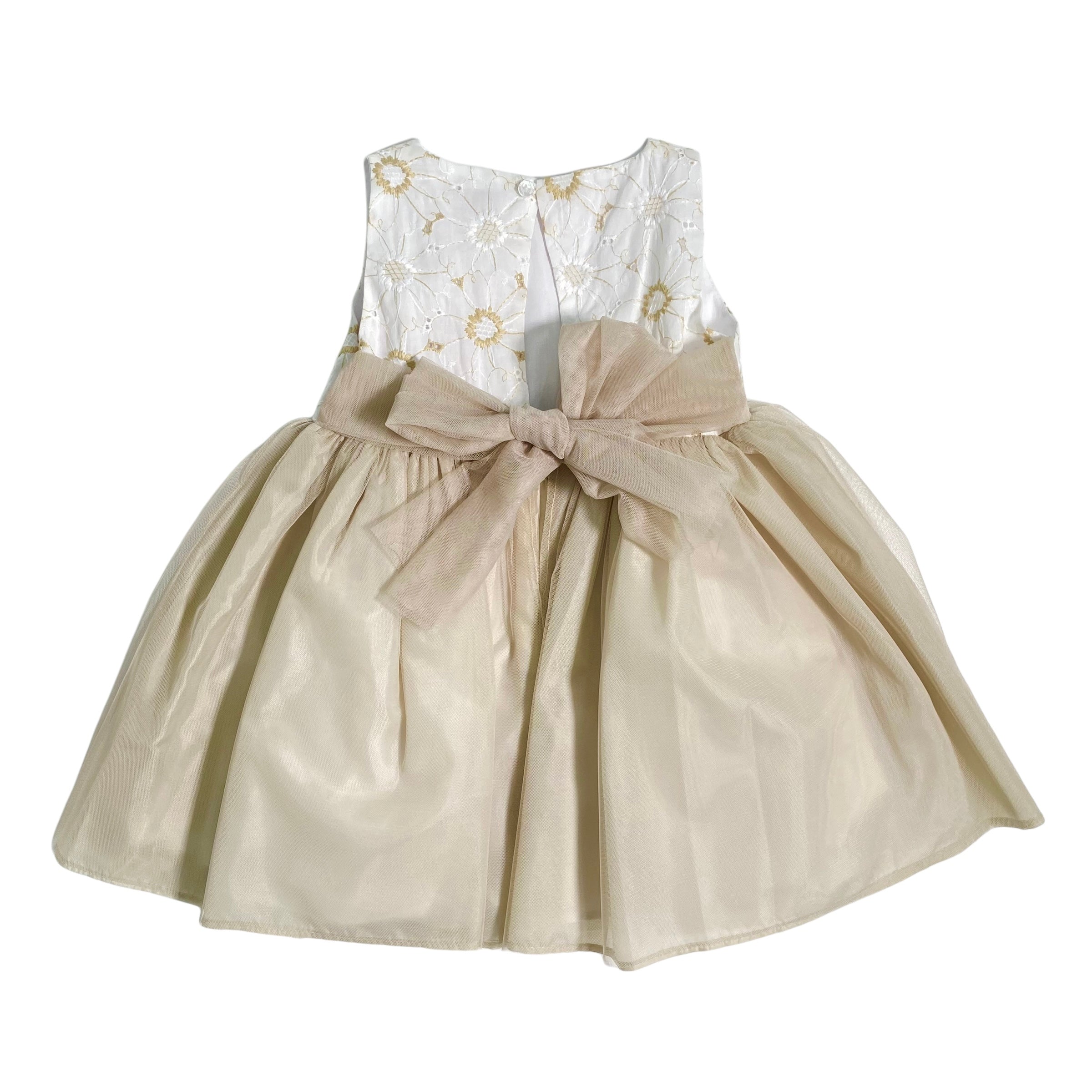 Questo abito smanicato per bambina è elegante e raffinato. Il corpetto in pizzo San Gallo dona un tocco di classe, mentre la gonna in tulle dona movimento e leggerezza. Lo scollo sulla schiena e il fiocco sul retro lo rendono ancora più grazioso. Realizzato in morbido cotone per il massimo comfort.