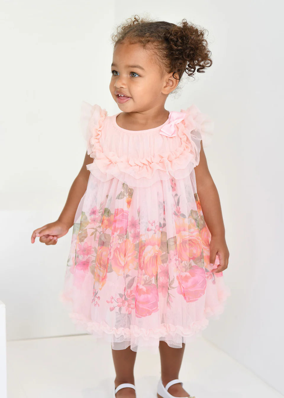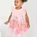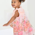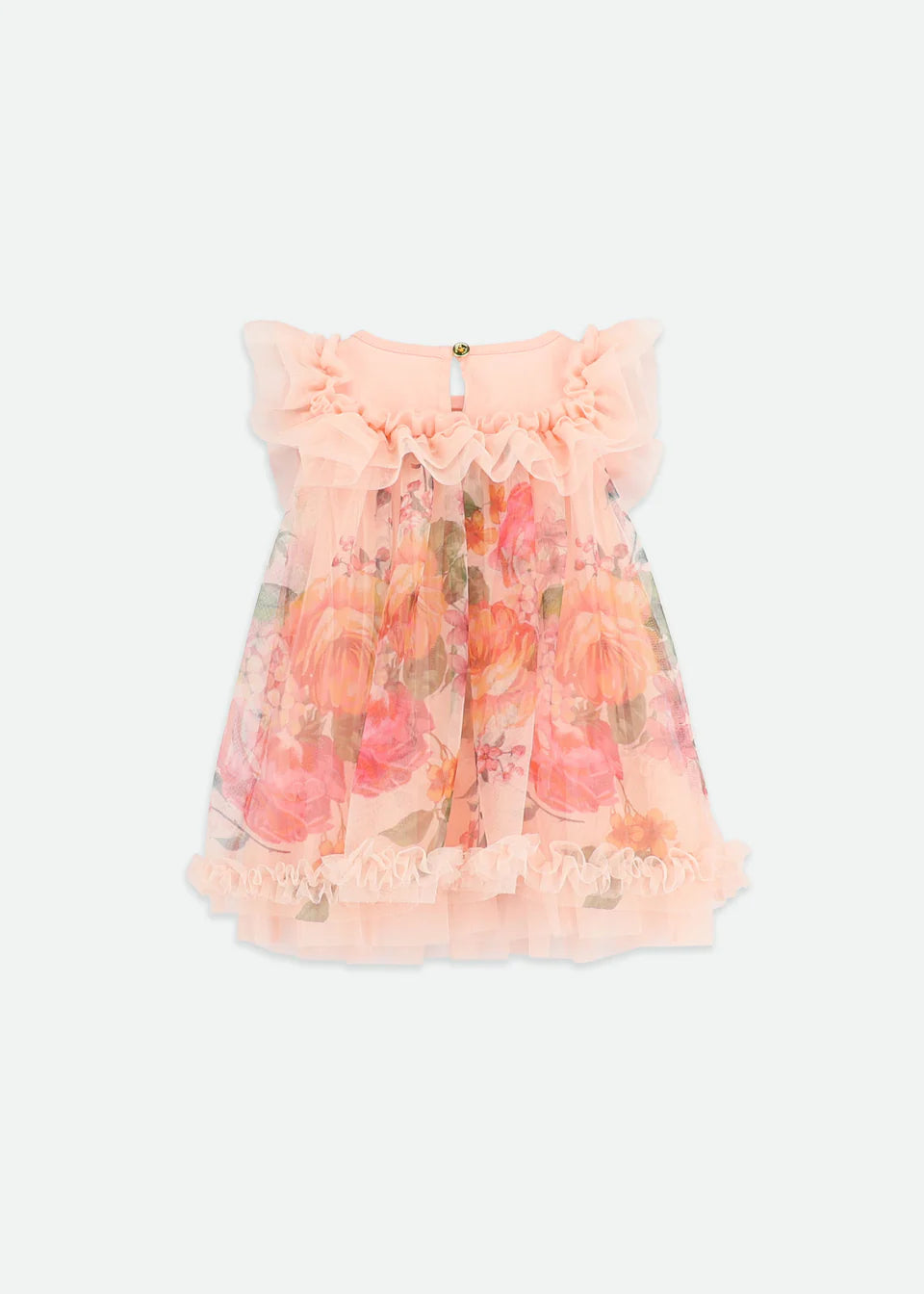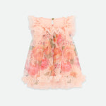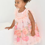 Abito voluminoso per bambina color pesca. Realizzato con la nostra adorabile stampa floreale della nuova stagione, con una morbidissima fodera per un comfort extra. L'abito presenta un carré frontale con volant in tulle, una scollatura a balze e il nostro caratteristico fiocco. Chiusura sul retro con bottone dorato con logo.