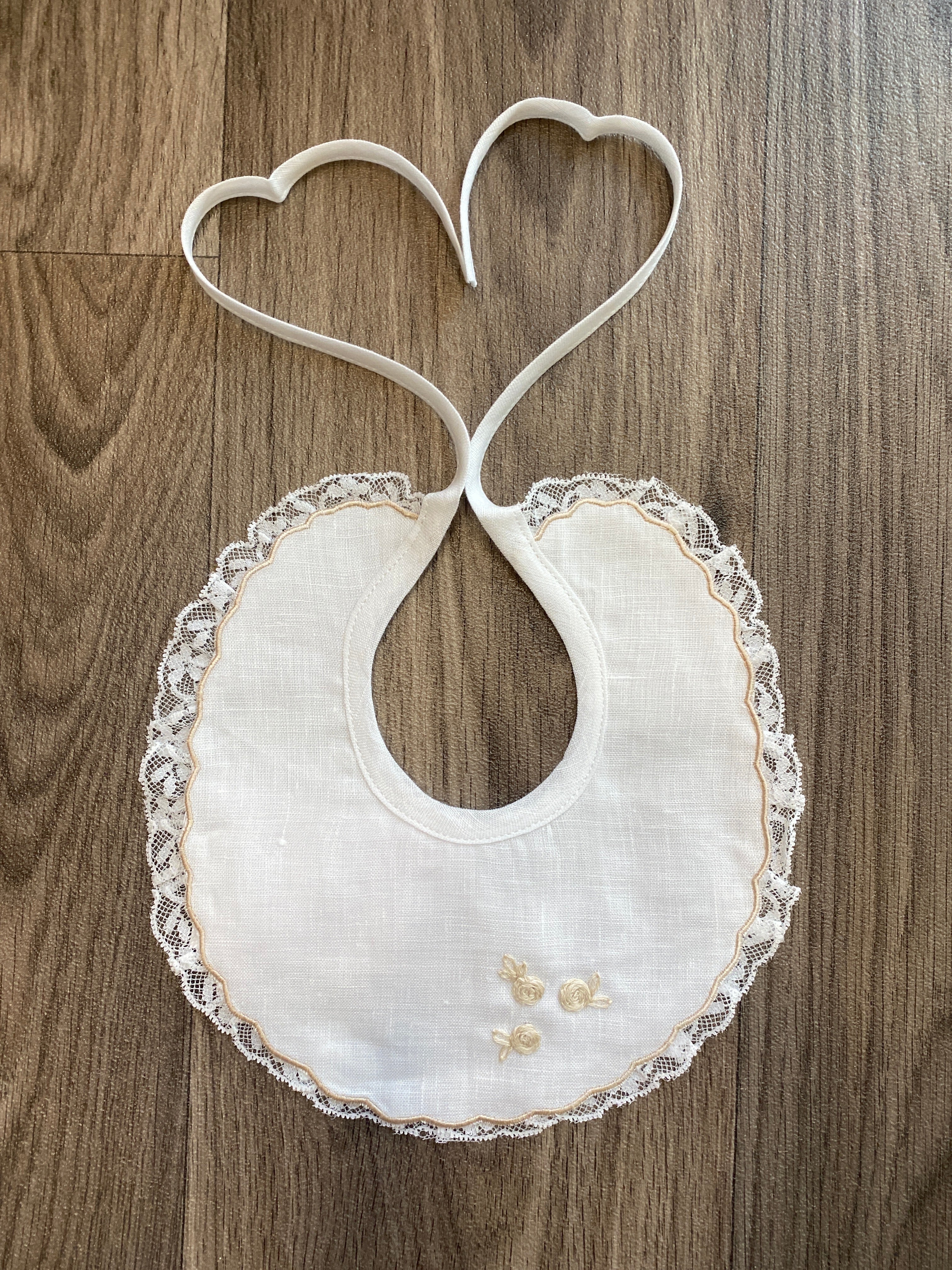 Questa bavetta in lino con ricamo e pizzo valencienne è perfetta per i neonati. Il lino è un materiale naturale e traspirante, ideale per la pelle delicata dei neonati. Il ricamo a mano di roselline aggiunge un tocco di eleganza e dolcezza. Disegnata e realizzata con cura dalla Sartoria dei Piccoli.