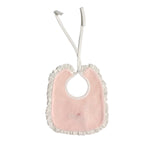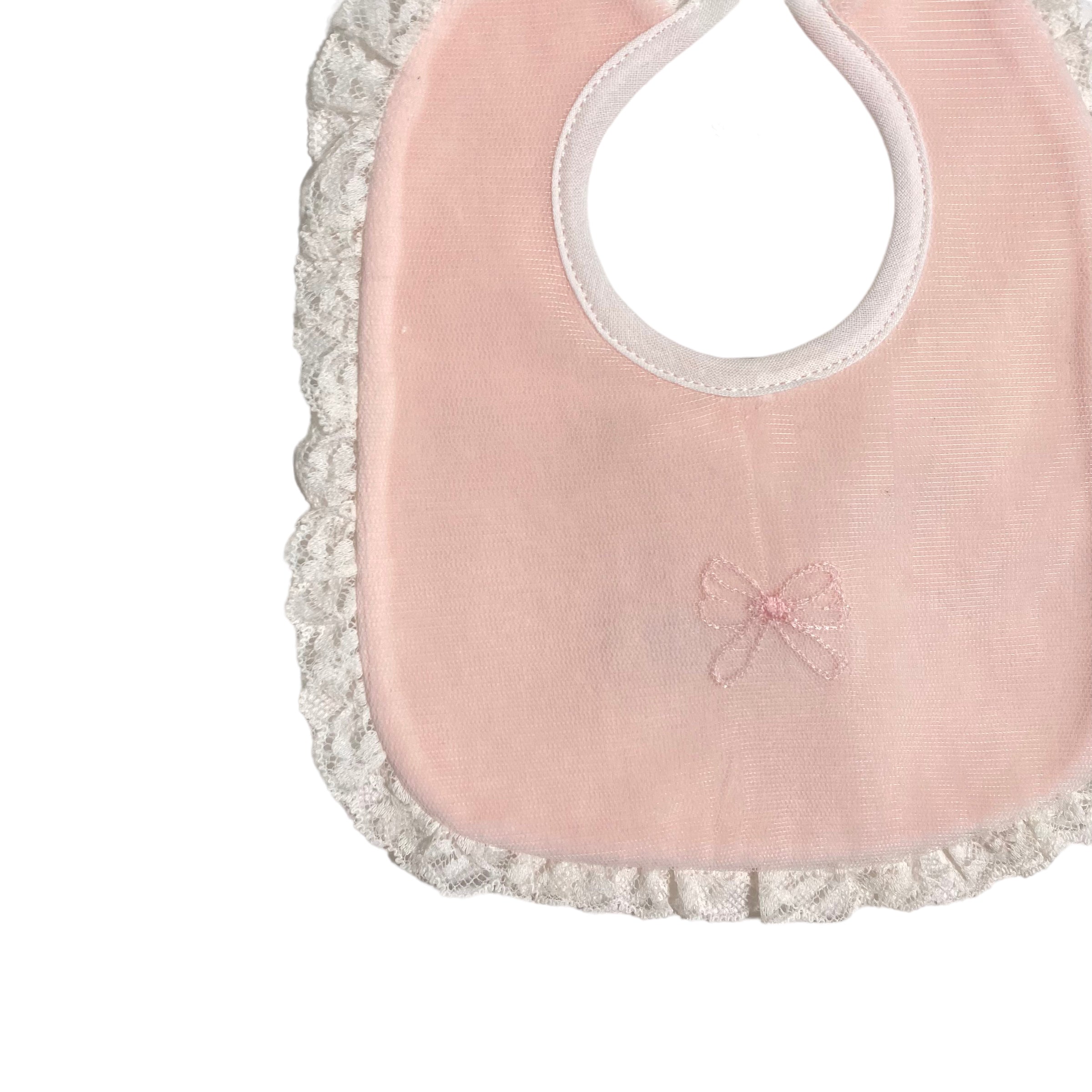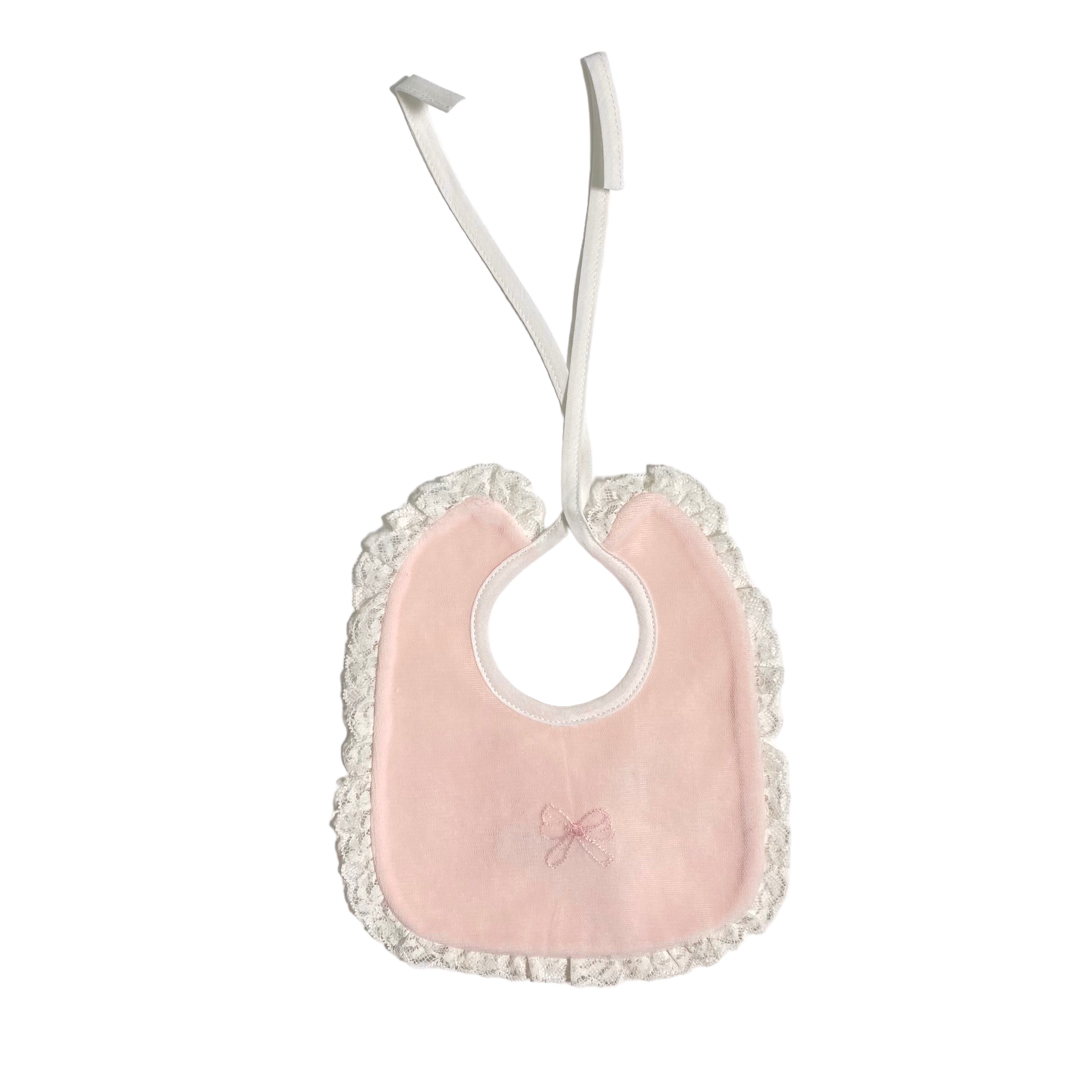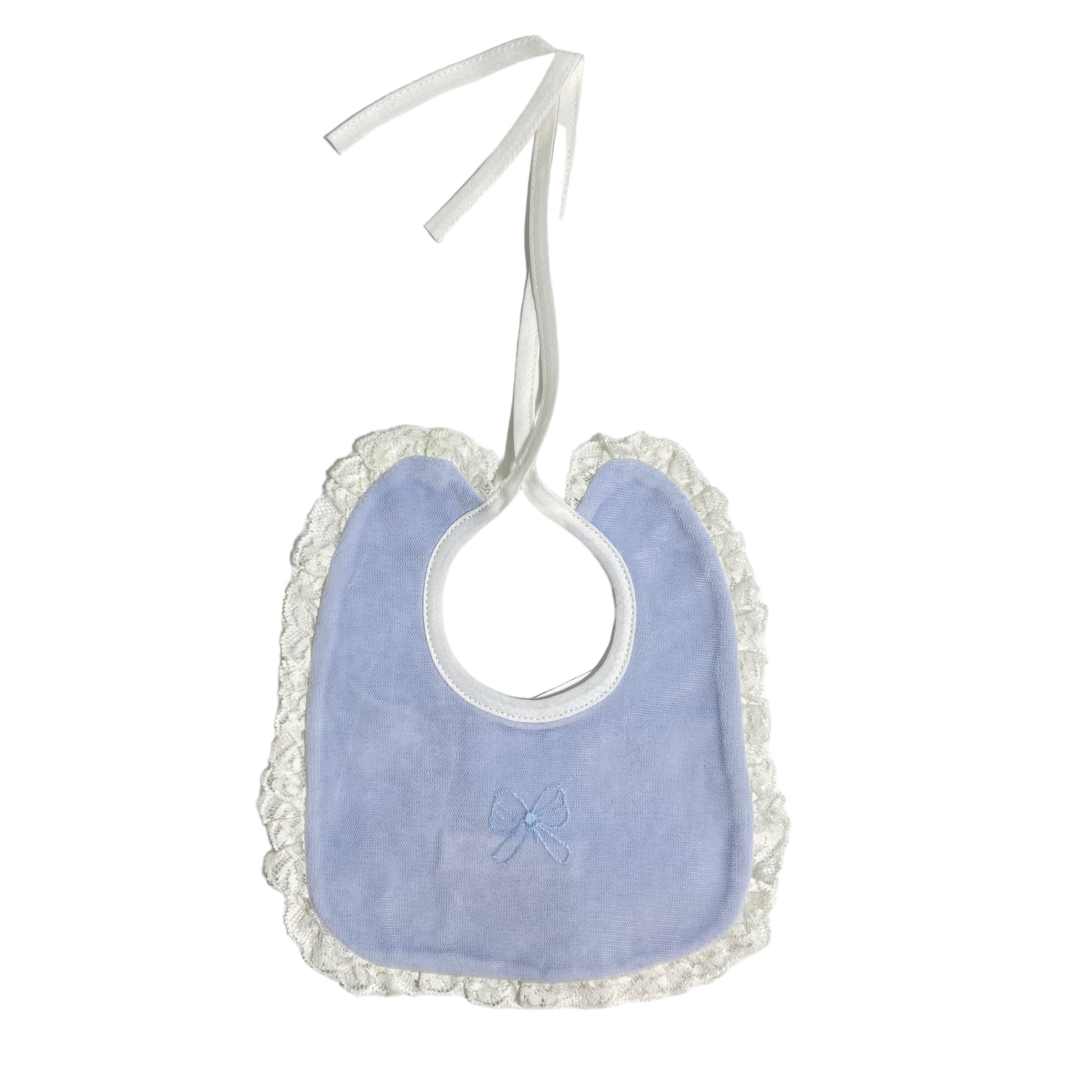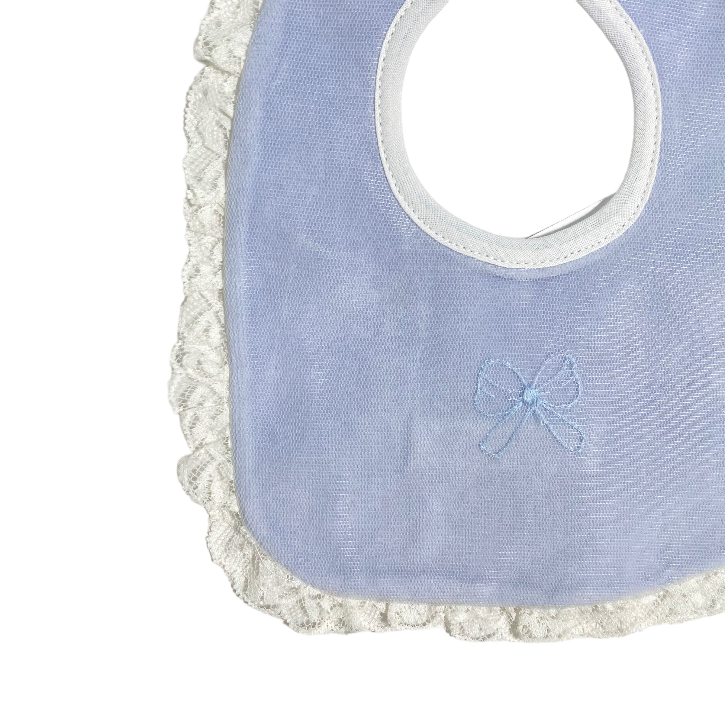 Bavetta in ciniglia con fiocco ricamato(tono su tono) nella parte centrale e bordo rifinito con pizzo panna