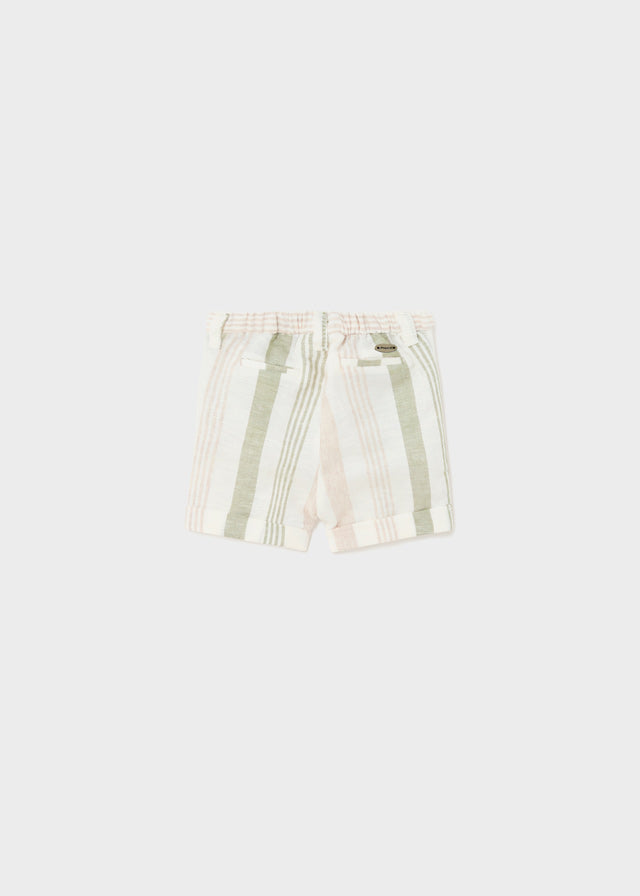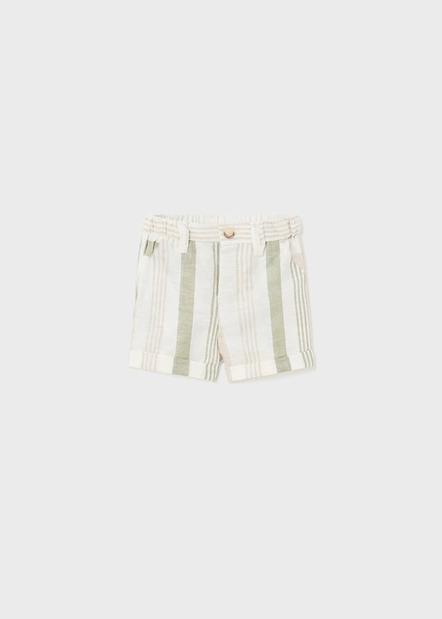 Pantalone corto modello bermuda per neonato. Vita con elastico e chiusura con bottone. Tessuto dall'aspetto fresco e moderno di lino. Finte tasche anteriori e posteriori decorative. Trama a righe.