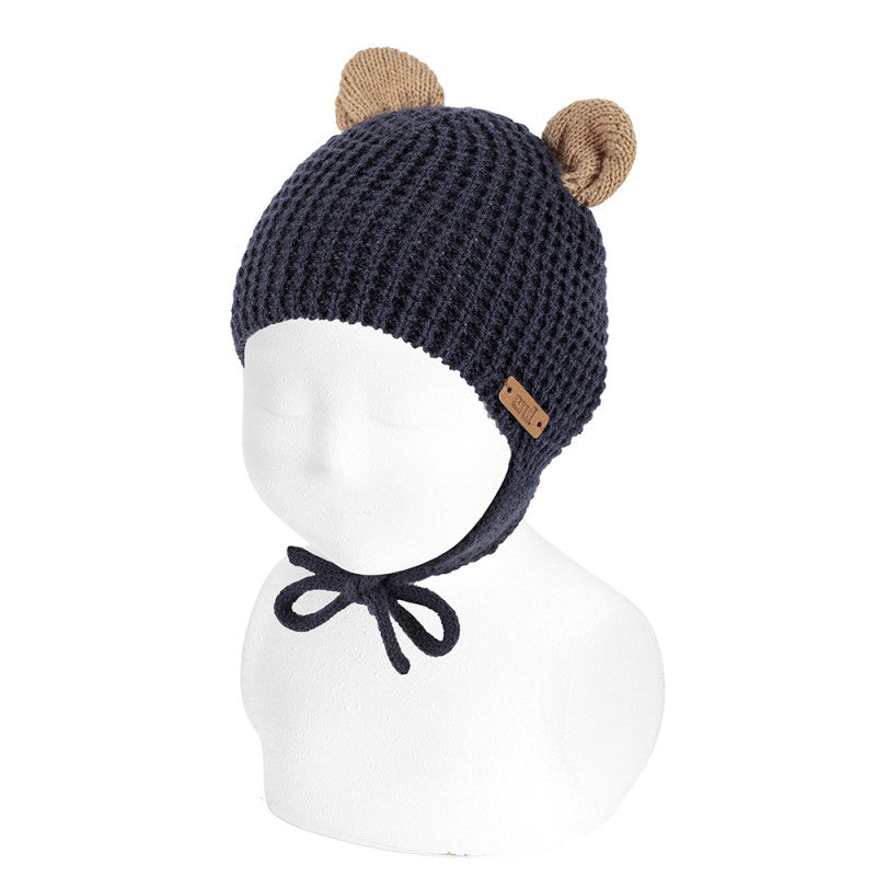 Kindermütze mit Reliefstrick und braunen Ohren.