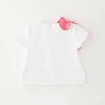 Camicia a manica corta per bambina Sarabanda realizzata in satin 100% cotone con ruches. Apertura dietro con zip invisibile. Logo di strass
