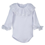 Langarm-Body aus warmer Baumwolle mit Spitzenrüschenkragen und Spitzenapplikation an den Manschetten.