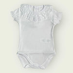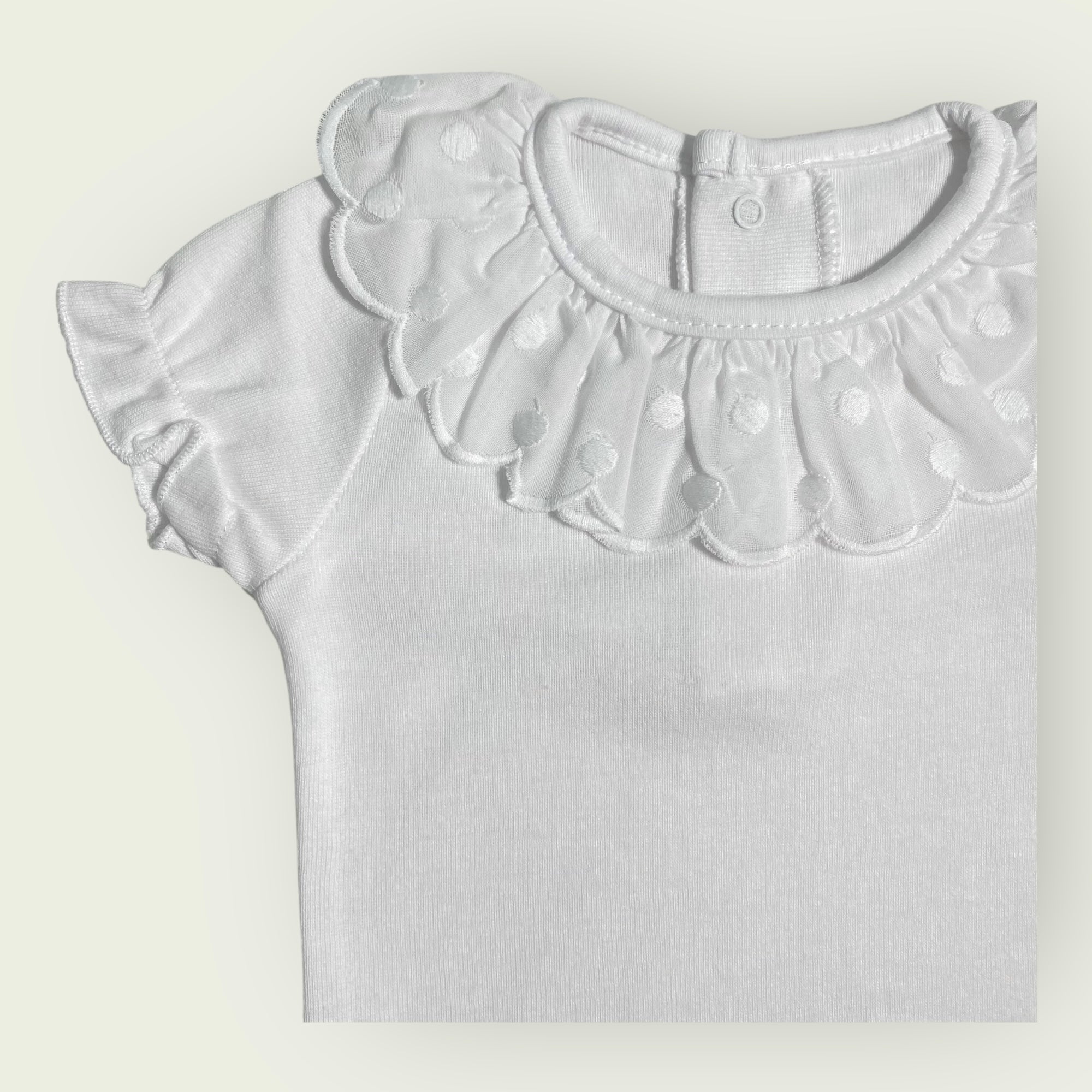 Body mit halben Ärmeln aus weißer Baumwolle. Detail des Ärmels mit der Locke und einer schönen Rüsche am Kragen mit Haltung.