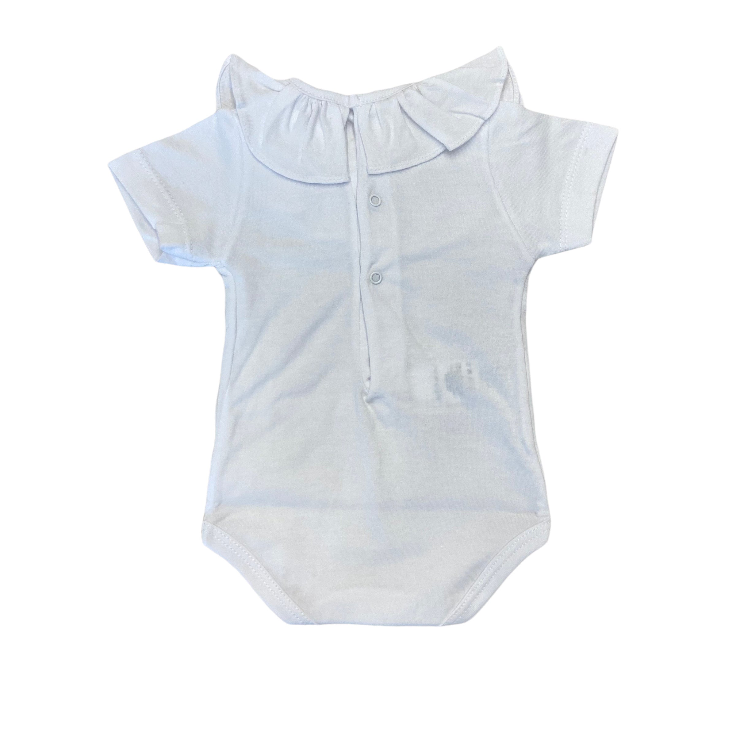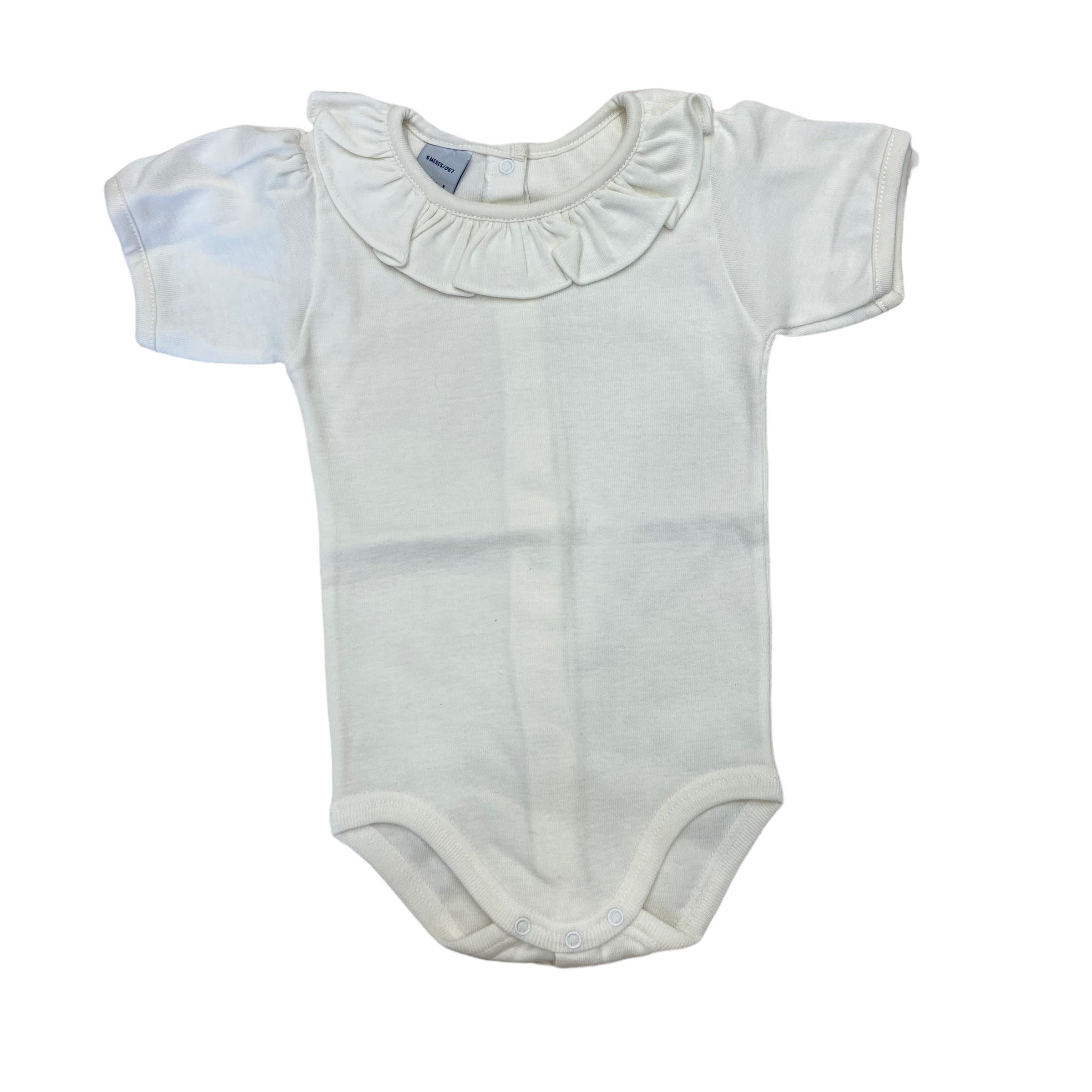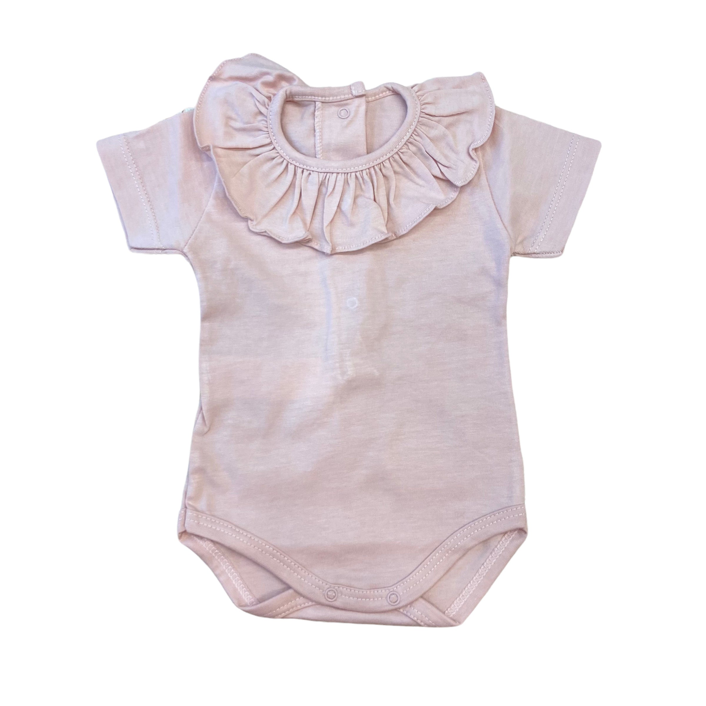 Baumwoll-Bodysuit mit halben Ärmeln in Rosa, Weiß und Creme mit einer schönen Rüsche am Hals.