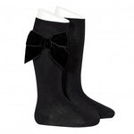 Lange glatt gestrickte Baumwollsocken mit großer Samtschleife.