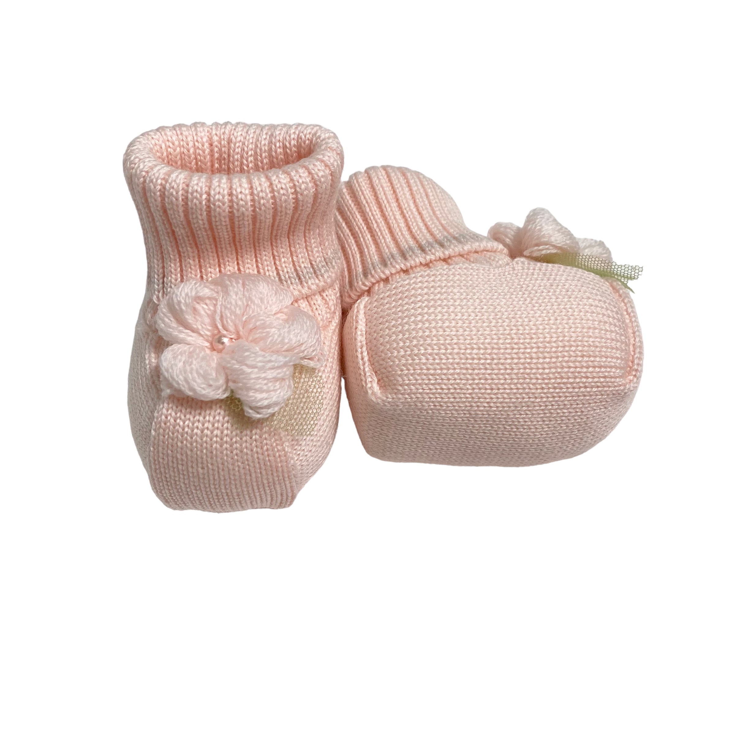 Hausschuhsocken aus 100 % reiner Wolle, einfarbig rosa, mit Wollblumen auf der Vorderseite.
