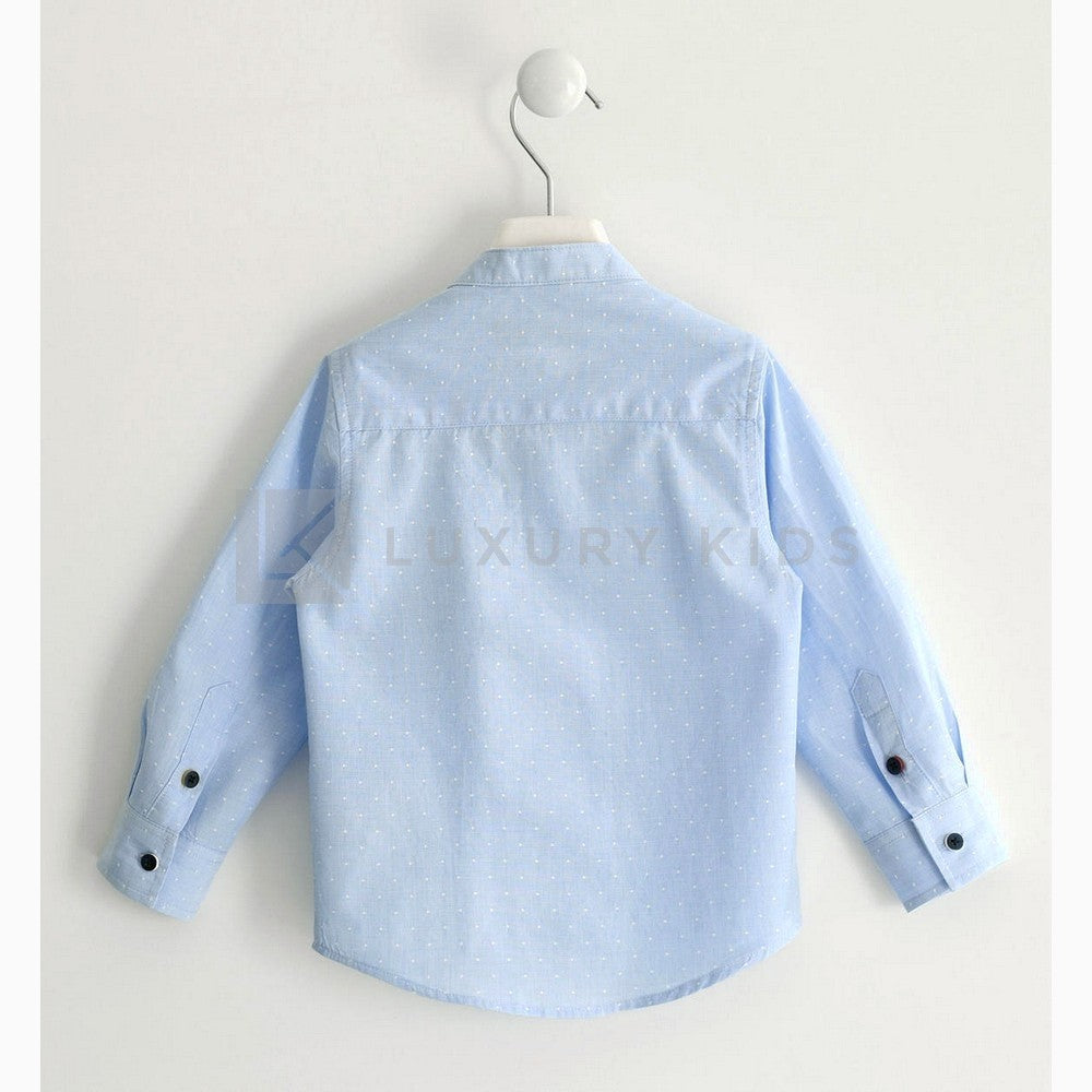 Sarabanda-Hemd aus 100% Baumwolle Fil a Fil. Das Modell hat einen Stehkragen und die Passform ist klassisch. Die Fliege und die Clutch sind aus Stretch-Popeline. Die Fliege hat einen Gummizug, um sie im Knopf des Hemdes zu befestigen, besonders bequem für die Kleinen