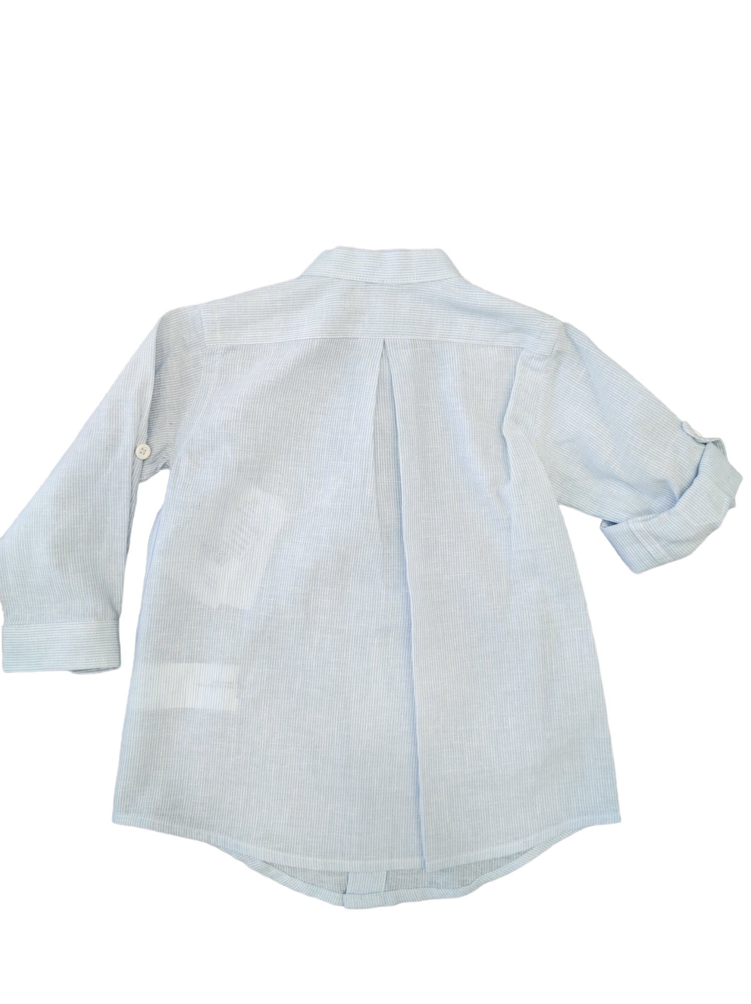 Langärmliges Hemd aus Leinenmischung (kann durch Aufschläge halbärmlig werden), hellblaue und weiße Längsstreifen.
