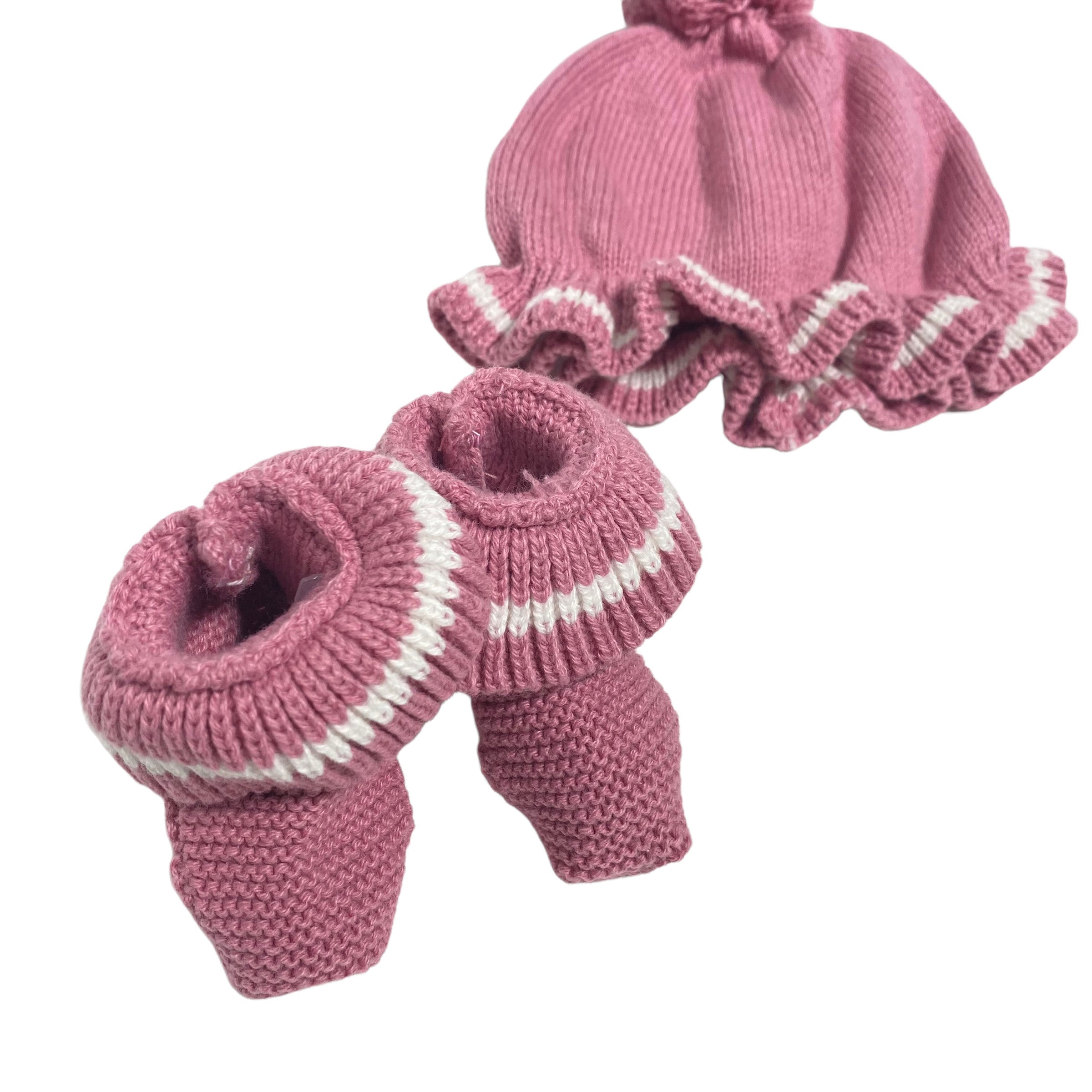 Warmer altrosa Baumwollhut mit Bommeln.