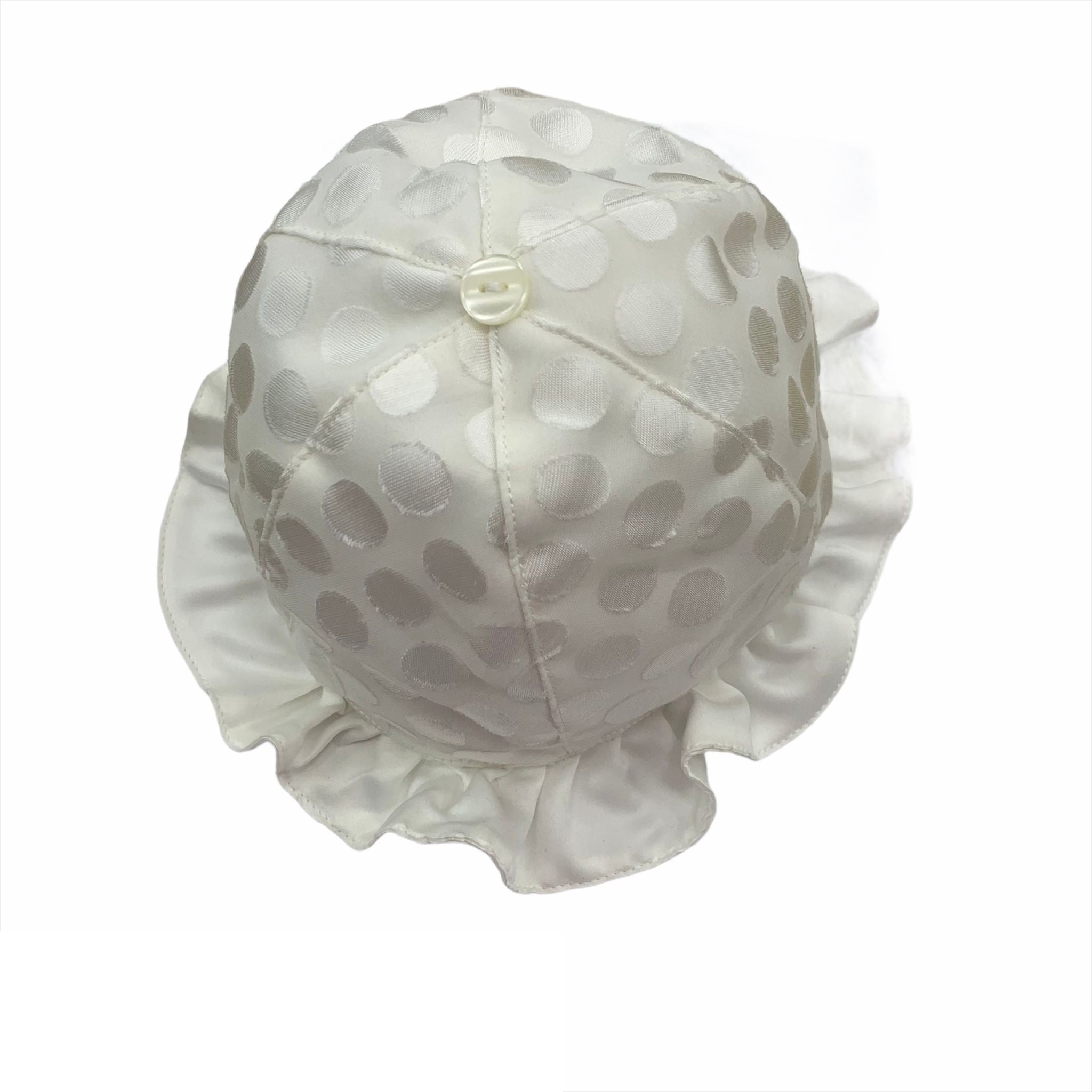 Eleganter Hut aus cremefarbenem Satin, gefüttert mit gepunktetem Organza. Rüschen herum.