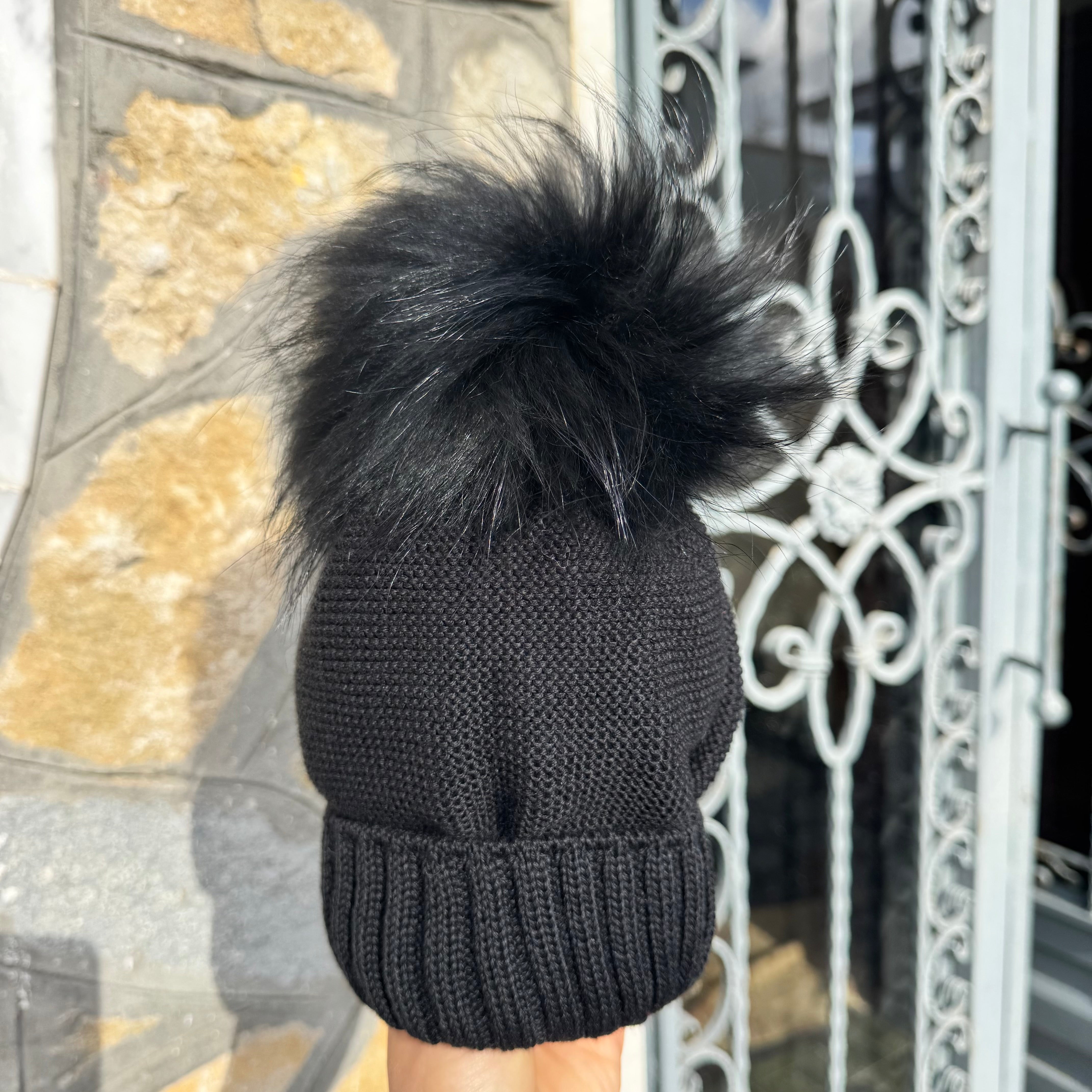 Mütze aus glattem Wollgemisch, mit originaler Pelzmanschette und Bommel.