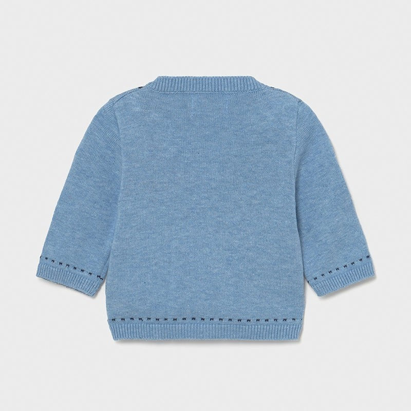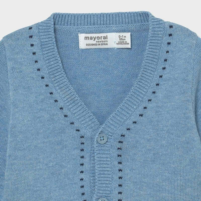 Hellblauer Cardigan aus Baumwollgarn mit V-Ausschnitt und Knopfverschluss, an den Rändern in Blau und an den Taschen bestickt.