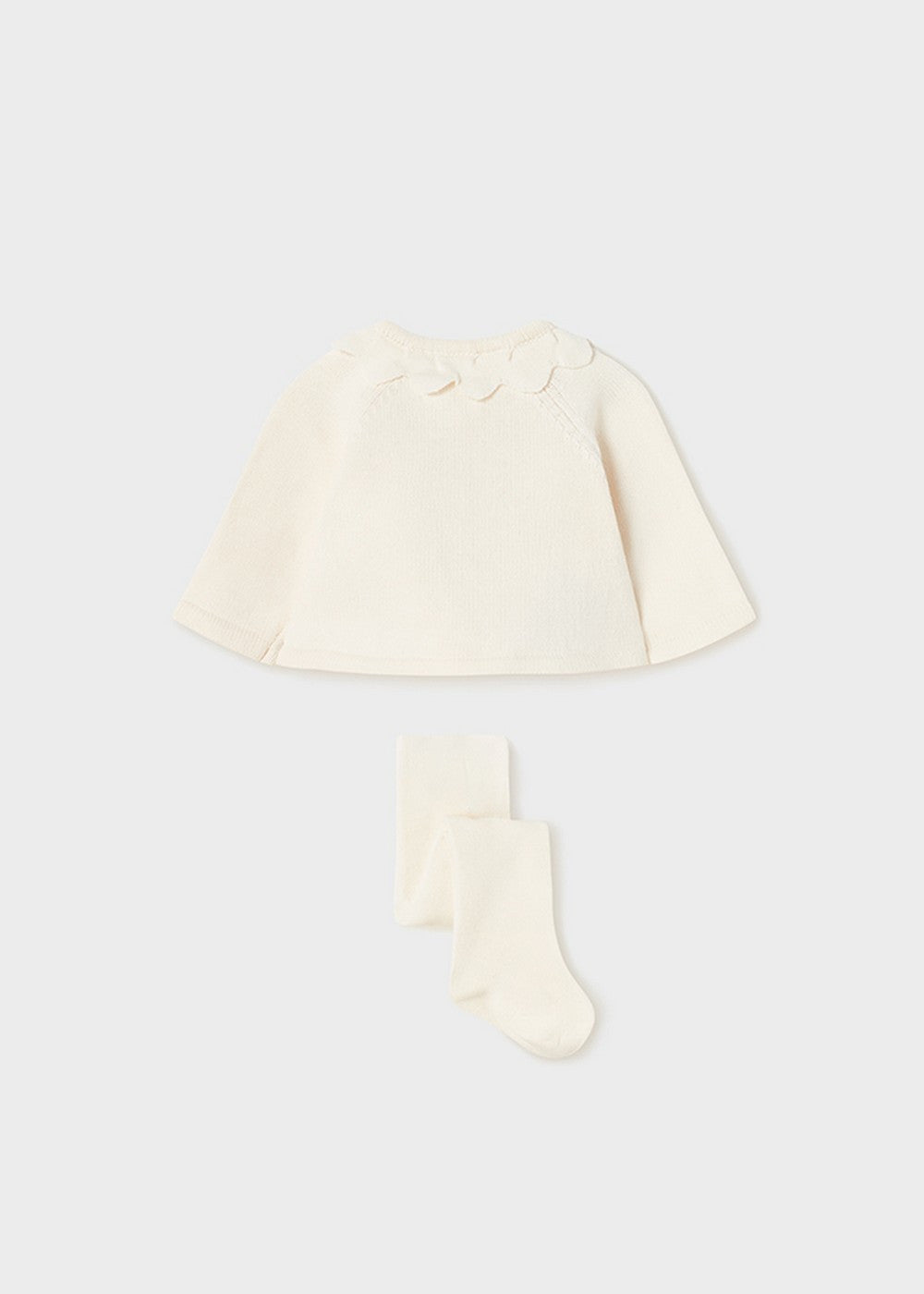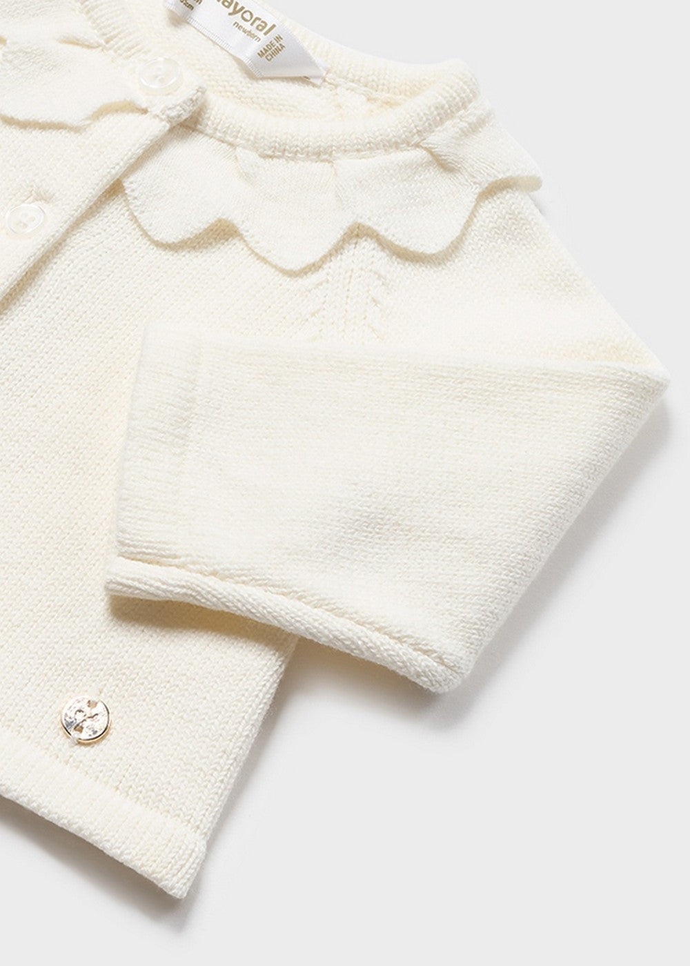 ECOFRIENDS Kleidungsstück enthält Bio-Baumwolle. Langarm-Strickjacke für Neugeborene. Rundhalsausschnitt mit Rüschen. Knopfverschluss vorne.